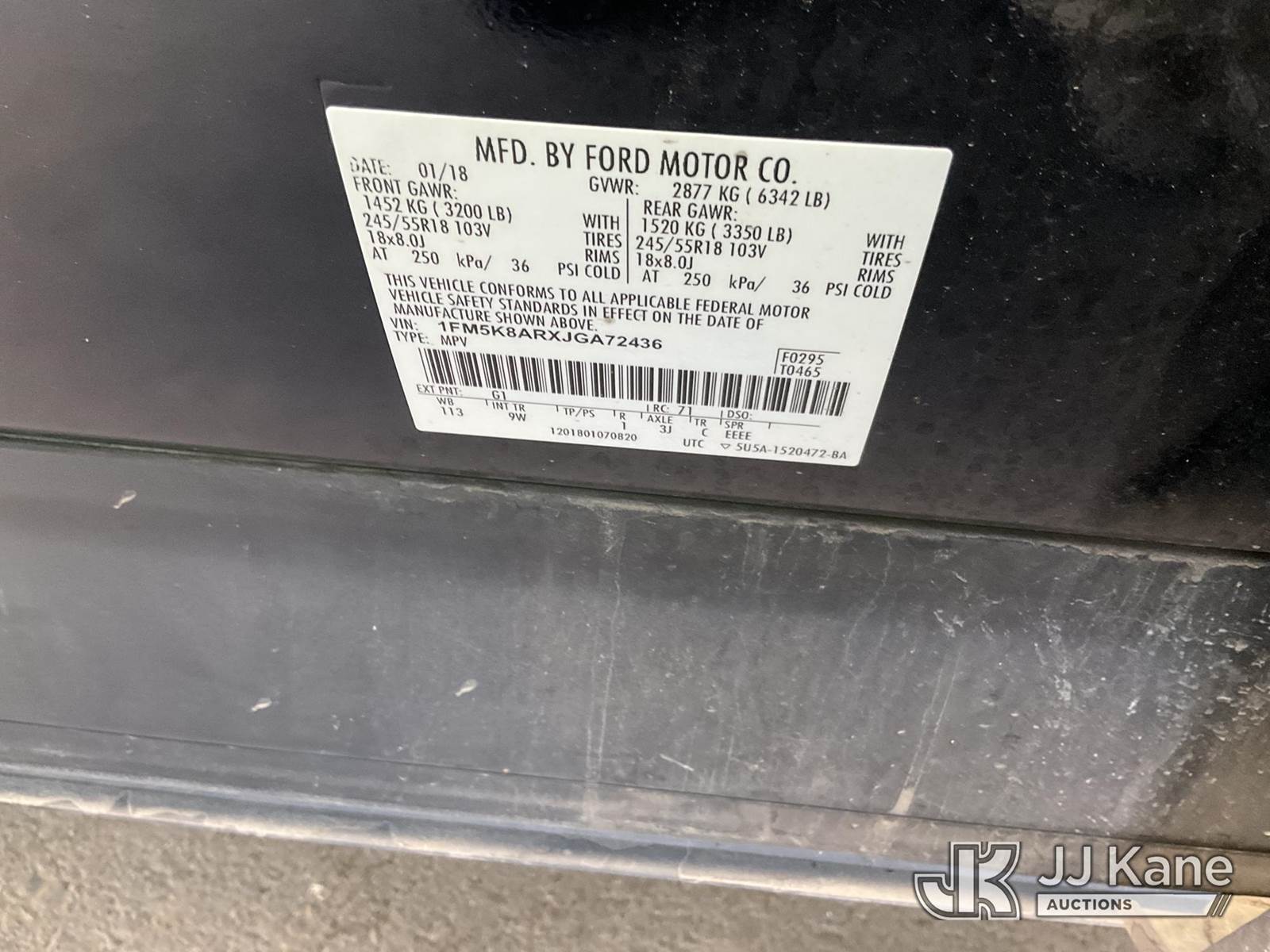 2018 Ford Explorer Police 4WD 4-Door Sport Utility Vehicle, s/n 1FM5K8ARXJGA72436, 3.7L V6 DOHC 24V GAS, 6-Speed Automatic, A/C, (93,951 miles) (Runs & Moves, Missing Side Mirror, Engine Light On, AC Not Cold, Interior Stripped Of Parts, Open Recall, Remedy Not Yet Available, Vehicle is subject to an open NHTSA safety recall related to ON YOUR VEHICLE, THE REAR VIEW CAMERA COULD DISPLAY A BLANK OR DISTORTED IMAGE ON THE CENTER DISPLAY SCREEN WHEN THE VEHICLE IS IN REVERSE. YOU MAY ALSO RECEIVE A MESSAGE THAT THE REAR VIEW CAMERA IS UNAVAILABLE ON THE CENTER DISPLAY SCREEN., but a remedy for this recall does not appear to be available. Dealer is not authorized to perform the recall repair. Periodically contact the manufacturer or check the VIN on the NHTSA website at www.safercar.govivin to determine whether a remedy for the recall is available. As soon as a remedy is available, arrange to have the recall remedied with a dealer from that make of car to make such repair.) (Bidding Restricted to Licensed Vehicle Dealers Only), This is a Titled Item NOTE: This unit is being sold AS IS/WHERE IS via Timed Auction and is located in Jurupa Valley, CA. Inspection & preview days for this unit are the 2 business days prior to the first day of items closing for this auction, item is located at 4510 Muth Way Jurupa Valley, CA 92509 and hours of operations are 8a-4p. For pre-sale questions, please contact please contact Office Staff @ (310) 353-7140. Dealer License Number 45696. (Buyer is responsible for removal. Assistance by consignor or JJ Kane Auctions is not assured.)