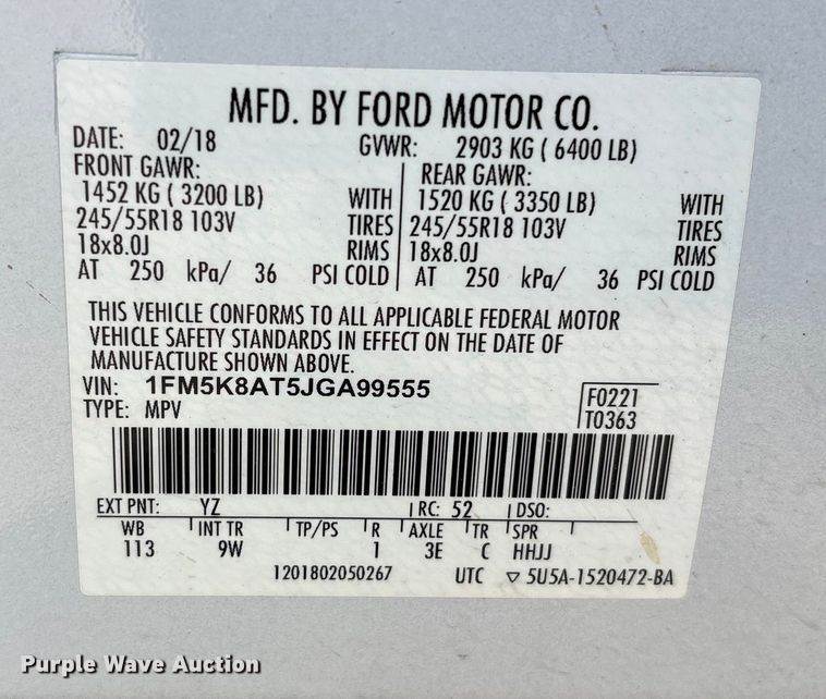 VIN: 1FM5K8AT5JGA99555