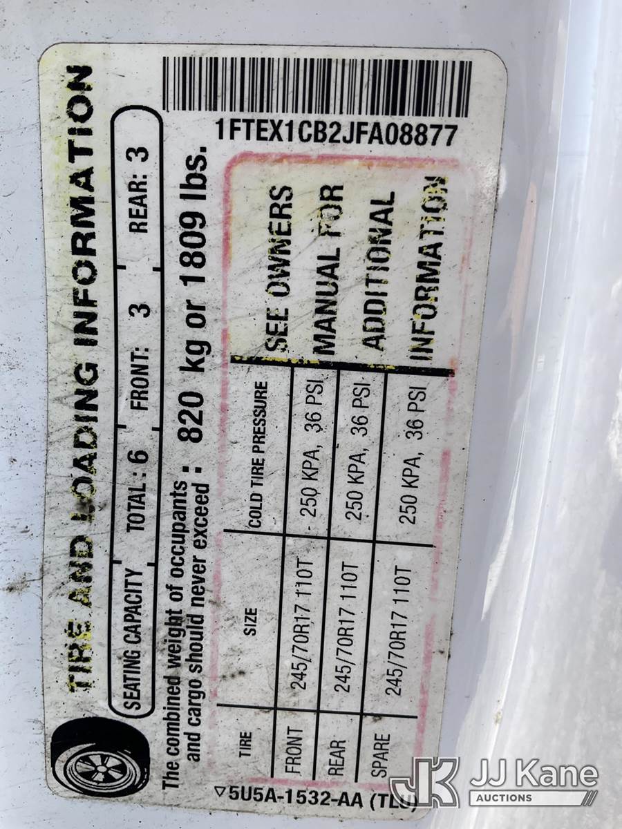 2018 Ford F-150 Extended-Cab Pickup Truck, 3.3L V6 DOHC 24V Automatic, RWD, Gas, A/C, (81,782 miles) (Runs & Moves) (Dashboard Display Cover & Driver Door Handle Broken, Body Dent & Rear Bumper Rust) (FL Residents Purchasing Titled Items - tax, title & registration fees will be collected at the maximum rate of $400.00 under 25,999 and $800.00 for Over 26,000 and $250.00 trailers - Proof of insurance is mandatory; Out of State Residents Purchasing Title Items - tax will be collected based upon your state rate.) (Reads 6,898 hours) This is a Titled Item NOTE: This unit is being sold AS IS/WHERE IS via Timed Auction and is located in West Palm Beach, FL. For Pick Up & Removal information, please contact: Andy Garcia @ 561-215-0085. Removals require 24-hr Notice by Appointment Only, Buyer/Hauler must present copy of Paid-in-Full JJ Kane Release Form upon arrival. Purchaser acknowledges ALL lots must be removed within 10 business days of Auction, or a towing & storage fee may be incurred. (Buyer is responsible for removal. Assistance by consignor or JJ Kane Auctioneers is not assured.)