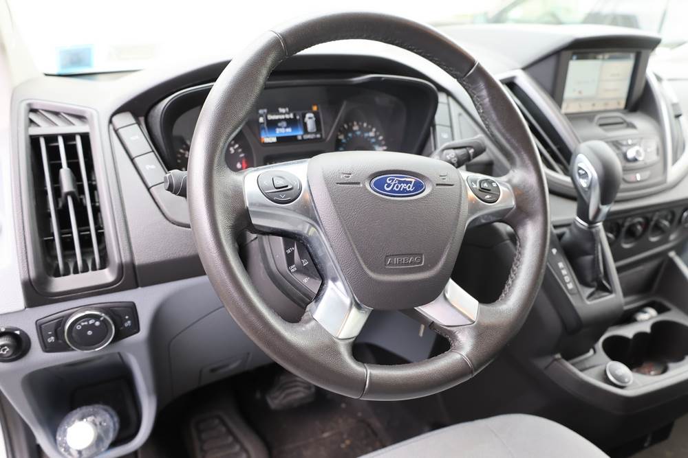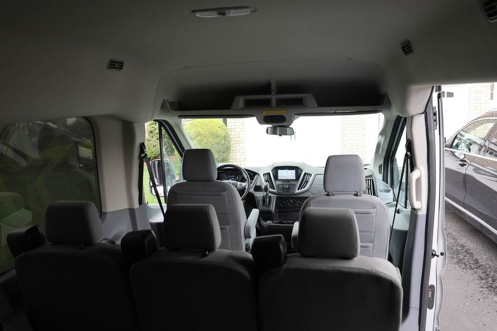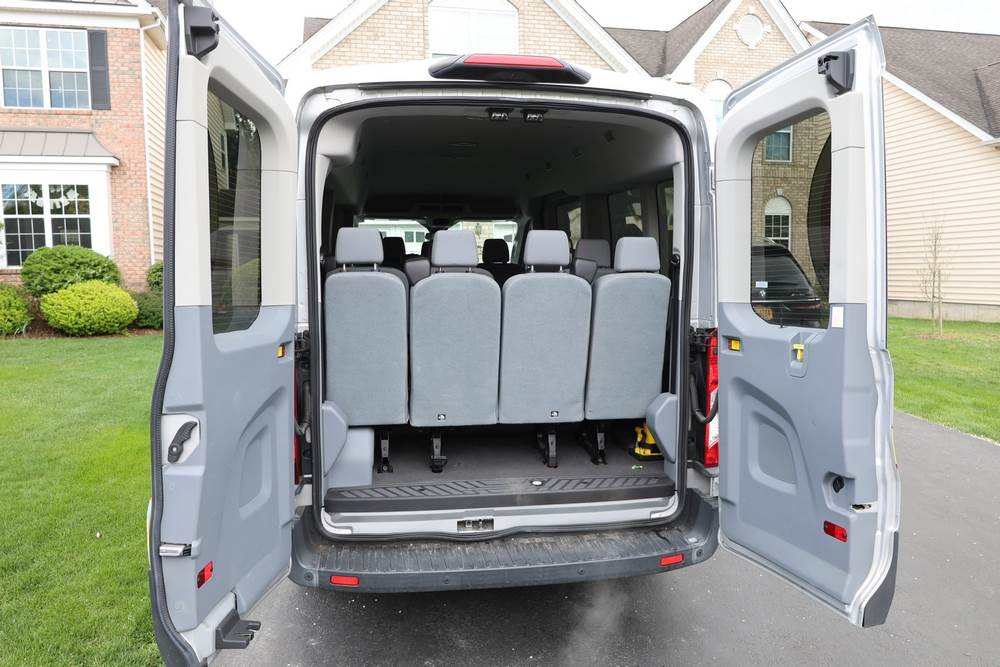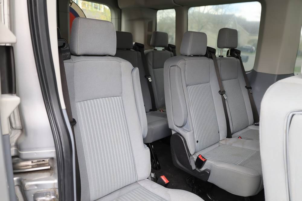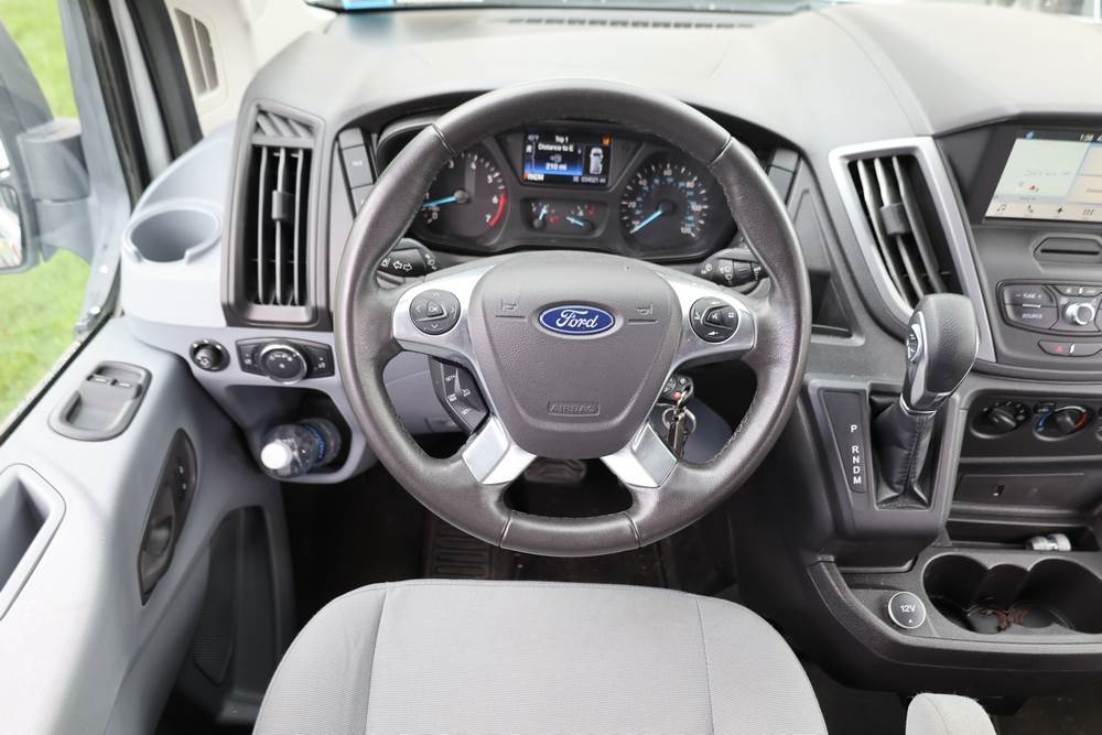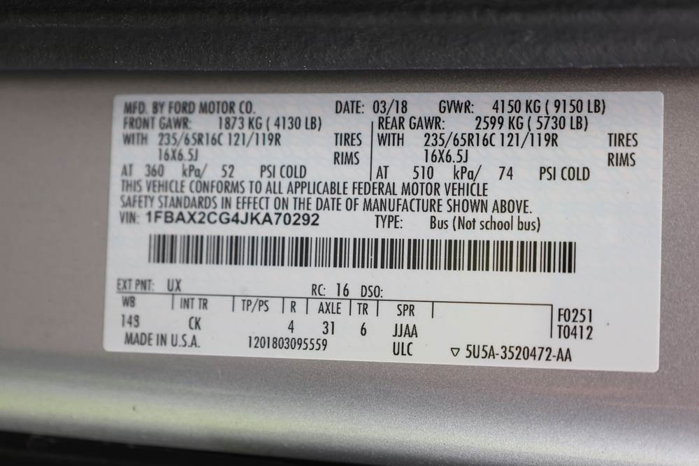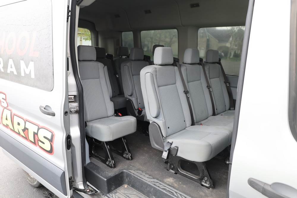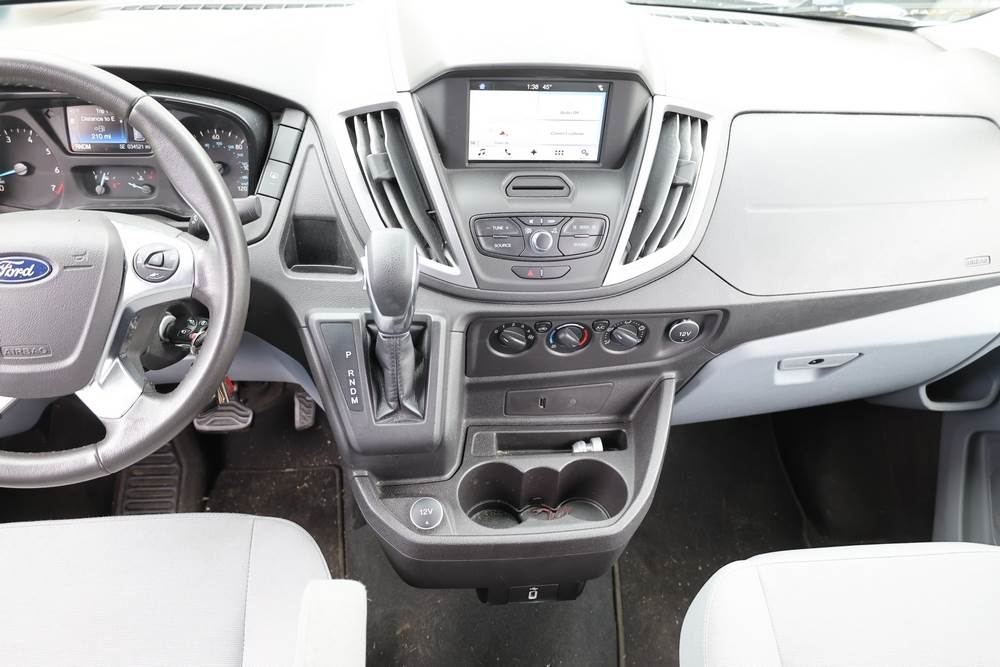 2018 Ford Transit Van 350 Wagon with a 3.5L V6 DOHC 24V engine. VIN: 1FBAX2CG4JKA70292. Odometer reading: 34521. Body: passenger van. Sliding passenger side door; dual rear doors; gray cloth interior with multiple rows of seating; seat belts; steering wheel; center dash with display screen; column mounted gear selector. Runs and drives, title and key available.