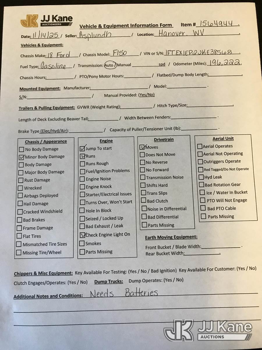 2018 Ford F150 4x4 Extended-Cab Pickup Truck, 6-cyl gas, Auto, A/C, (196,222 miles) (Runs & Moves) (Jump To Start, Check Engine Light On, Traction Control Light On, Needs Battery, Body Damage) (Seller States: Battery Issue, Blown Engine) This is a Titled Item NOTE: This unit is being sold AS IS/WHERE IS via Timed Auction and is located in Hanover, WV. Inspection & preview days for this unit are by appointment only; please contact us at contact@jjkane.com or 84-Go-JJKane for more details. (Buyer is responsible for removal. Assistance by consignor or JJ Kane Auctioneers is not assured.)