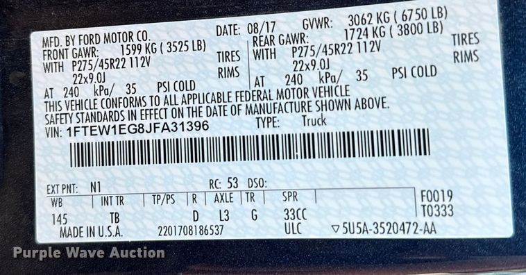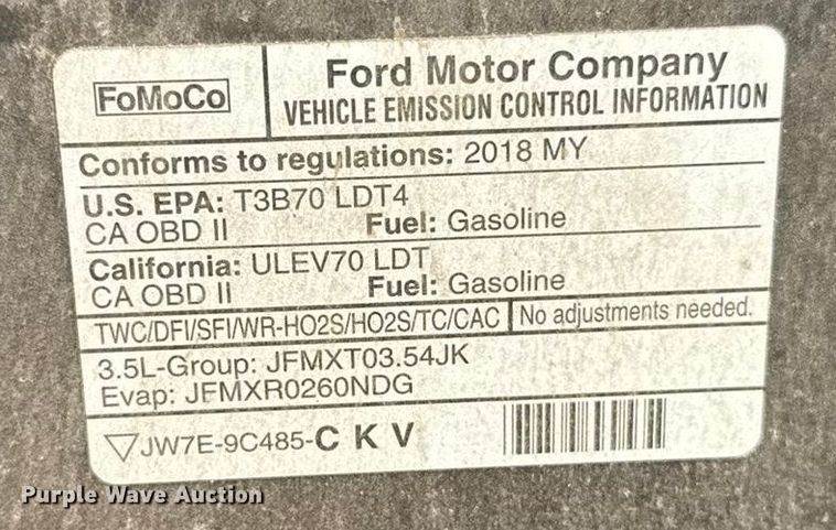 2018 Ford F150 Ext. Cab pickup truck, Miles: 173,169 on odometer, Hours: 9,616 on meter, VIN: 1FTFX1E53JFC81578, Engine, Displacement:...