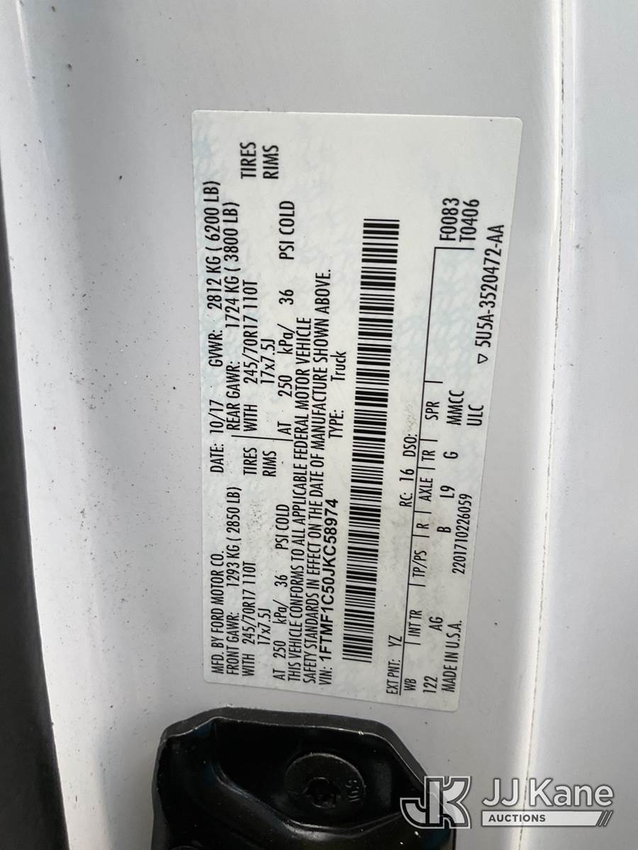 2018 Ford F150 Pickup Truck, s/n 1FTMF1C50JKC58974, 8-cyl gas, RWD, Auto, A/C, with bed cover, (55,869 miles) (Duke Unit) (Runs & Moves, Check Engine Light On) This is a Titled Item NOTE: This unit is being sold AS IS/WHERE IS via Timed Auction and is located in Ocala, FL. Inspection & preview days for this unit are by appointment only; please contact us at contact@jjkane.com or 84-Go-JJKane for more details. For more information & removal arrangements please contact Mike Lessard @ (352) 629-6677. (Buyer is responsible for removal. Assistance by consignor or JJ Kane Auctions is not assured.)