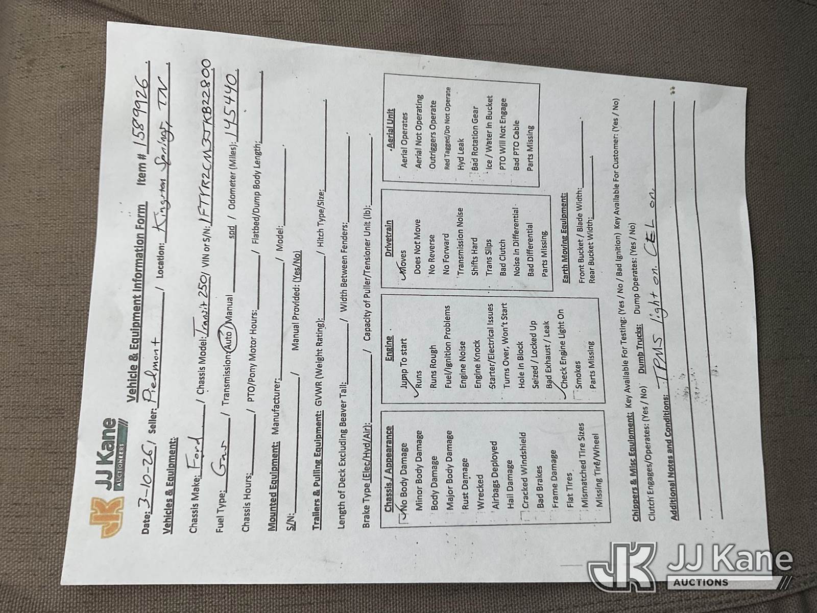 2018 Ford Transit 250 Van Med. Roof w/Sliding Pass. 148-in Van, 3.7L V6 DOHC 24V RWD, CNG Only, 6-Speed Automatic, A/C, (145,440 miles) (Runs & Moves) (Check Engine Light On) This is a Titled Item NOTE: This unit is being sold AS IS/WHERE IS via Timed Auction and is located in Kingston Springs, TN. Inspection & preview days for this unit are by appointment only; please contact us at contact@jjkane.com or 84-Go-JJKane for more details. (Buyer is responsible for removal. Assistance by consignor or JJ Kane Auctions is not assured.)