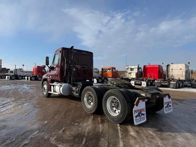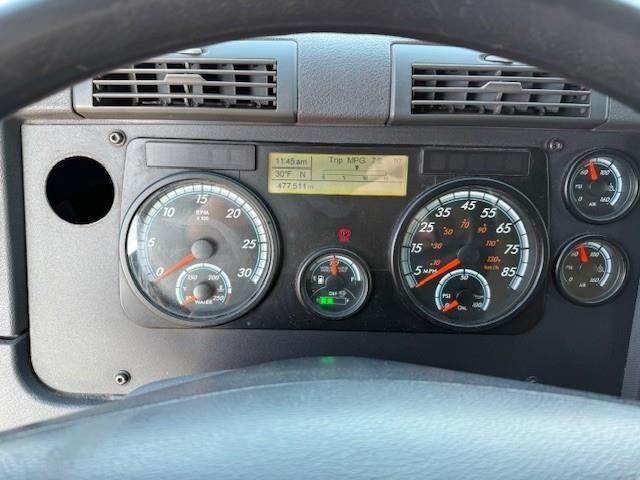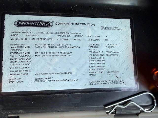 DD15 455 hp, Eaton Fuller RTLO-16913A manual transmission, 46,000# rears, 3.91 rear axle ratio, 205" wheel base, New steer tires, 11R22.5 tires on aluminum wheels, dual 80 gallon fuel tanks, air slide 5th wheel, PTO, fender mirrors, power windows and locks, heated and motorized mirrors, air ride driver seat
