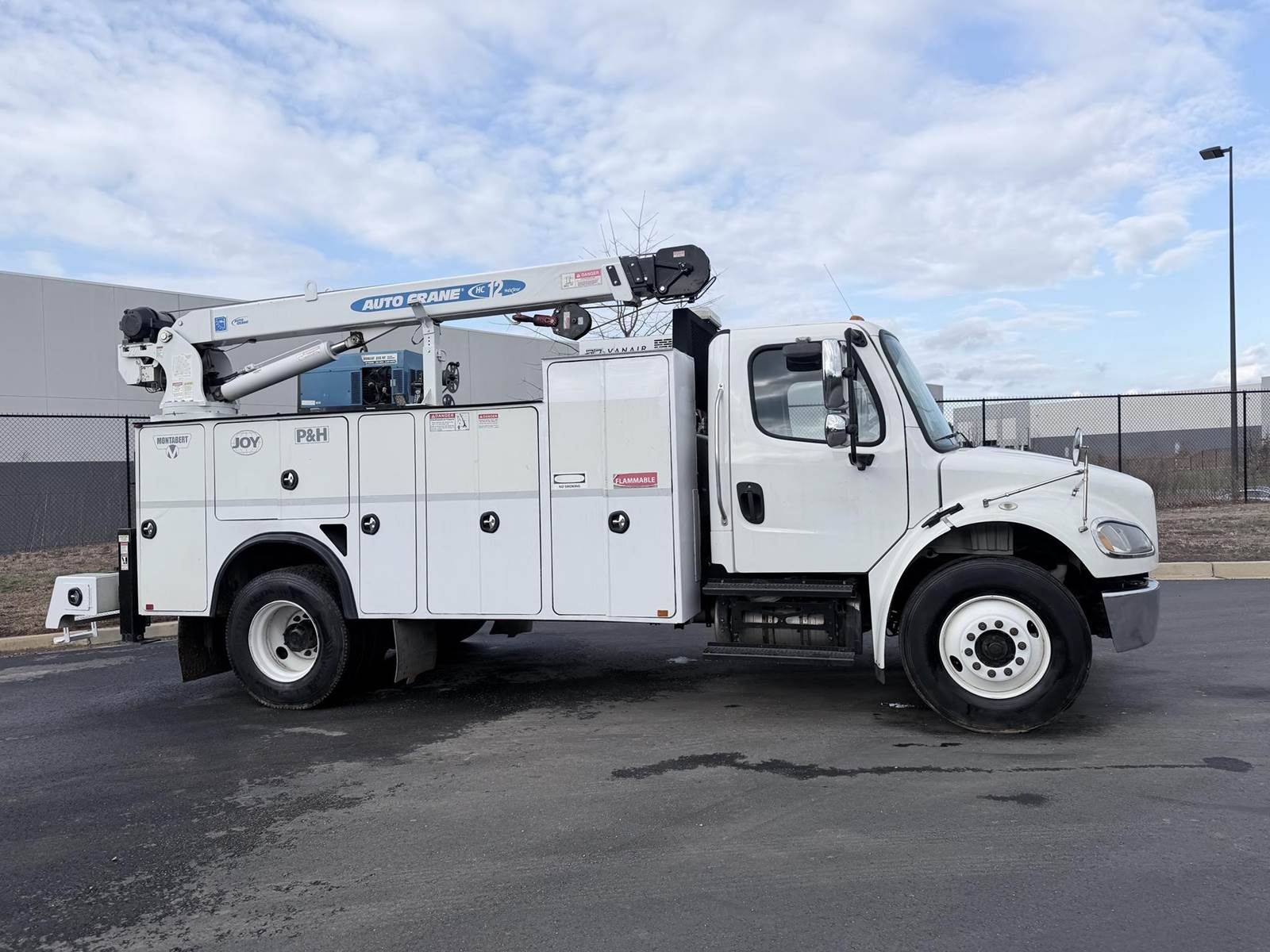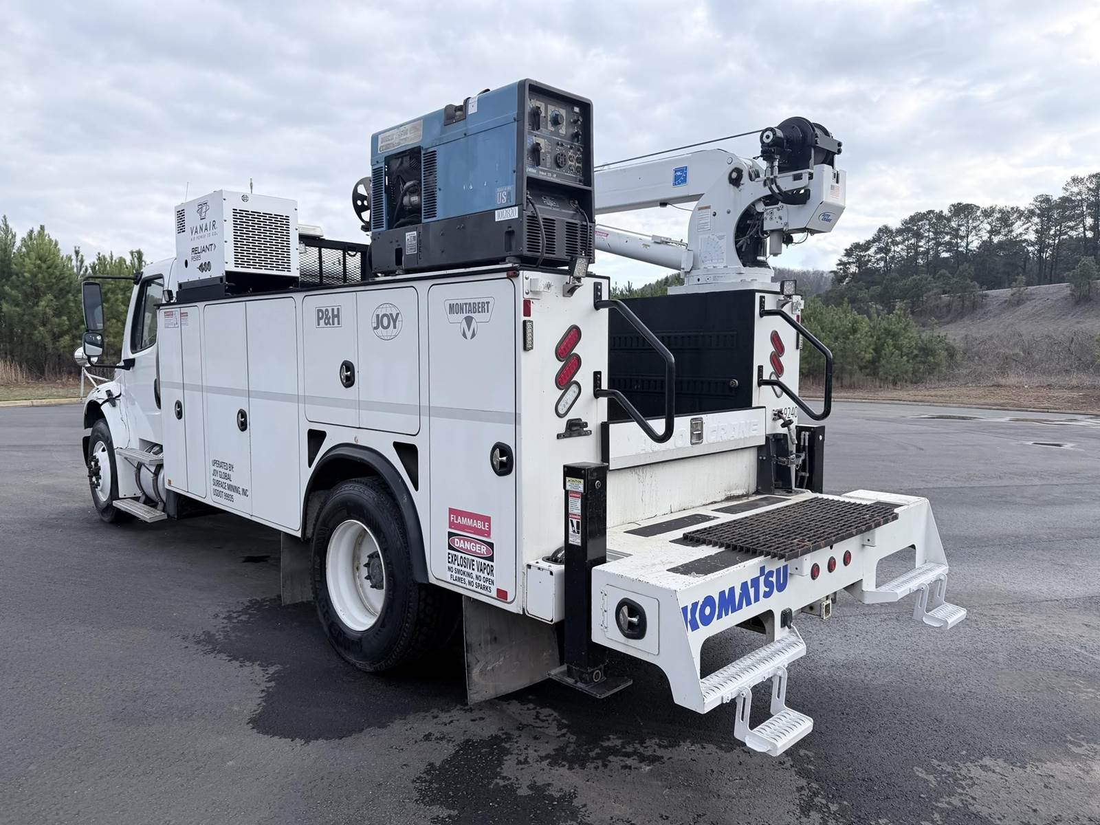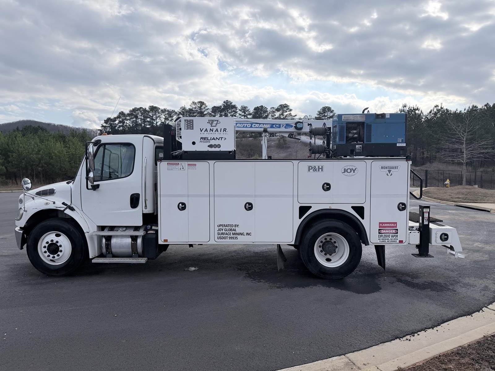 240HP Cummins diesel, Allison automatic transmission, Auto Crane HC12 12,000lb capacity w/ wireless remote, Bobcat 225 NT welder generator 20HP 225 amps 8500 watt generator, Vanair RS85 air compressor w/ 318 hours, We ship nationwide