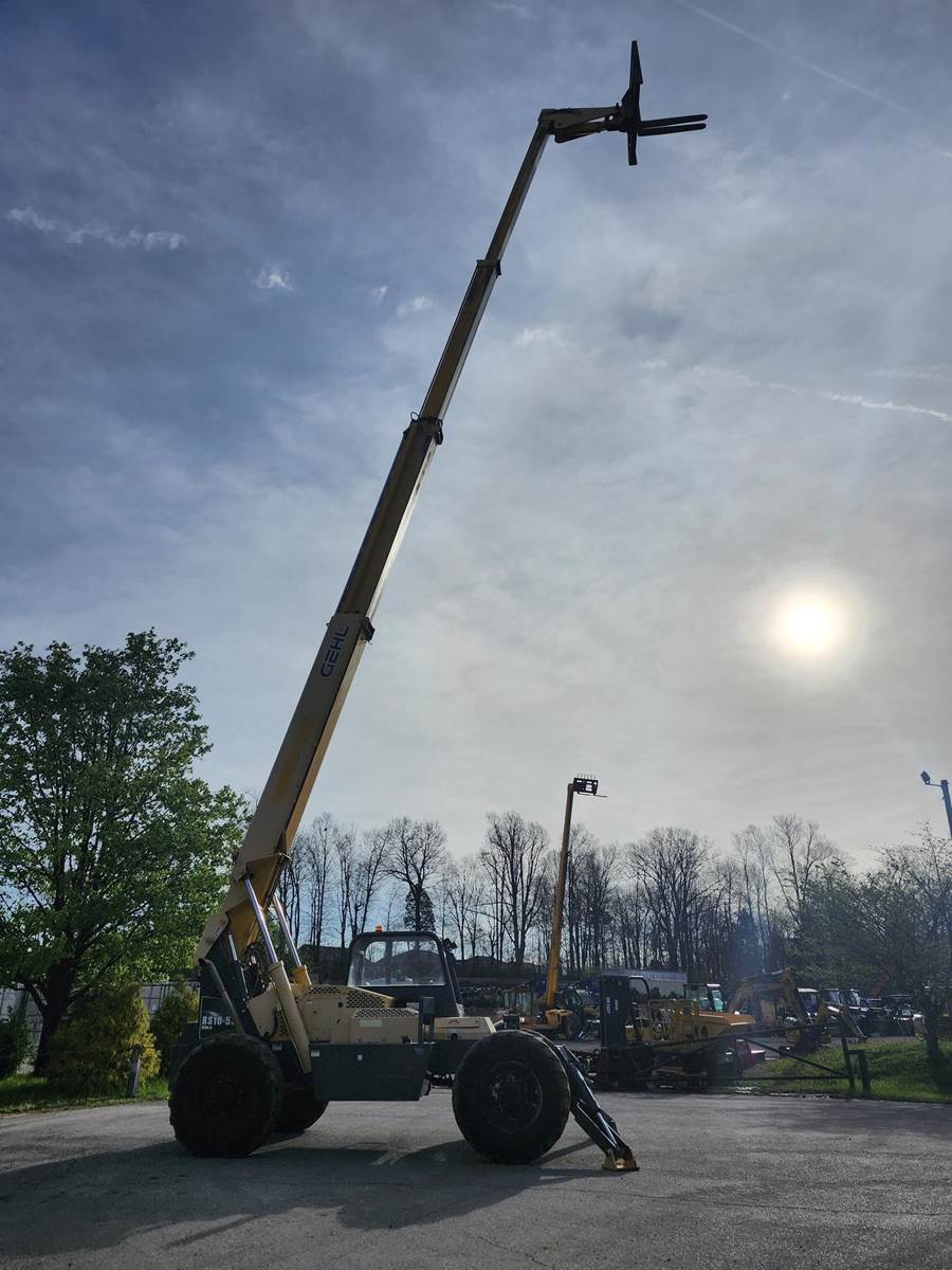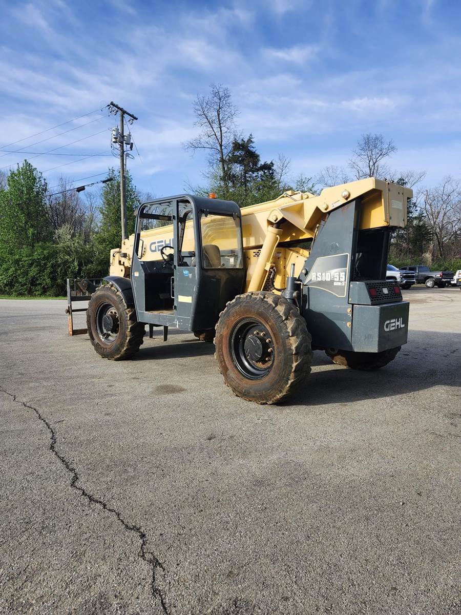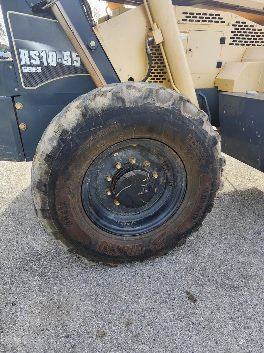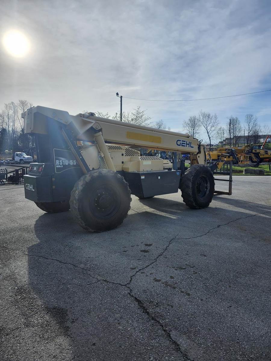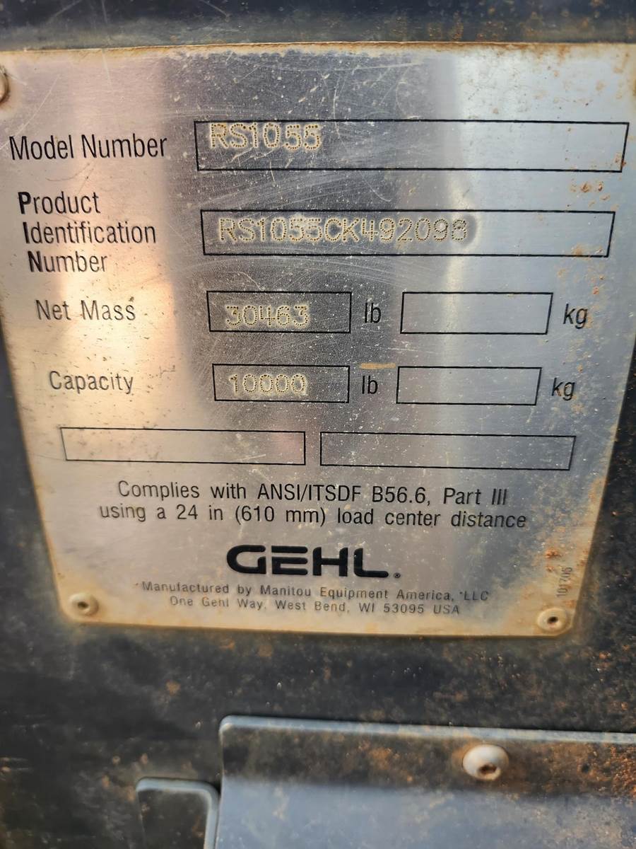 The Gehl RS10-55 is a 10,000 lb. capacity telehandler with a maximum lift height of 55 ft and a max forward reach of 41 ft. Powered by a 120-hp Cummins QSF 3.8 Tier IV engine, it features a Dana 4-speed powershift transmission, 4-wheel drive, and 4-wheel/crab steering