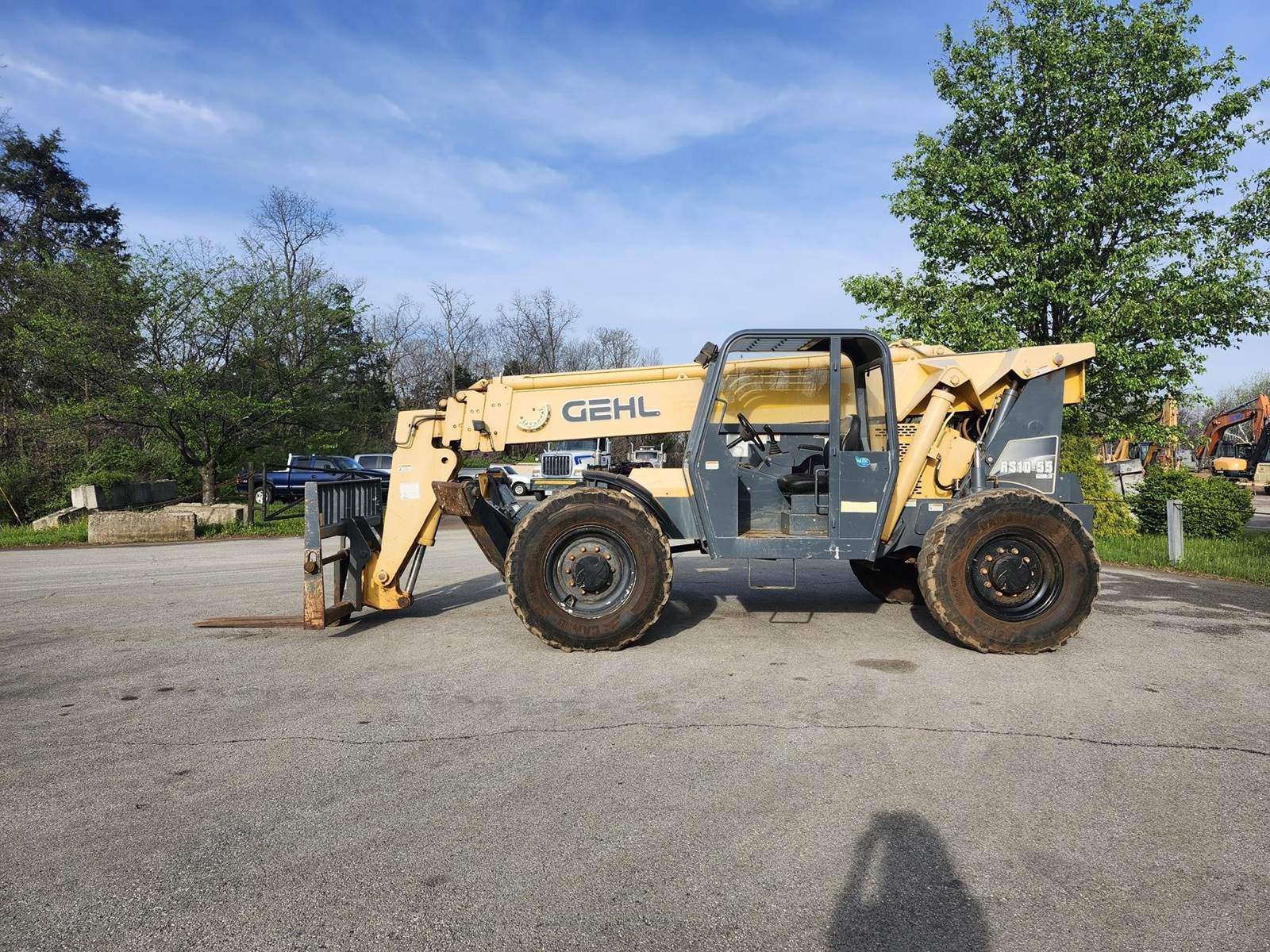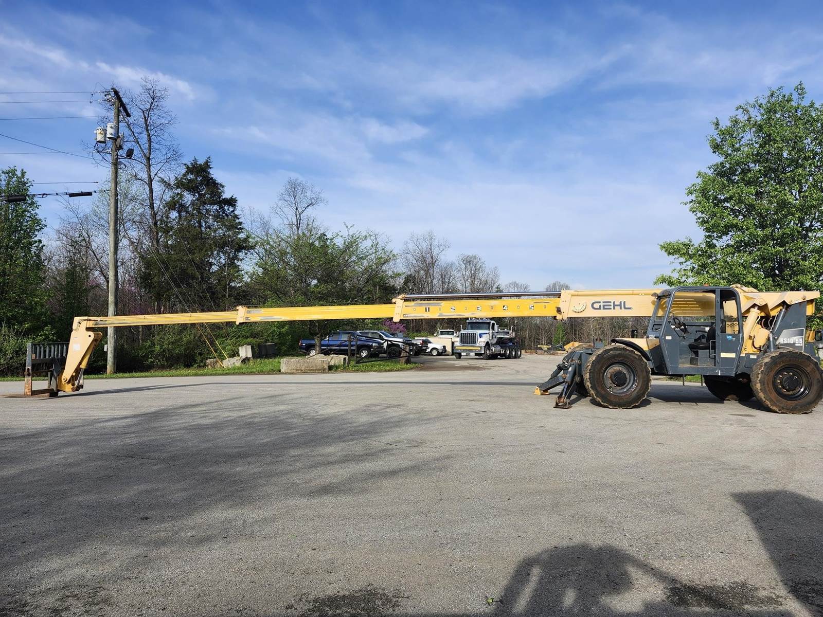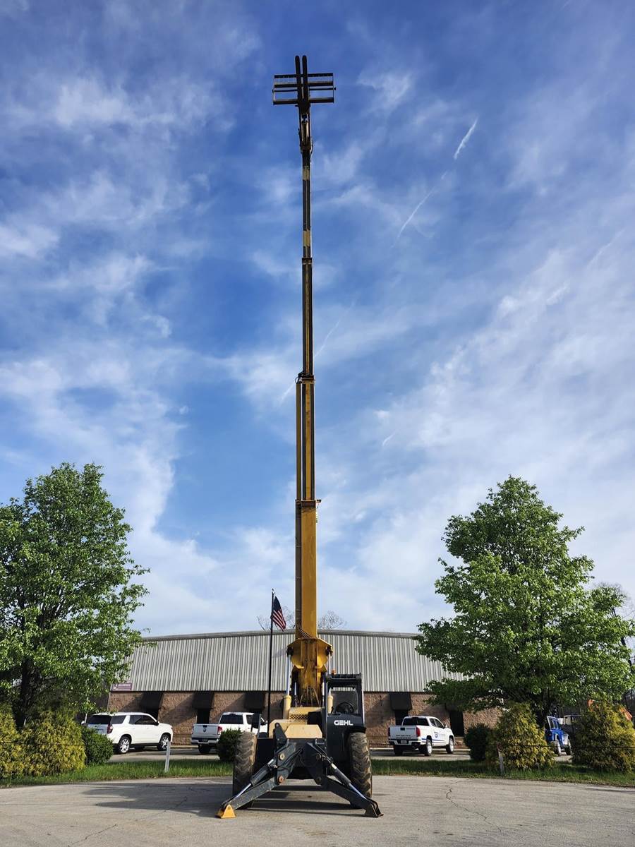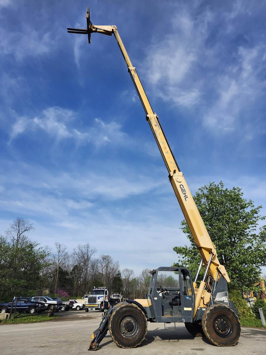 The Gehl RS10-55 is a 10,000 lb. capacity telehandler with a maximum lift height of 55 ft and a max forward reach of 41 ft. Powered by a 120-hp Cummins QSF 3.8 Tier IV engine, it features a Dana 4-speed powershift transmission, 4-wheel drive, and 4-wheel/crab steering