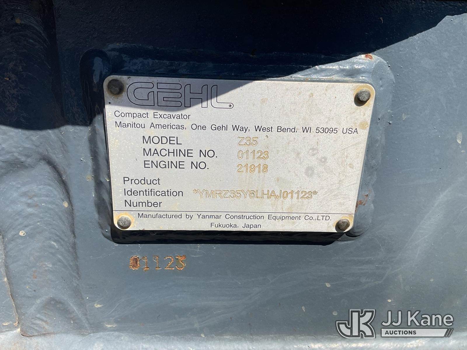 2018 Gehl Z35 Mini Hydraulic Excavator, s/n YMRZ35YGLHAJ01123, diesel, Hydraulic Drive, with rubber tracks, hydraulic backfill blade, 3rd valve & ROPS, (Runs, Moves & Operates) (Reads 1,917 hours) NOTE: This unit is being sold AS IS/WHERE IS via Timed Auction and is located in Sandoval, IL. Please call 24 hours in advance to arrange pickup. Mike Munnelly (417) 496-5889. Buyer responsible for loadout and removal of this asset. (Buyer is responsible for removal. Assistance by consignor or JJ Kane Auctions is not assured.)