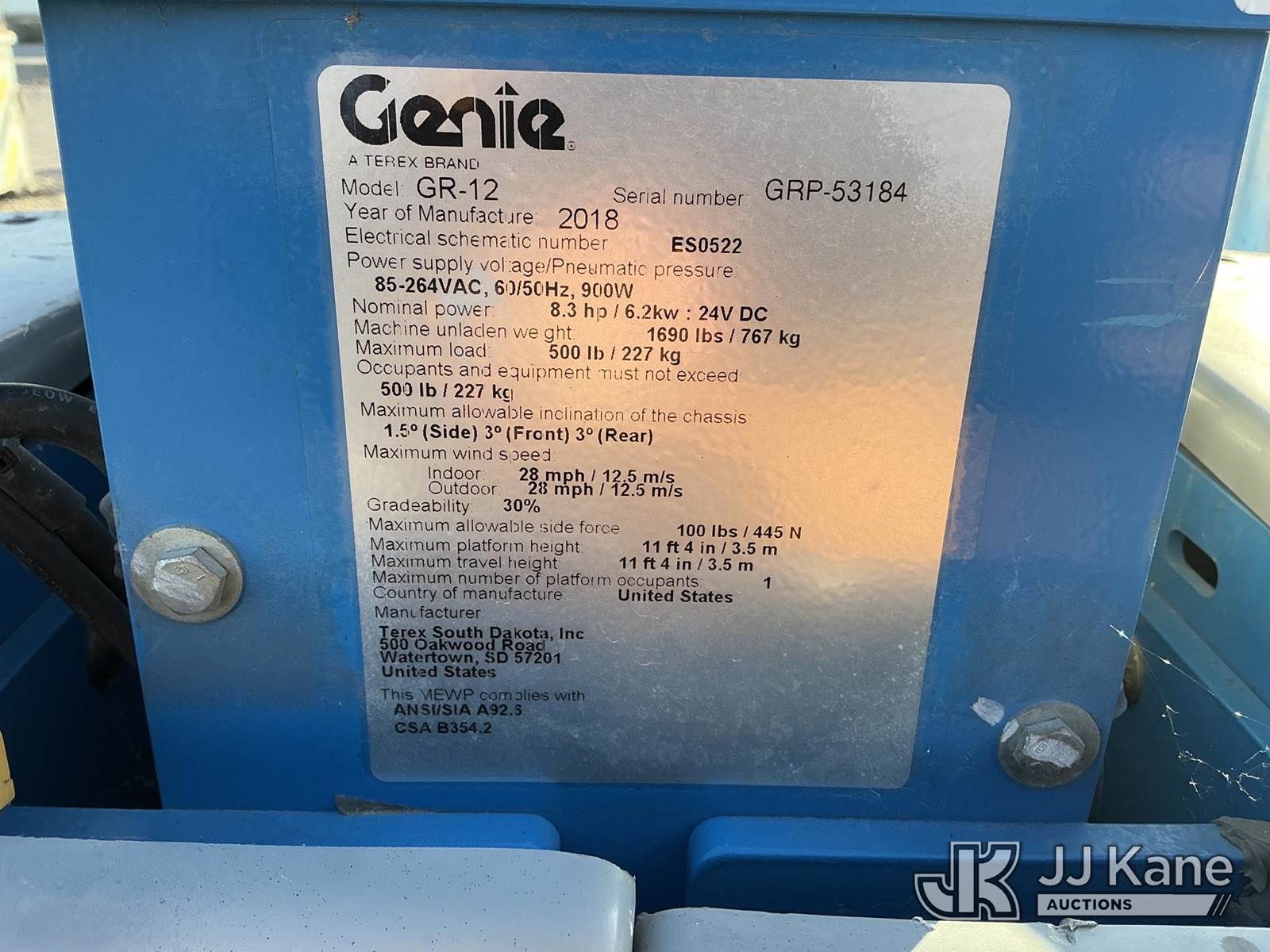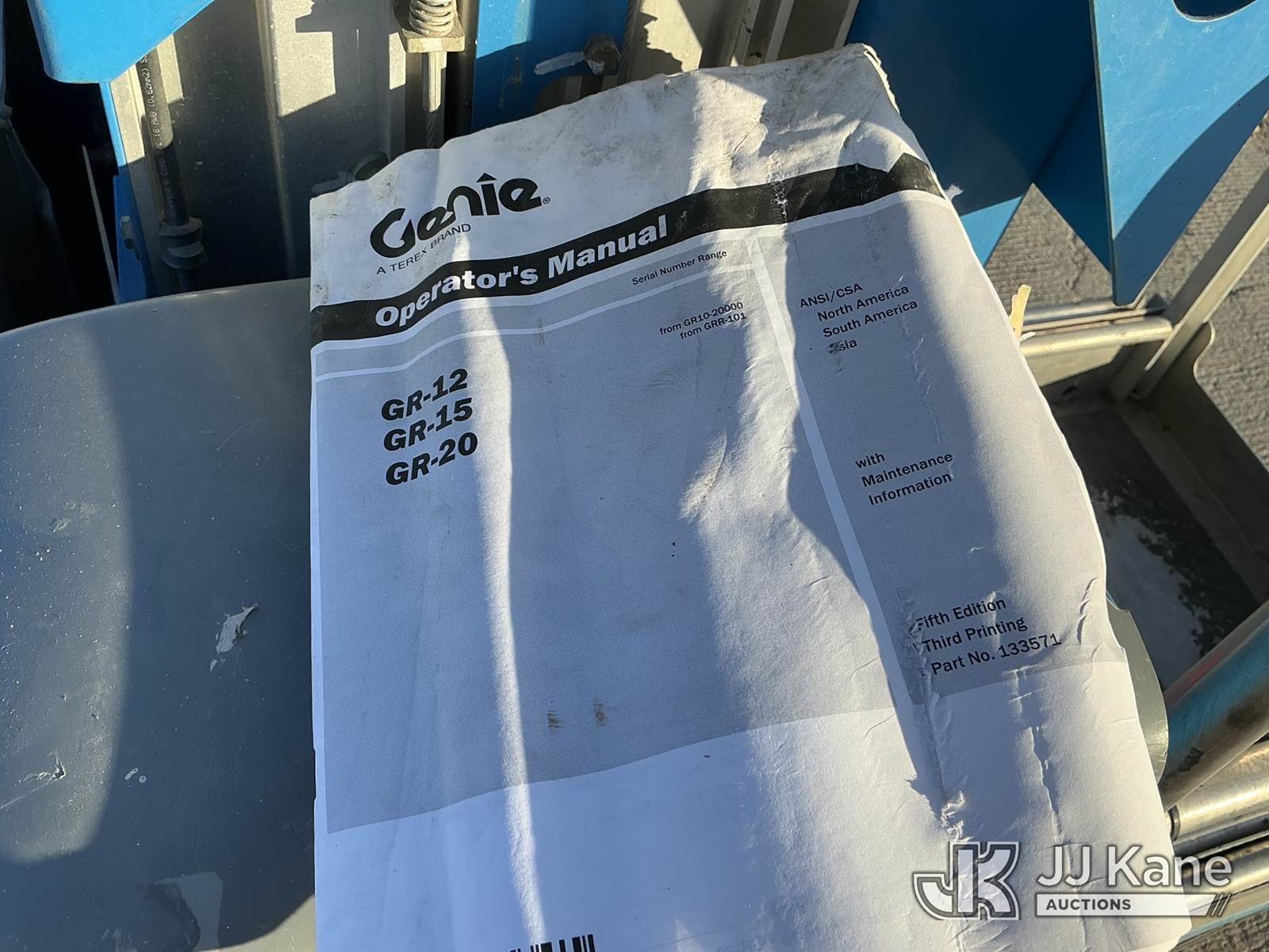2018 Genie GR-12 Self-Propelled Manlift, s/n GRP-53184, electric, (Non Running, Conditions Unknown ) NOTE: This unit is being sold AS IS/WHERE IS via Timed Auction and is located in Dixon, CA. Inspection & preview days for this unit are the 2 business days prior to the first day of items closing for this auction, item is located at 8668 Sparling Ln Dixon, CA 95620 and hours of operations are 8a-4p. For pre-sale questions, please contact JJ Kane Staff at (707) 678-8060 (dixon@jjkane.com). Dealer License Number 45696. (Buyer is responsible for removal. Assistance by consignor or JJ Kane Auctions is not assured.)