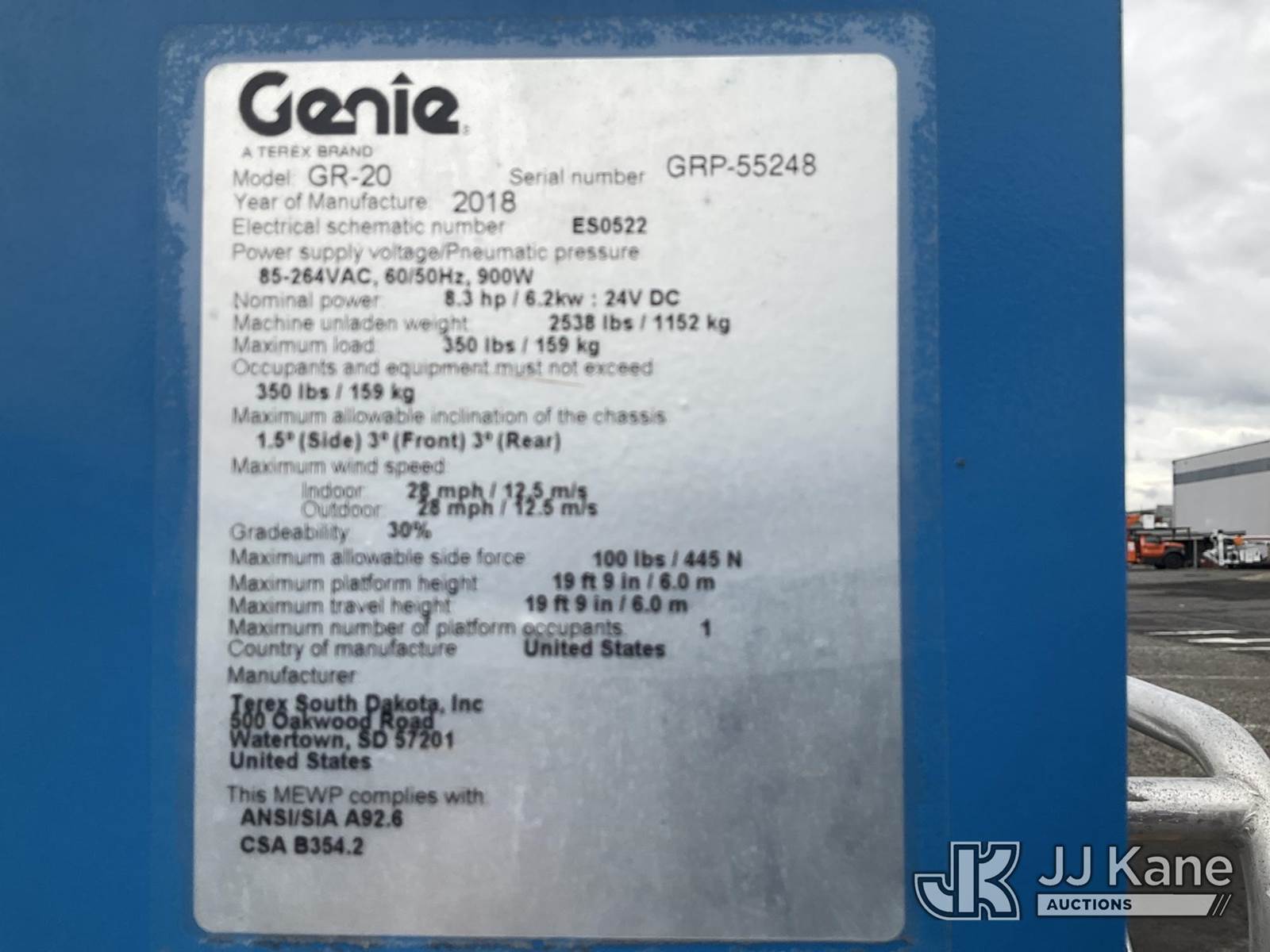 2018 Genie GR20 Self-Propelled Manlift, s/n GPR55248, Hydrostatic, electric, (Runs, Moves & Operates) NOTE: This unit is being sold AS IS/WHERE IS via Timed Auction and is located in Portland, OR. "Inspection & preview days for this unit are the 2 business days prior to the first day of items closing for this auction, item is located at 13817 NE Sandy Blvd Portland, OR 97230 and hours of operations are 8a-3p, M-F. For pre-sale questions, please contact Tony Tully @ (503)-307-1348. Dealer License Number DL1391." (Buyer is responsible for removal. Assistance by consignor or JJ Kane Auctioneers is not assured.)