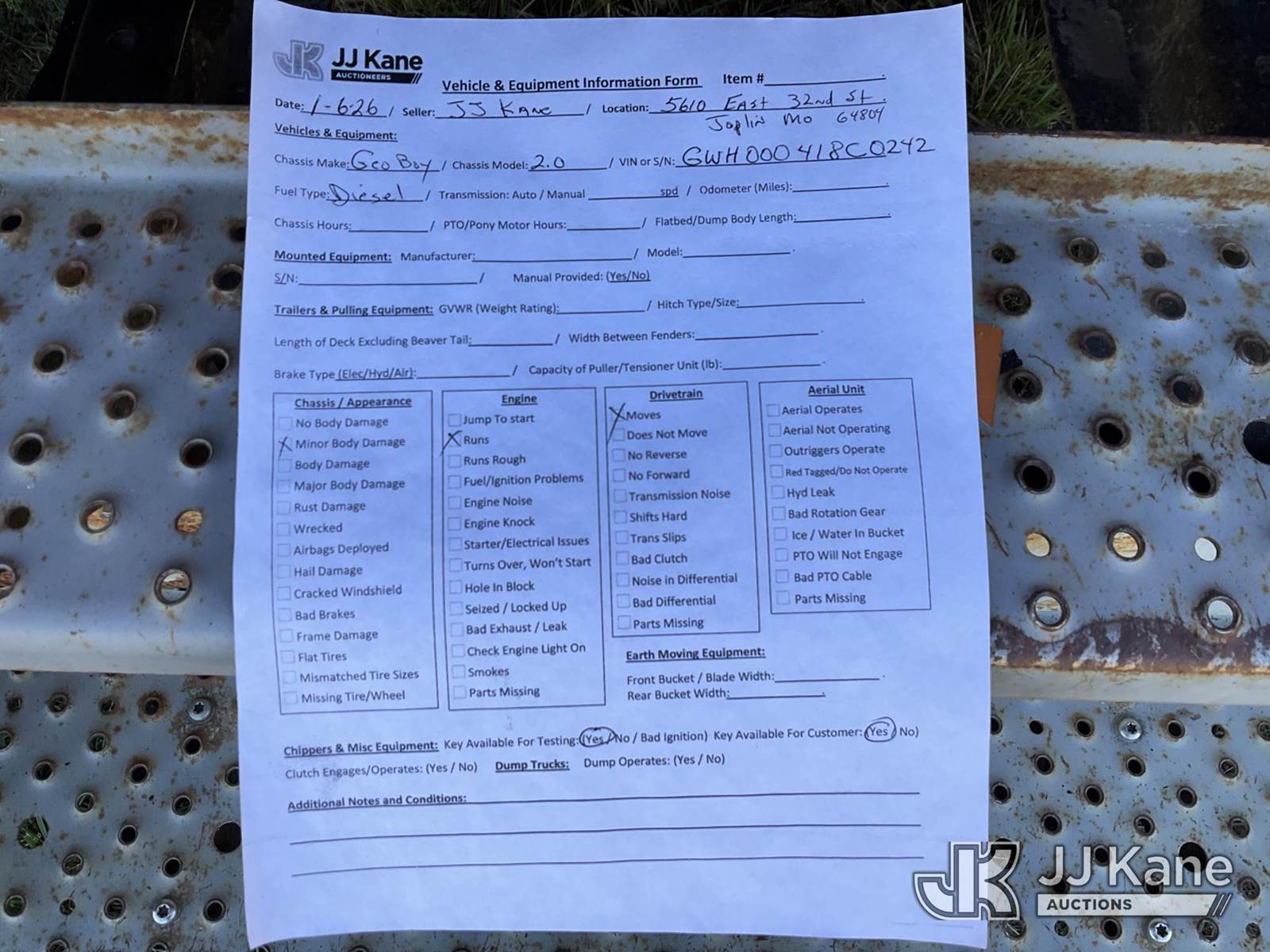 2018 Geoboy Wheel Articulating Site Preparation Machine, s/n 000GWH000418C0242, Cummins QSB6.7L Hydrostatic, diesel, with Fecon mulching head, rear winch, (Runs & Moves) (Mulching Head Inoperable - Condition Unknown, Minor Body Damage) (Reads 526 hours) NOTE: This unit is being sold AS IS/WHERE IS via Timed Auction and is located in Joplin, MO. Inspection & preview days for this unit are by appointment only; please contact us at contact@jjkane.com or 84-Go-JJKane for more details. (Buyer is responsible for removal. Assistance by consignor or JJ Kane Auctions is not assured.)