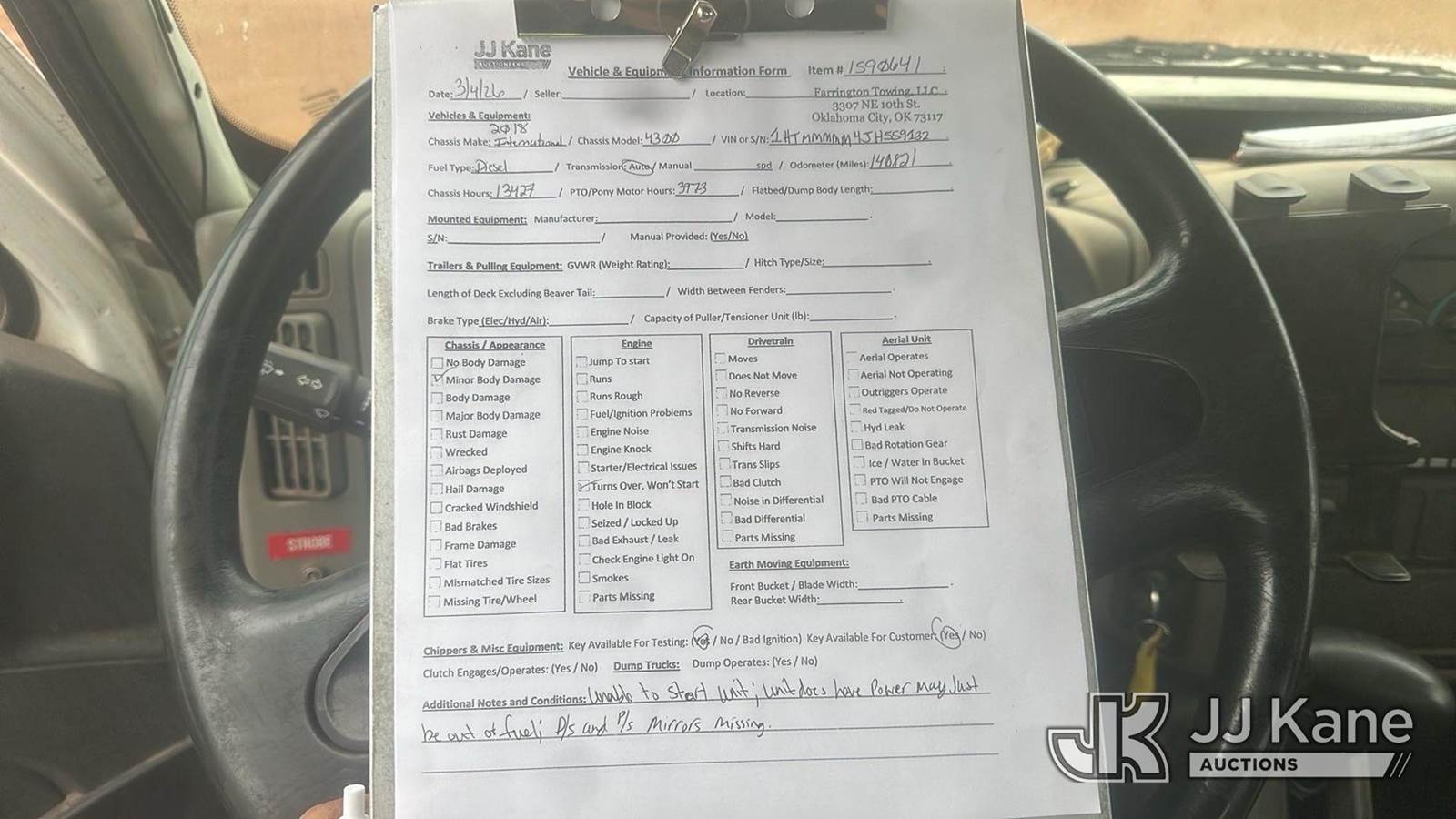 2018 International DuraStar 4300 Flatbed/Service Truck, Cummins ISB 6.7L Diesel 4X2, Auto, A/C, (140,821 miles) (Not Running, Conditions Unknown) (Unit May Be Out Of Fuel, Turns Over, Will Not Start, Minor Body Damage) This is a Titled Item NOTE: This unit is being sold AS IS/WHERE IS via Timed Auction and is located in Oklahoma City, OK. Inspection & preview days for this unit are by appointment only; please contact us at contact@jjkane.com or 84-Go-JJKane for more details. (Buyer is responsible for removal. Assistance by consignor or JJ Kane Auctions is not assured.)