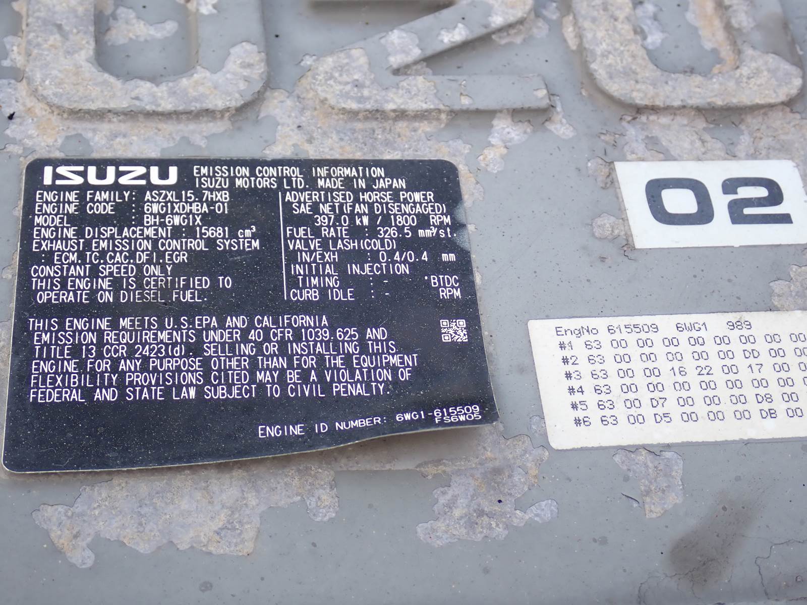 Isuzu 6WG1XYGD-02 diesel engine, turbocharged, air to air aftercooled, tier 3 rating, 532 HP at 1800 RPM rating, removed in running condition from a Multiquip genset. Engine build year is 2018, but built for approximately 2006 to 2010 model years, tier 3 emissions family. ENGINE TEST RAN CLEAN, 70 PSI OIL PRESSURE AT COLD IDLE, 90 PSI AT FULL THROTTLE, NO SMOKE OR BLOWBY OBSERVED DURING COLD TEST RUN. WILL INTERCHANGE W/ HITACHI 650 AND DEERE 650D SERIES EXCAVATORS AS WELL AS OTHERS. LONG BLOCK WILL INTERCHANGE W/ A VARIETY OF CONSTRUCTION AND INDUSTRIAL EQUIPMENT -- CONTACT US FOR DETAILS !