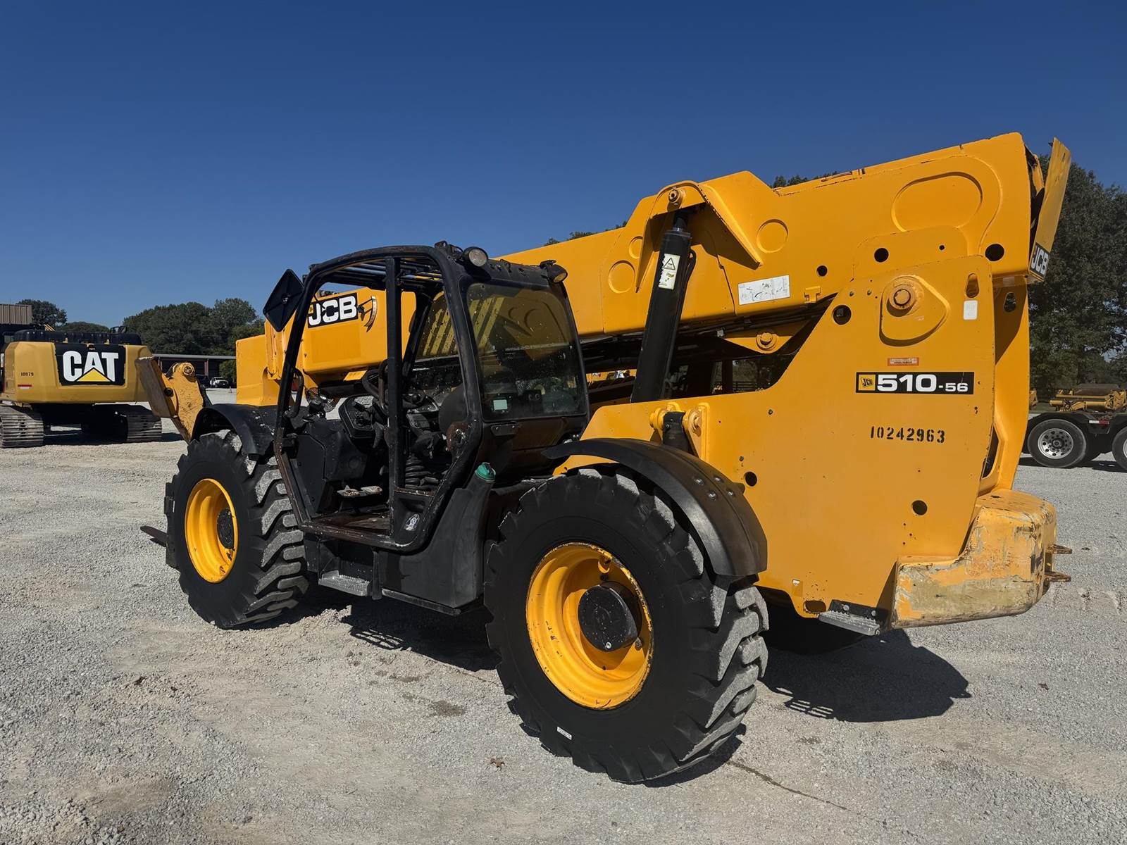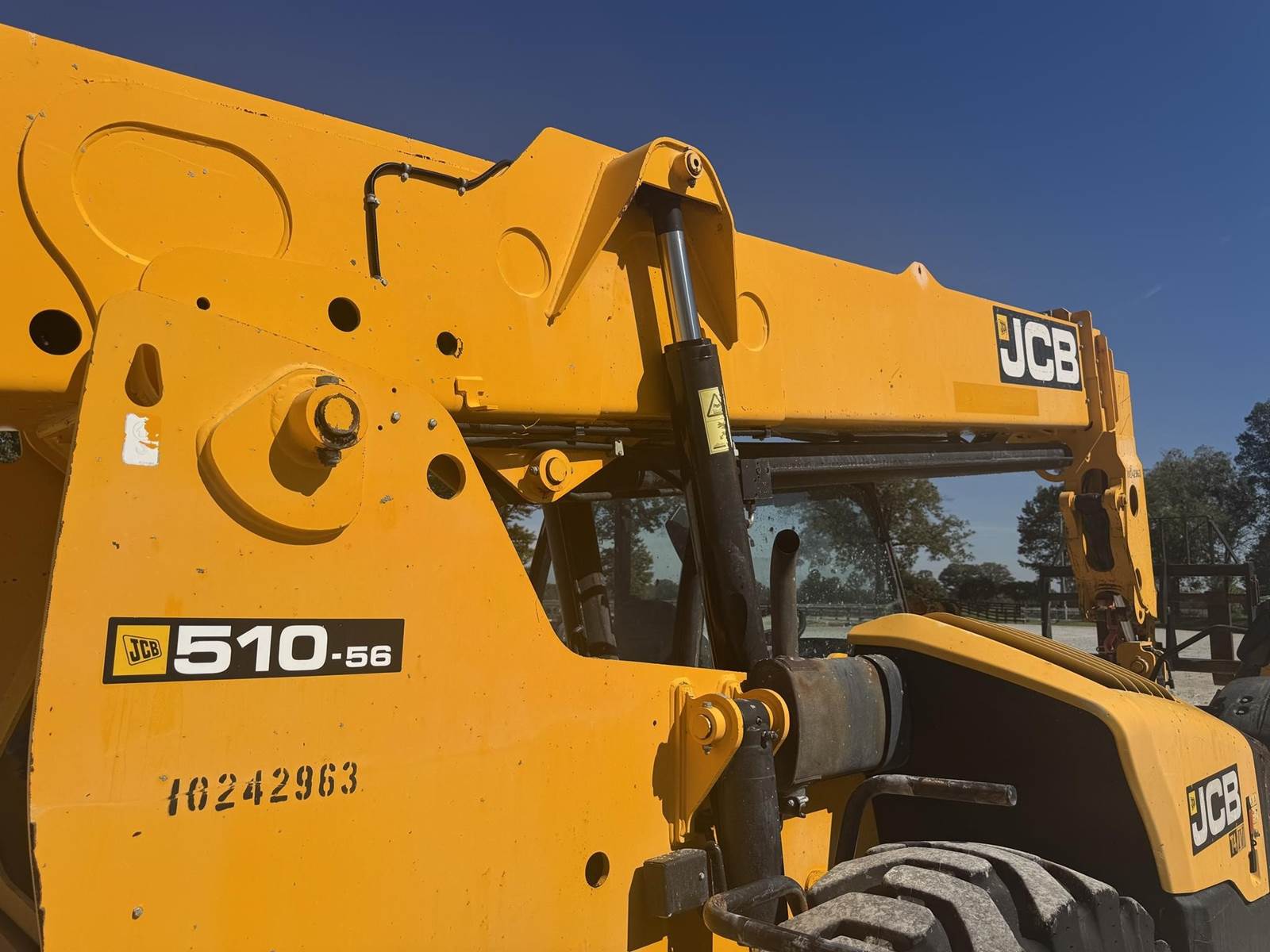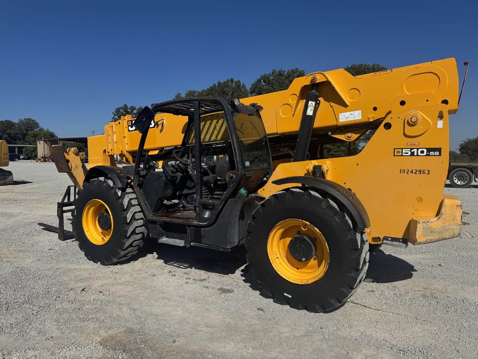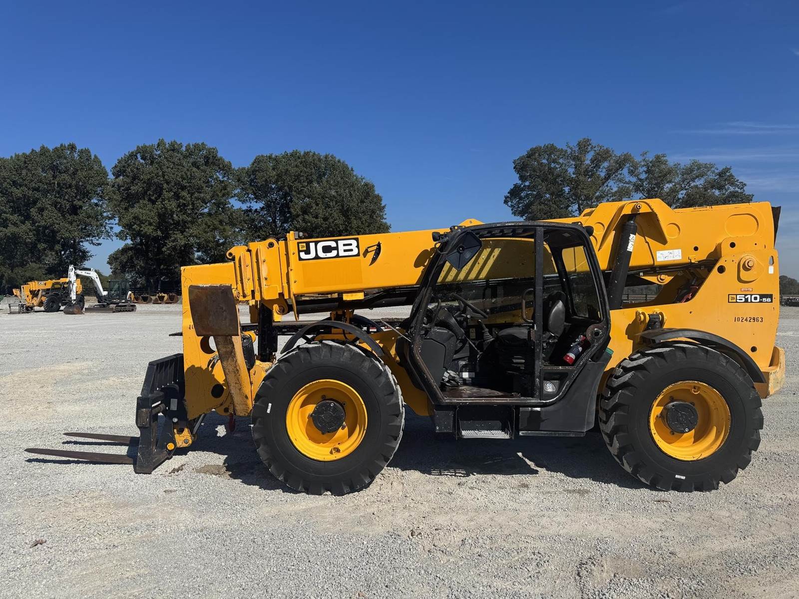 2018 JCB 510-56, 10,000 LBS LIFT CAPACITY, 56 FT MAX REACH, 4700 HOURS, OUTRIGGERS, FRONT AUXILIARY HYDRAULICS, OPEN CAB, 4 SPD TRANSMISSION, 3 WAY STEERING, JOYSTICK CONTROLS, CAB LEVELING