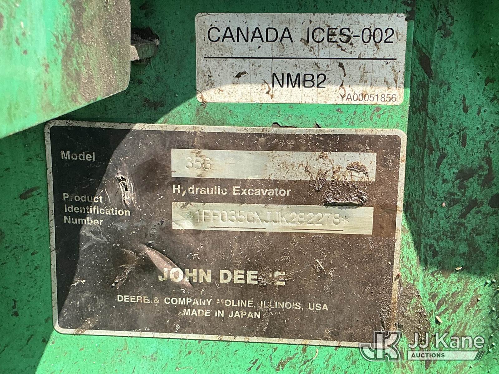 2018 John Deere 35G Mini Hydraulic Excavator, s/n 1FF035GXJJK282278, Yanmar diesel, Hydraulic Drive, with Short arm, aux hydraulics, backfill blade, digging bucket, rubber tracks, & ROPS, (Runs, Moves, Operates) (Seller States: 3,085 Hours) (Reads 3,085 hours) NOTE: This unit is being sold AS IS/WHERE IS via Timed Auction and is located in Thonotosassa, FL. Inspection & preview days for this unit are the 2 business days prior to the first day of items closing for this auction, item is located at 11720 N US 301 Thonotosassa, Fl 33592 and hours of operations are 8a-4p. For pre-sale questions, please contact Office Staff @ (813) 986-2485. (Buyer is responsible for removal. Assistance by consignor or JJ Kane Auctions is not assured.)