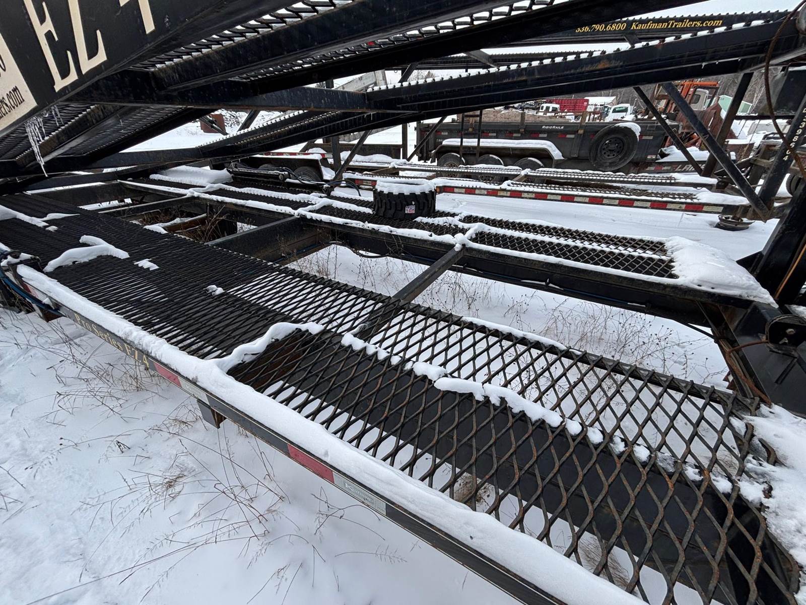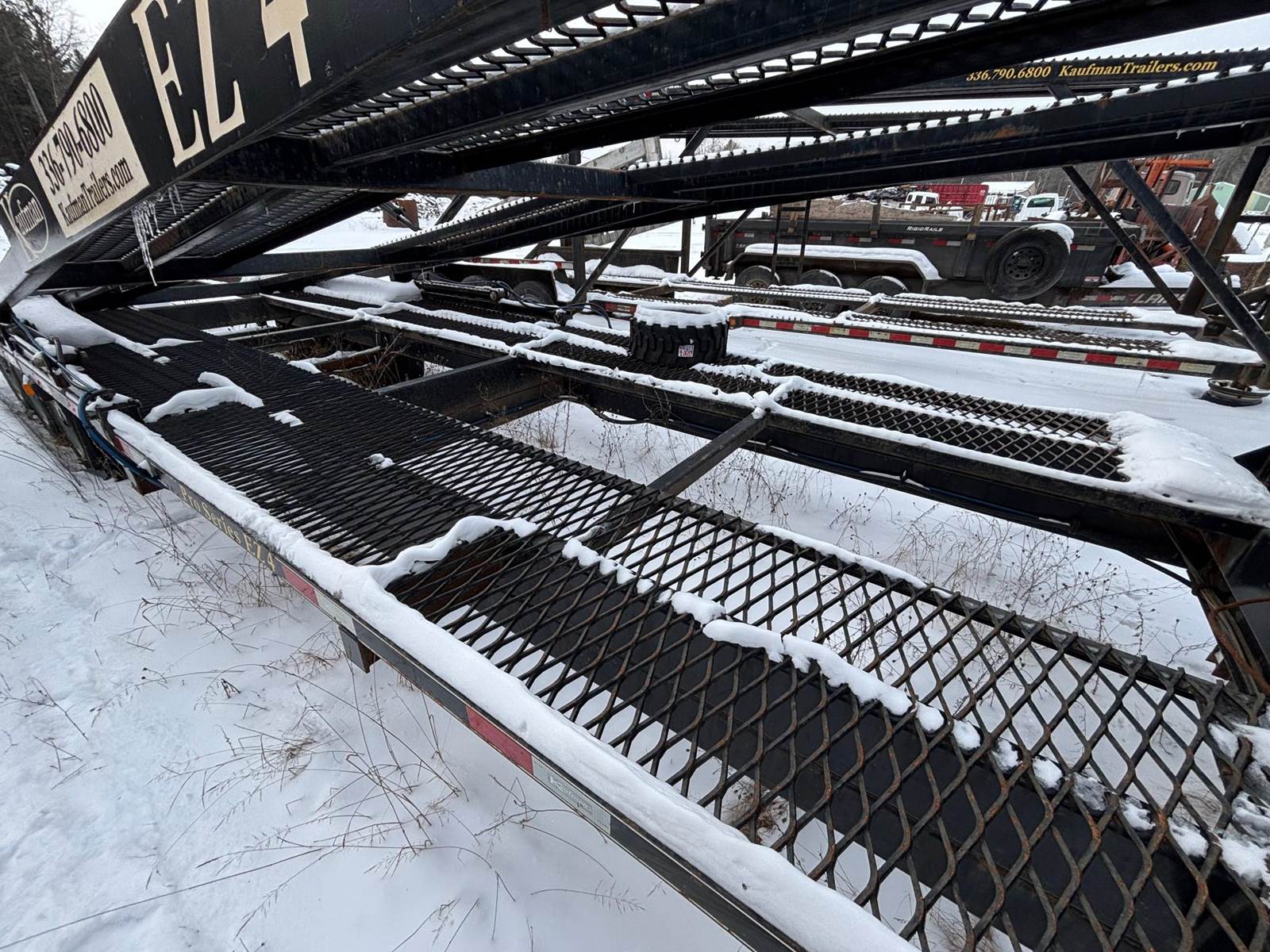 2018 Kaufman EZ4 Car Gooseneck Hauler Trailer, G.V.W.R. 25,000 lb., Electrical DOT approved wiring, connectors, and all rubber mounted LED lights, Frame 8 in. x 3 in. Tubular steel, Dovetail 6 ft., Upper Deck 31 ft. with hydraulically lifted rear platform, with wireless remote, Side Rail N/A, Tongue 10 in. x 4 in. Tubular steel, Tires 215/75 R17.5 16PR (4,805) with mounted spare standard, Floors Ridged expanded metal runners with open center, Coupler 2-5/16 in. 25,000 GVWR adjustable ball coupler or SAE 2 in. kingpin, Safety Chains N/A, Ramps 8 ft. Aluminum ramps, Tie Downs Lower: Ratchets and straps. Upper Deck: Ratchets & 5 ft. transport chains UNLESS heavy mesh option is ordered. Deck Length 47 ft. (Overall 67 ft. total deck space), Lower Deck 30 ft. flat + 6 ft. dove, Brakes All wheel electric brakes, Jack Dual 12,000 lb. drop foot jacks, Axles 3-8,000 lb. e-z lube axles, Suspension Slipper springs, Toolbox 18 in. x 18 in. x 36 in. lockable toolbox. Very light use.