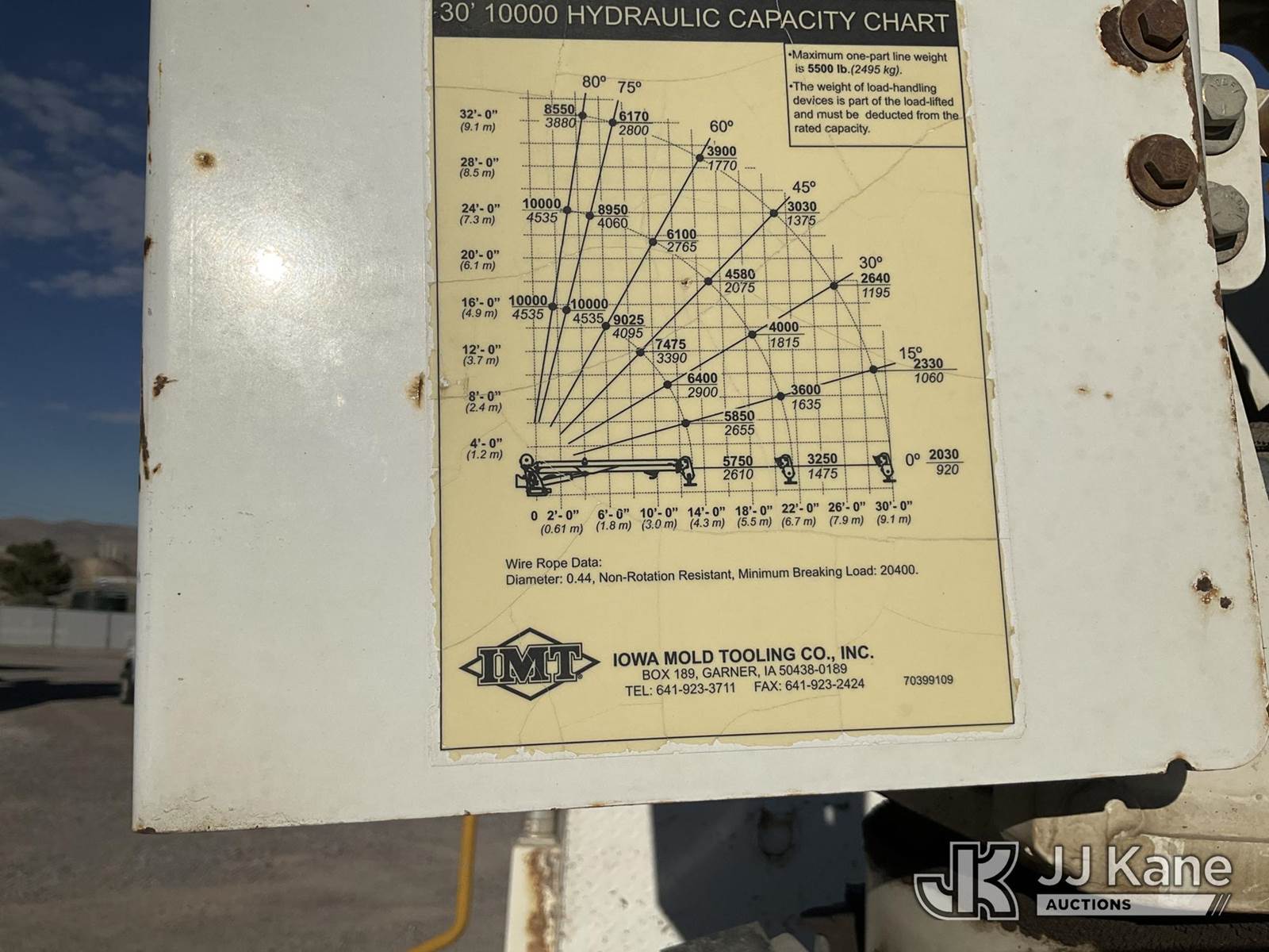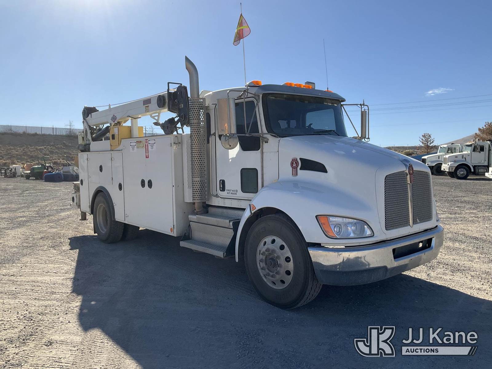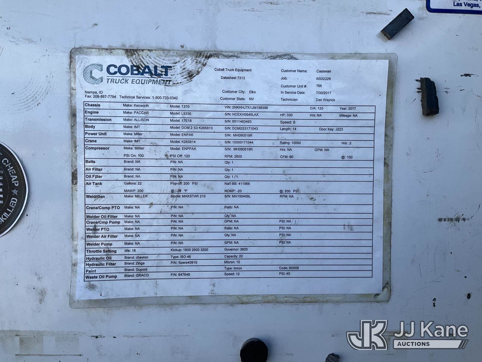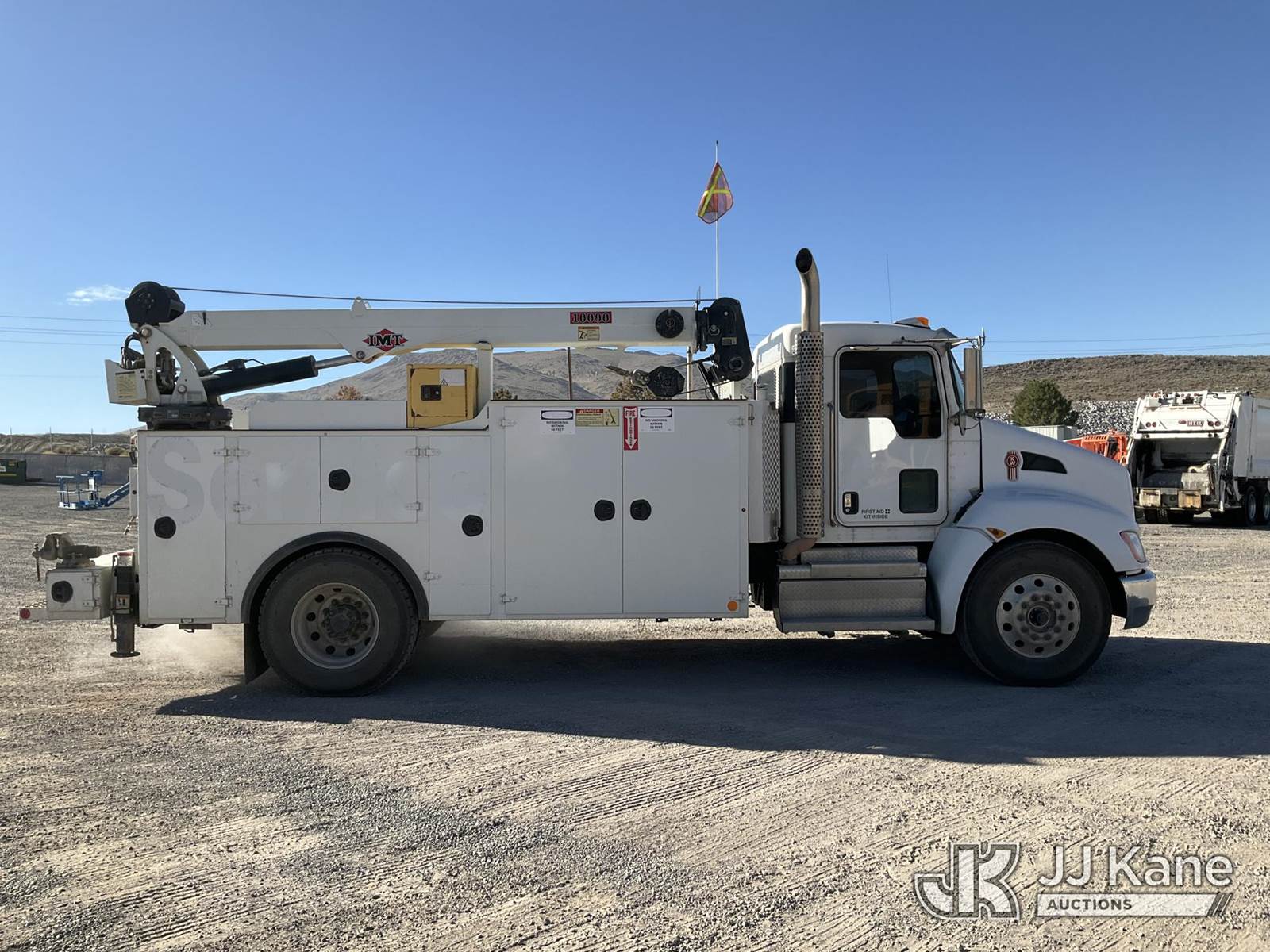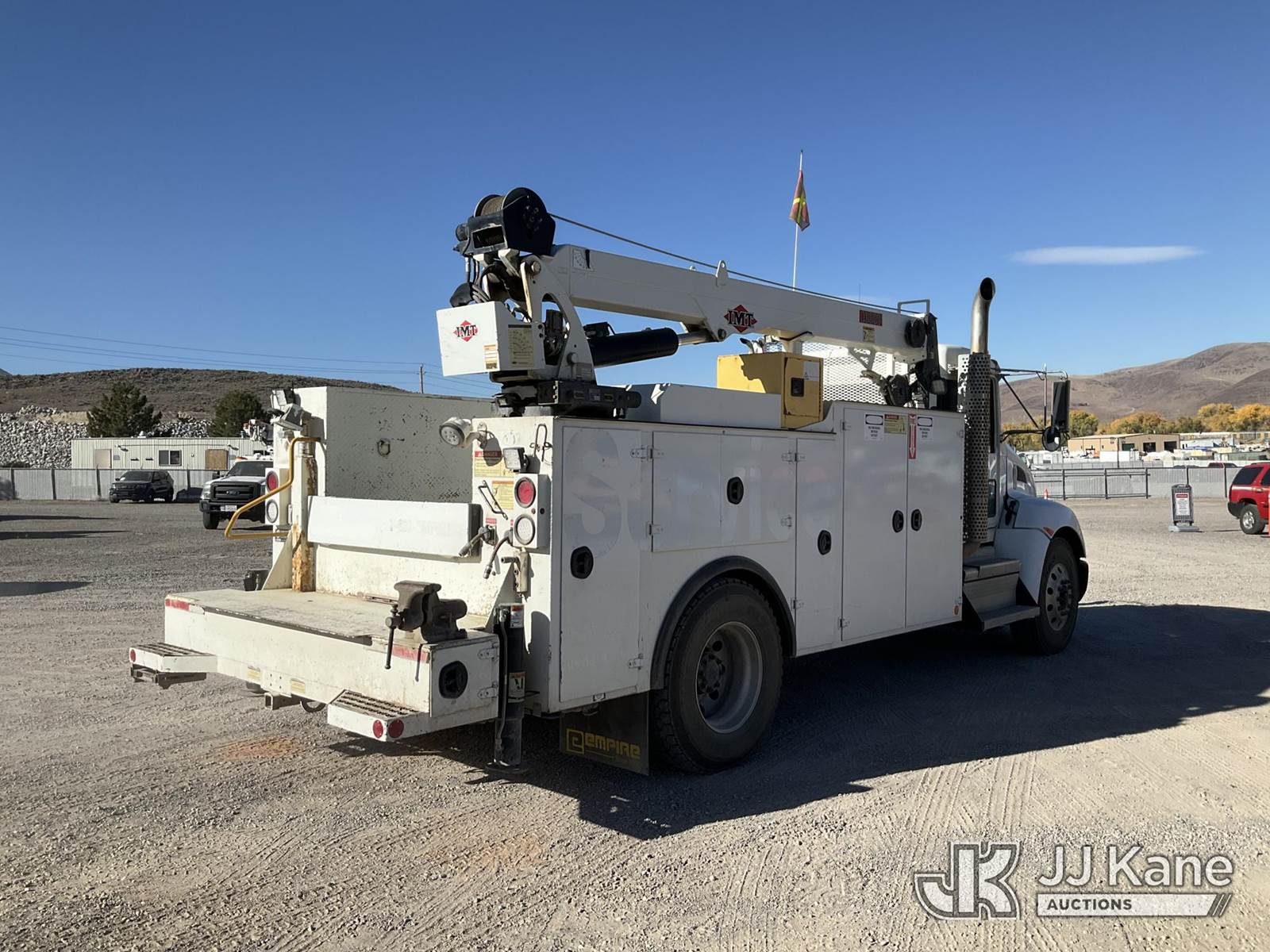 2018 Kenworth T370 Mechanics Service Truck, Paccar L9330 Auto, 4X2, diesel, A/C, with imt 10000 crane, generator, Miller Maxstar 210 welder, miller ENPAK air compressor, (184,674 miles) (Runs, Moves, & PTO Operates) (Outriggers & Crane Condition Unknown) (Reads 7,413 hours) This is a Titled Item NOTE: This unit is being sold AS IS/WHERE IS via Timed Auction and is located in Sparks, NV. Inspection & preview days for this unit are the 2 business days prior to the first day of items closing for this auction, item is located at 601 Britain Dr Sparks, NV 89437 and hours of operations are 8a-4p. Titles executed exactly as bidder registered. Ensure your name and/or business name and address in JJ Kane and/or ProxiBid is correct before bidding. For pre-sale questions, please contact Office Staff @ (801) 519-0123 and provide sale date and lot number. Sparks Dealer License Number DLR000052908 / OHV000052909. (Buyer is responsible for removal. Assistance by consignor or JJ Kane Auctioneers is not assured.)