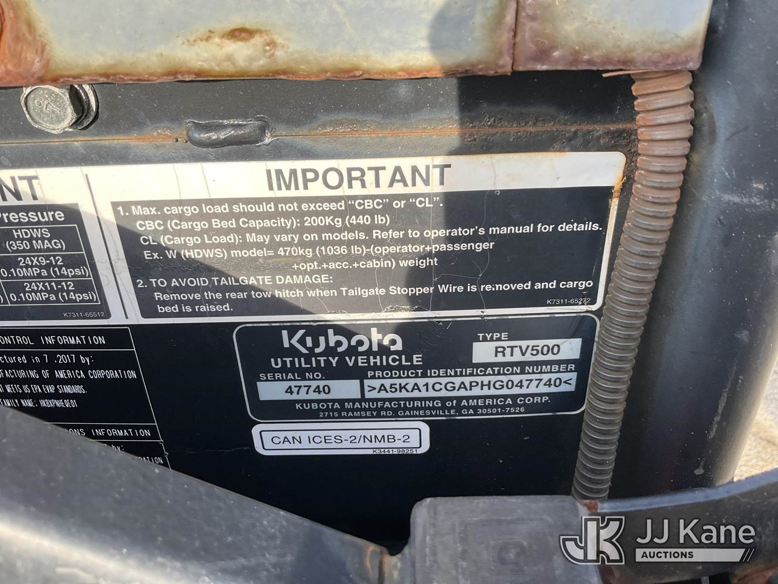 2018 Kubota RTV500 4x4 All-Terrain Vehicle, s/n A5KA1CGAPHG047740, Kubota Auto, diesel, with Snow Plow, Front Winch & ROPS, (No Title) (Runs, Moves, Operates) (Reads 763 hours) NOTE: This unit is being sold AS IS/WHERE IS via Timed Auction and is located in South Beloit, IL. Inspection & preview days for this unit are the 2 business days prior to the first day of items closing for this auction, item is located at 14354 Dearborn Ave South Beloit, IL and hours of operations are 8a-4p. For pre-sale questions, please contact Derek Eklund at (608) 904-0618 or (derek.eklund@jjkane.com). (Buyer is responsible for removal. Assistance by consignor or JJ Kane Auctions is not assured.)