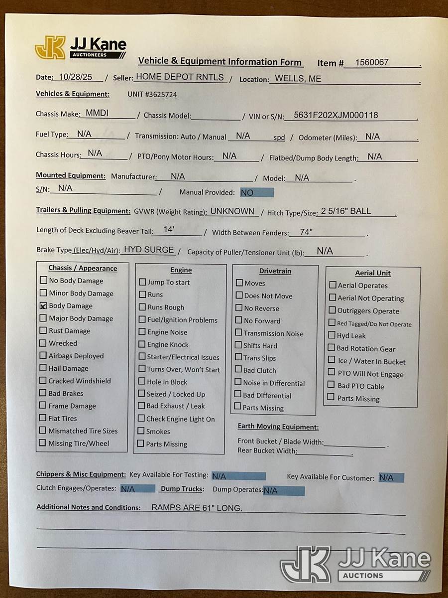 2018 MMDI, Inc 614SLTD T/A Tagalong Equipment Trailer, with 14 ft deck & ramps, (Removal is by Appointment Only, Buyer MUST make a appointment prior to picking up, Buyer/Transporter Must have PAID IN FULL RELEASE. No onsite assistance available, Please Come prepared.) This is a Titled Item NOTE: This unit is being sold AS IS/WHERE IS via Timed Auction and is located in Wells, ME. Inspection & preview days for this unit are by appointment only; please contact us at contact@jjkane.com or 84-Go-JJKane for more details. (Buyer is responsible for removal. Assistance by consignor or JJ Kane Auctioneers is not assured.)