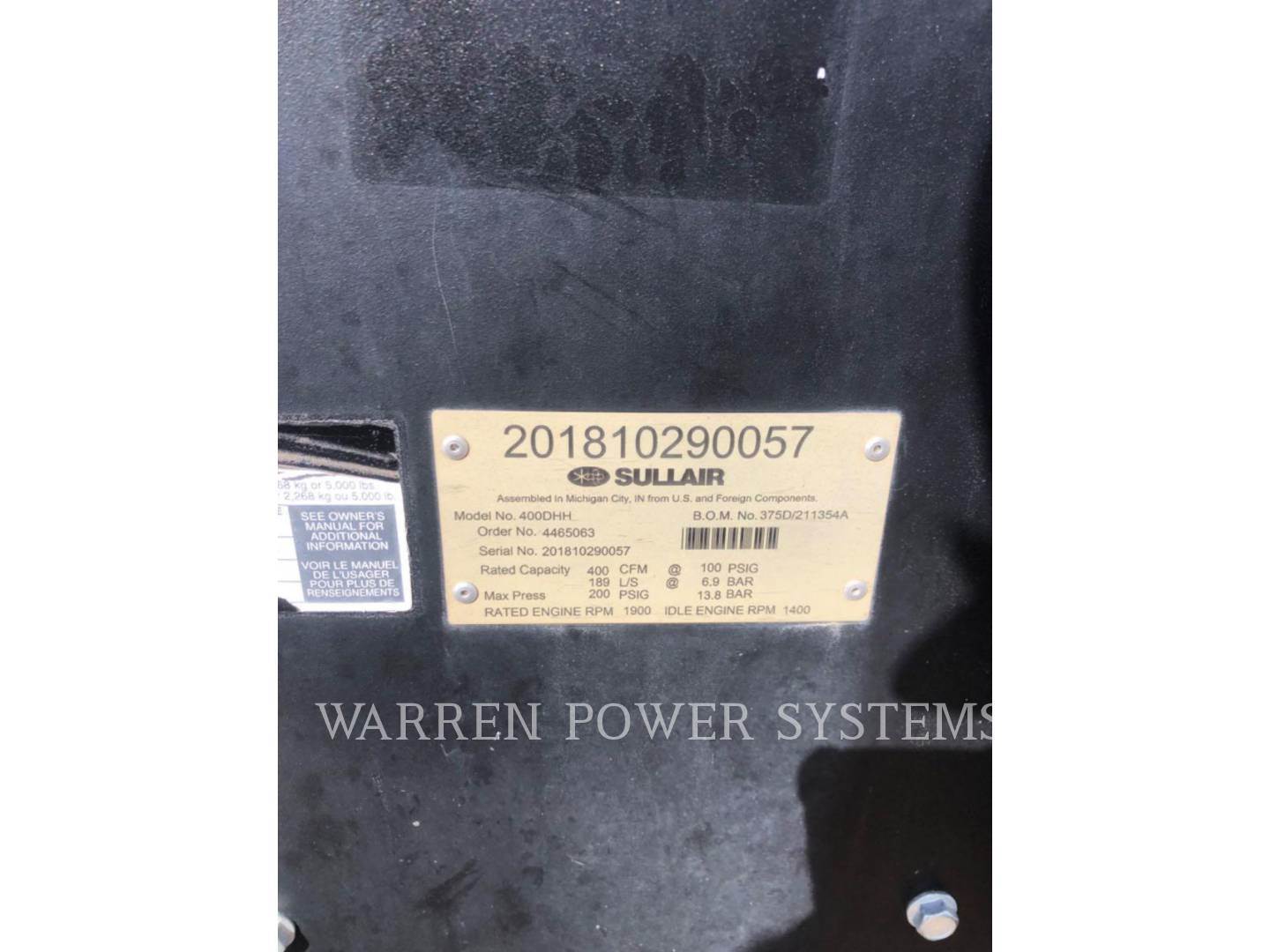 2018 Sullair 400HH T4F Air Compressor