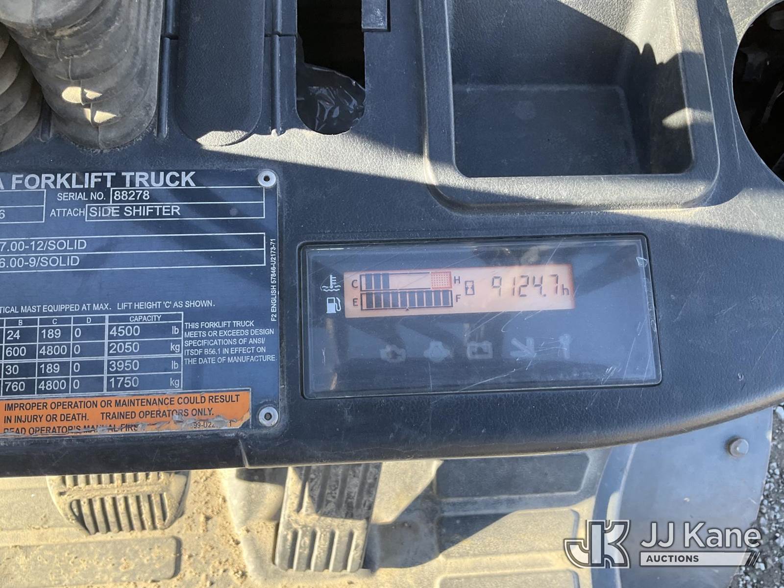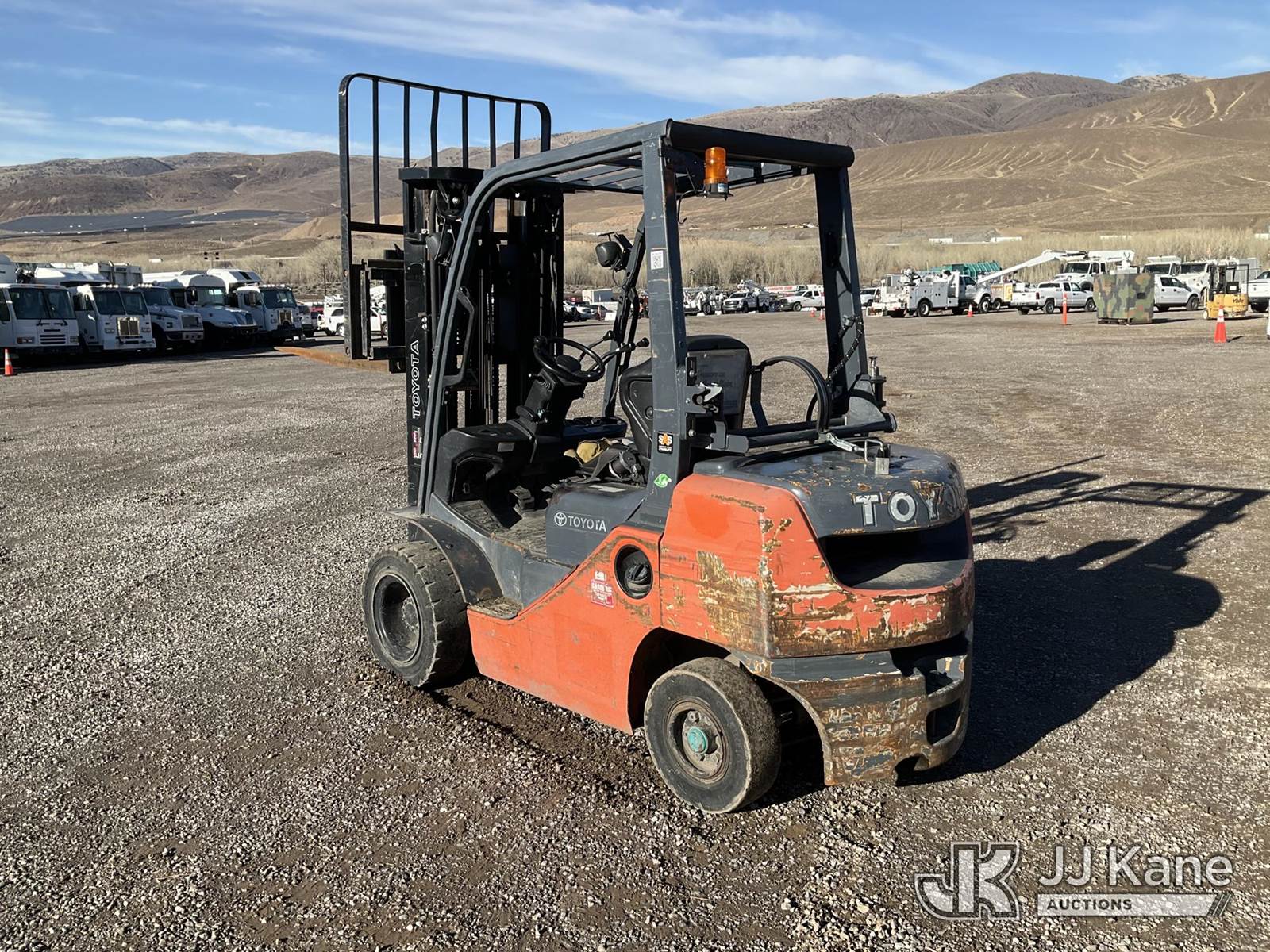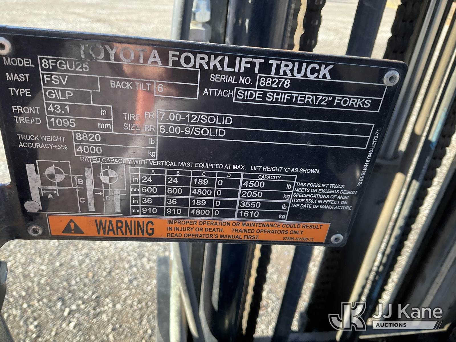 2018 Toyota 8FGCU25 Pneumatic Tired Forklift, s/n 8FGU25-88278, Toyota 4Y-ECS 4-cylinder Shuttle, Dual Fuel (LPG & Gas), with 4,500lbs capacity, 189in fork height, (Runs, Moves & Operates) (Reads 9,124 hours) NOTE: This unit is being sold AS IS/WHERE IS via Timed Auction and is located in Sparks, NV. Inspection & preview days for this unit are the 2 business days prior to the first day of items closing for this auction, item is located at 601 Britain Dr Sparks, NV 89437 and hours of operations are 8a-4p. Titles executed exactly as bidder registered. Ensure your name and/or business name and address in JJ Kane and/or ProxiBid is correct before bidding. For pre-sale questions, please contact Office Staff @ (801) 519-0123 and provide sale date and lot number. Sparks Dealer License Number DLR000052908 / OHV000052909. (Buyer is responsible for removal. Assistance by consignor or JJ Kane Auctions is not assured.)