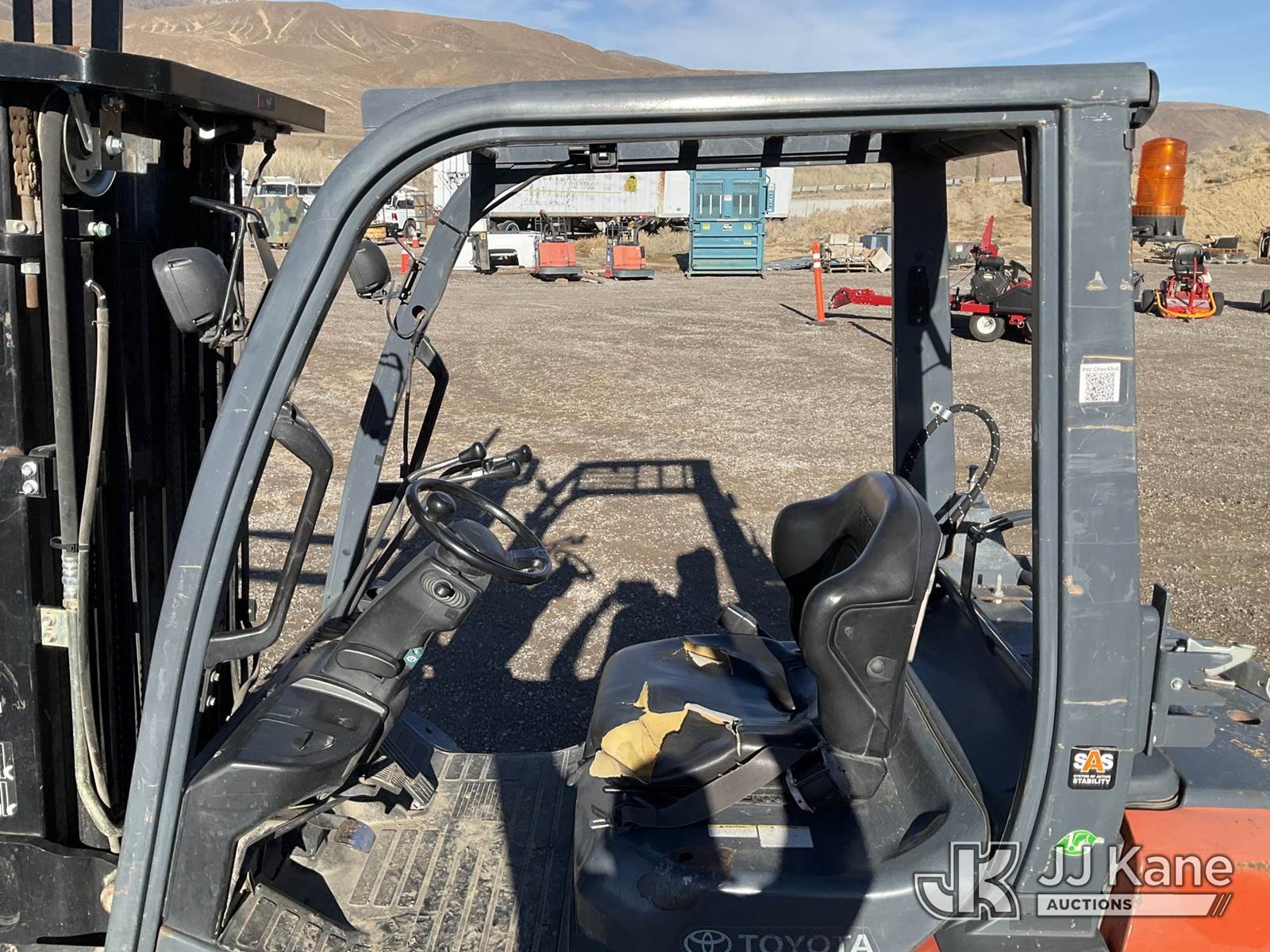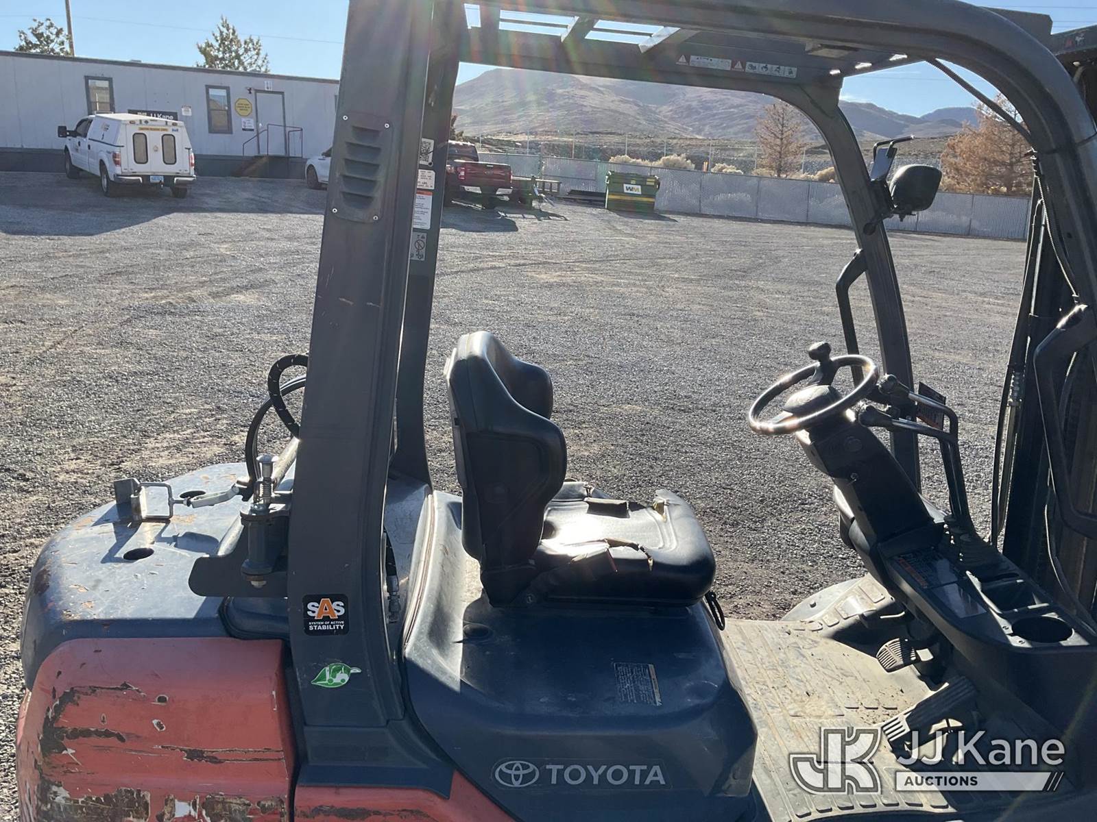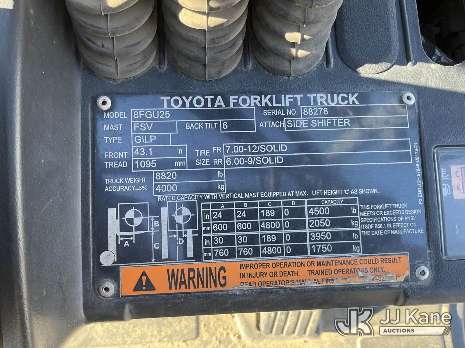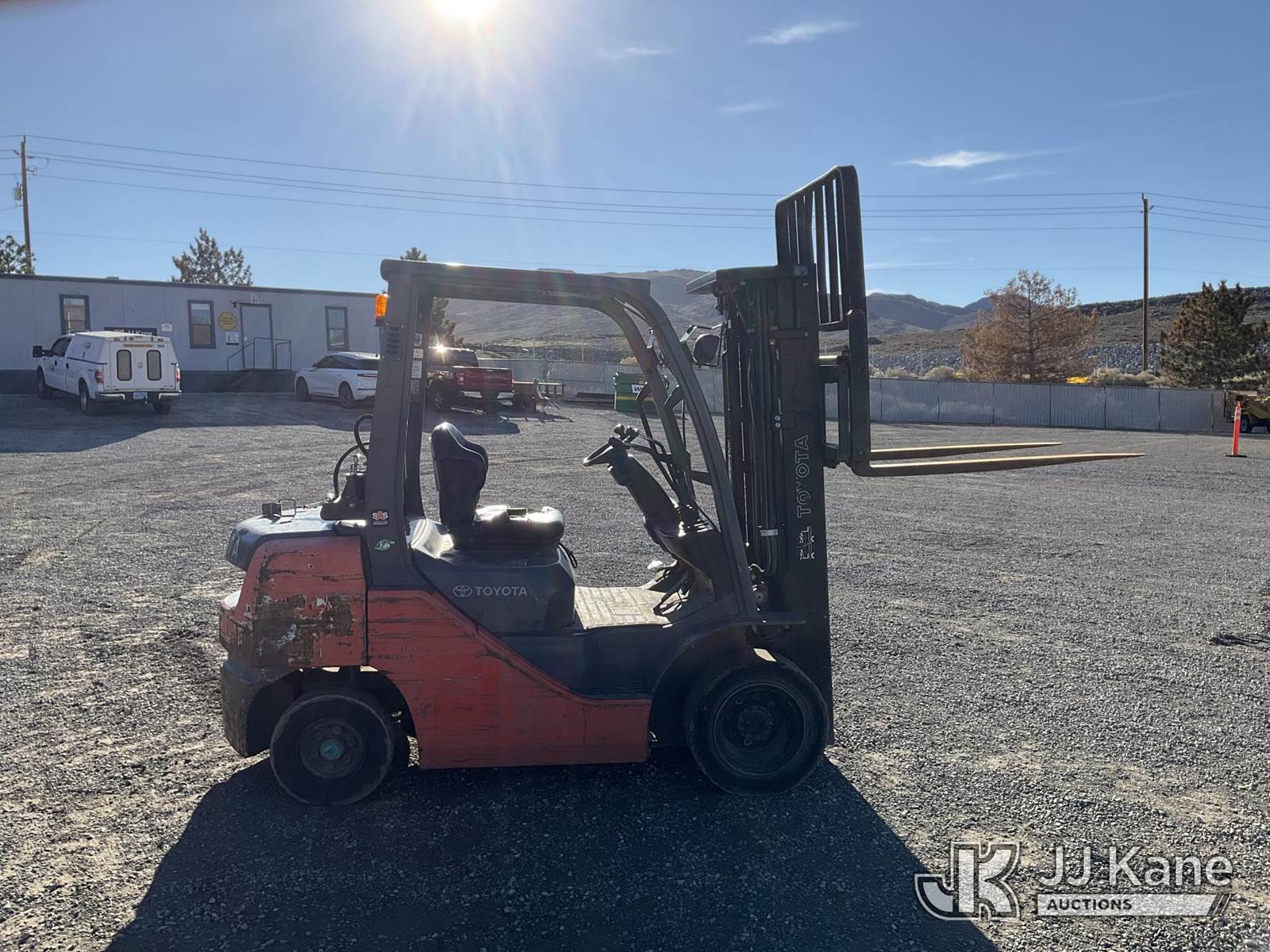 2018 Toyota 8FGCU25 Pneumatic Tired Forklift, s/n 8FGU25-88278, Toyota 4Y-ECS 4-cylinder Shuttle, Dual Fuel (LPG & Gas), with 4,500lbs capacity, 189in fork height, (Runs, Moves & Operates) (Reads 9,124 hours) NOTE: This unit is being sold AS IS/WHERE IS via Timed Auction and is located in Sparks, NV. Inspection & preview days for this unit are the 2 business days prior to the first day of items closing for this auction, item is located at 601 Britain Dr Sparks, NV 89437 and hours of operations are 8a-4p. Titles executed exactly as bidder registered. Ensure your name and/or business name and address in JJ Kane and/or ProxiBid is correct before bidding. For pre-sale questions, please contact Office Staff @ (801) 519-0123 and provide sale date and lot number. Sparks Dealer License Number DLR000052908 / OHV000052909. (Buyer is responsible for removal. Assistance by consignor or JJ Kane Auctions is not assured.)
