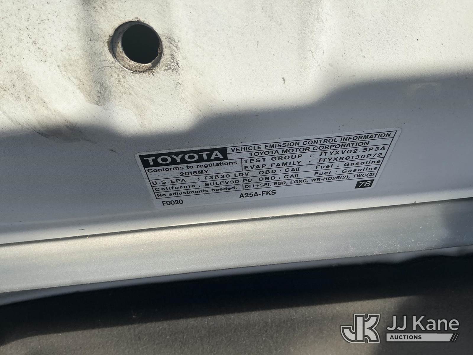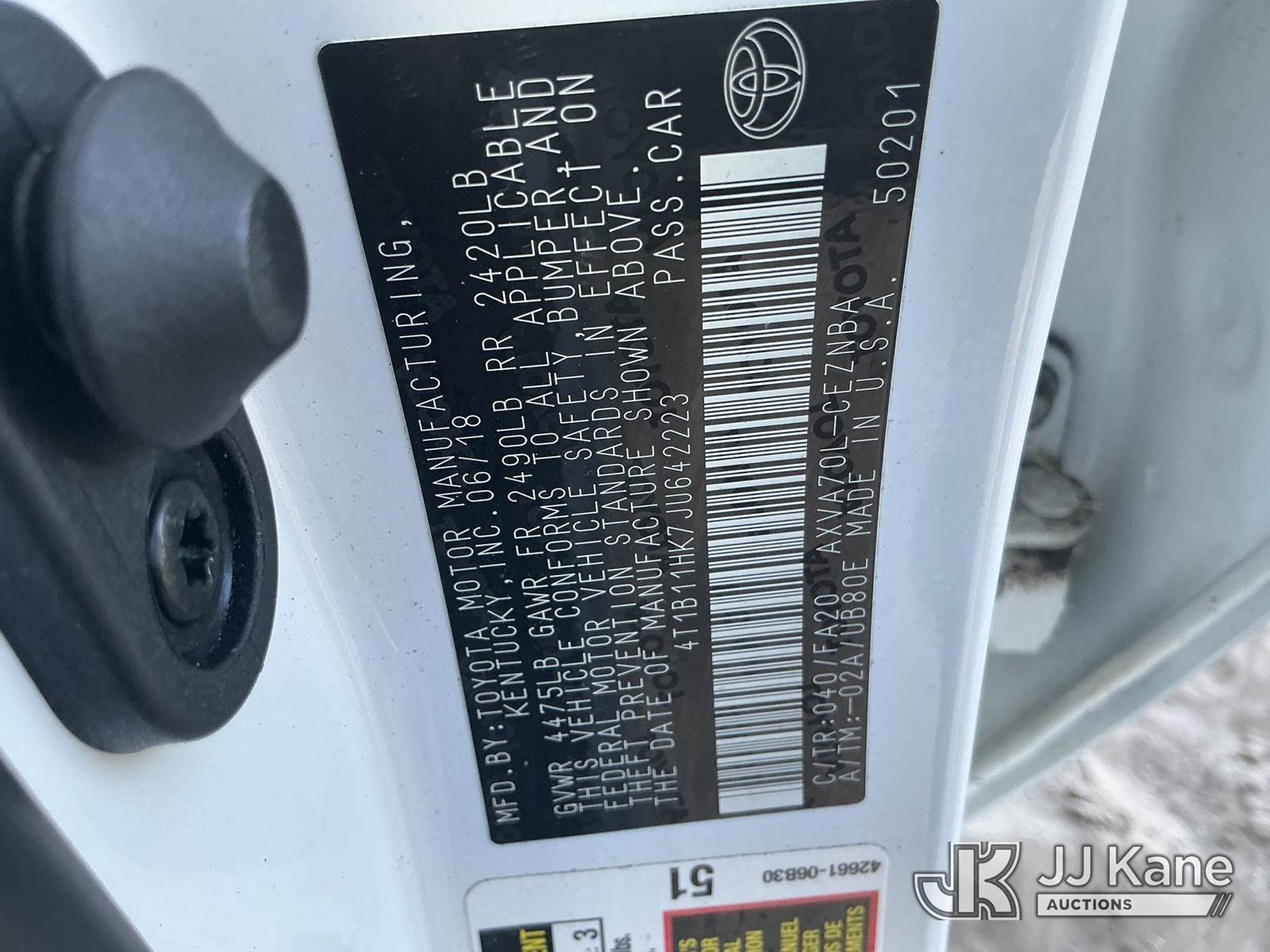 2018 Toyota Camry 4-Door Sedan, 4-cyl gas, Auto, A/C, (57,687 miles) (State of FL Unit) (Not Running, Conditions Unknown) (No Key, Paint/Body Damage) (FL Residents Purchasing Titled Items - tax, title & registration fees will be collected at the maximum rate of $400.00 under 25,999 and $800.00 for Over 26,000 and $250.00 trailers - Proof of insurance is mandatory; Out of State Residents Purchasing Title Items - tax will be collected based upon your state rate.) This is a Titled Item NOTE: This unit is being sold AS IS/WHERE IS via Timed Auction and is located in Thonotosassa, FL. Inspection & preview days for this unit are the 2 business days prior to the first day of items closing for this auction, item is located at 11720 N US 301 Thonotosassa, Fl 33592 and hours of operations are 8a-4p. For pre-sale questions, please contact Office Staff @ (813) 986-2485. (Buyer is responsible for removal. Assistance by consignor or JJ Kane Auctioneers is not assured.)