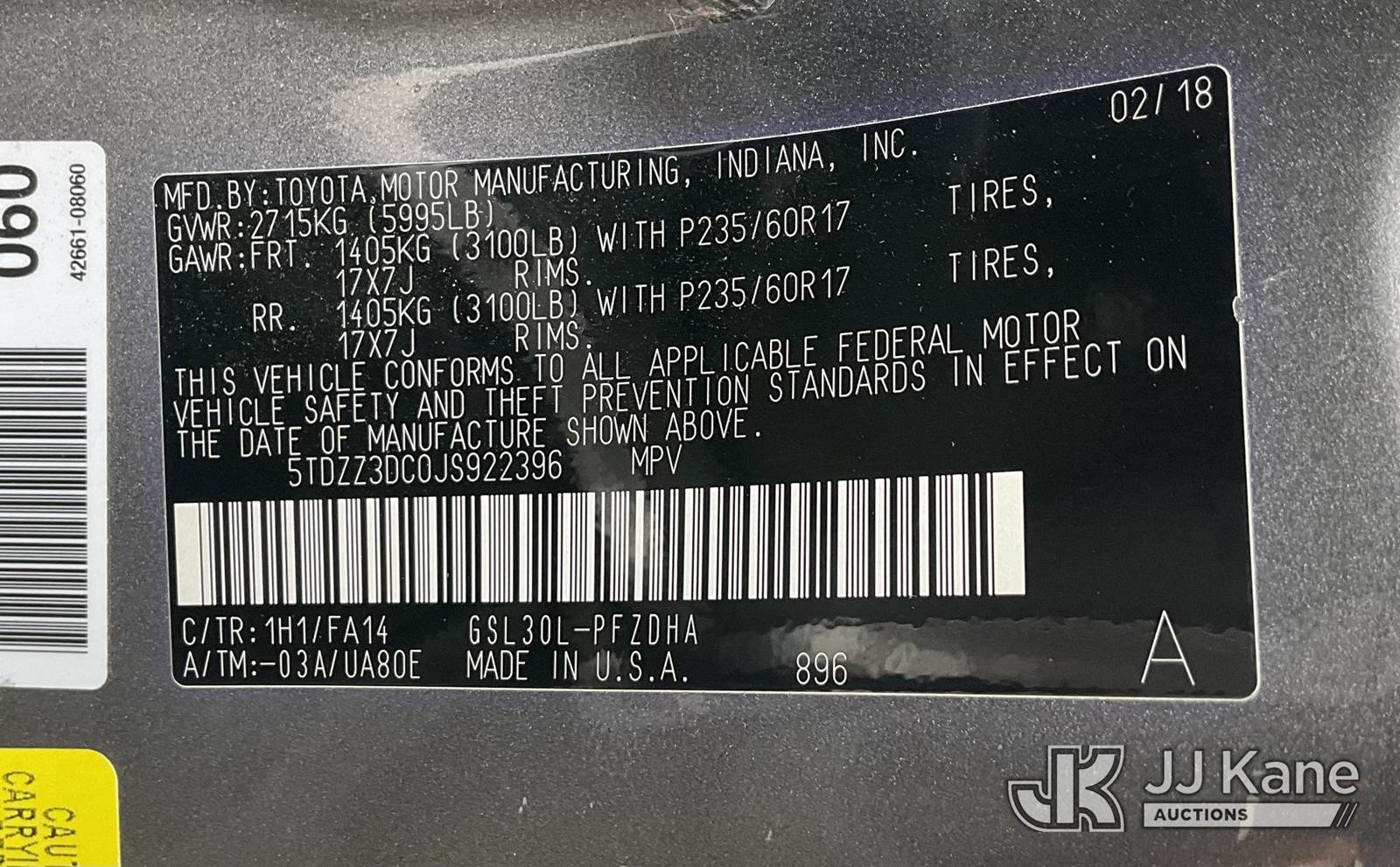 2018 Toyota Sienna Mini Passenger Van, 6-cyl gas, 8-Speed Automatic, FWD, A/C, (91,765 miles) (Runs & Moves) This is a Titled Item NOTE: This unit is being sold AS IS/WHERE IS via Timed Auction and is located in Jurupa Valley, CA. Inspection & preview days for this unit are the 2 business days prior to the first day of items closing for this auction, item is located at 4510 Muth Way Jurupa Valley, CA 92509 and hours of operations are 8a-4p. For pre-sale questions, please contact please contact Office Staff @ (310) 353-7140. Dealer License Number 45696. (Buyer is responsible for removal. Assistance by consignor or JJ Kane Auctions is not assured.)
