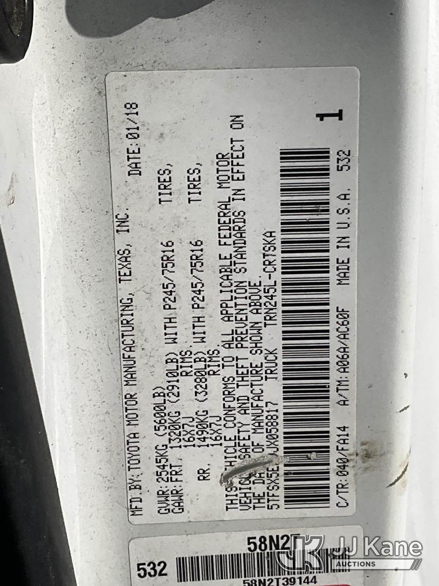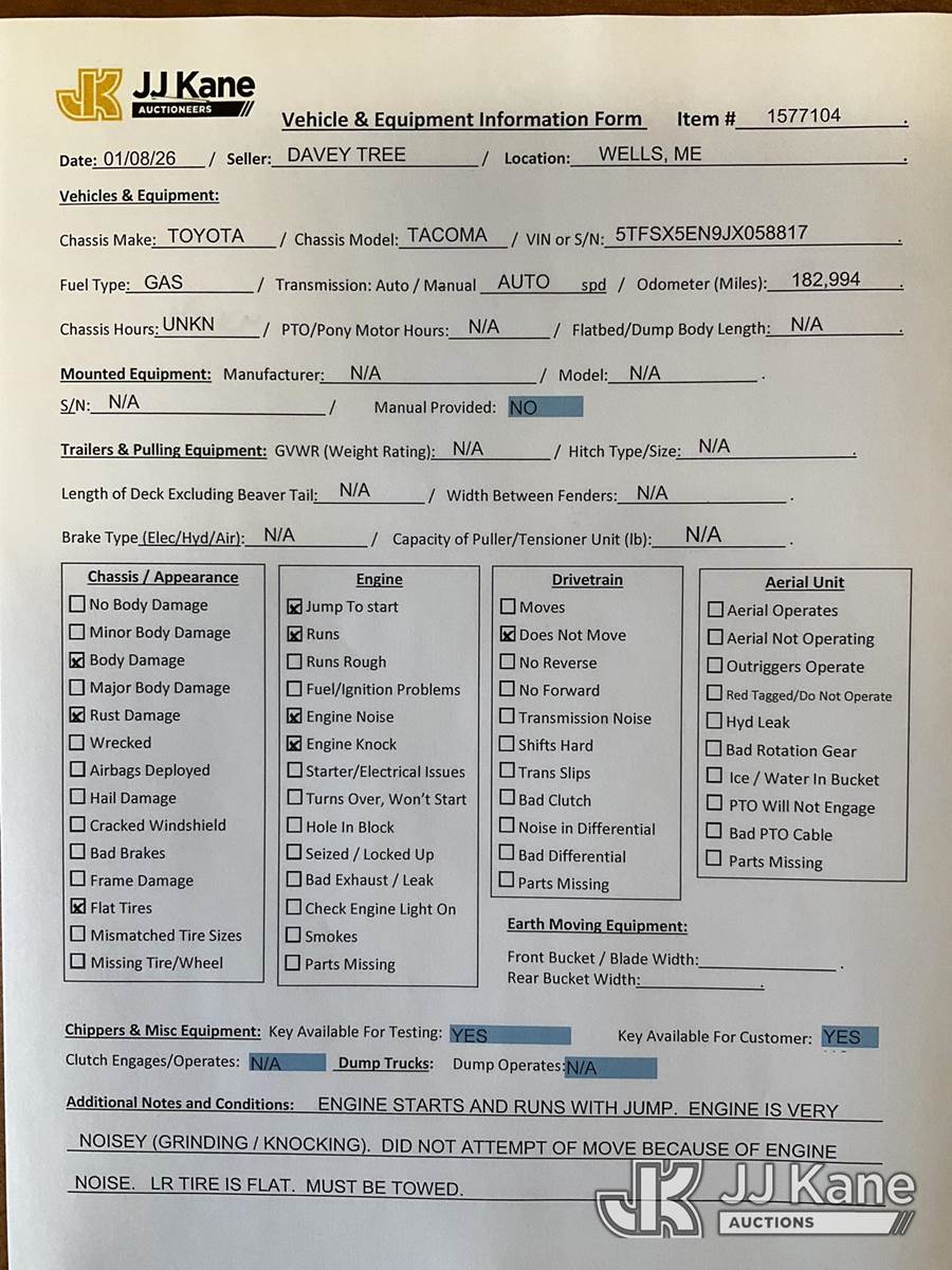 2018 Toyota Tacoma 4x4 Extended-Cab Pickup Truck, 4-cyl gas, Auto, A/C, (182,994 miles) (Jump to Start, Runs Rough, Transmission Condition Unknown, Engine Light On, Engine Noise, Body & Rust Damage) (Removal is by Appointment Only, Buyer MUST make a appointment prior to picking up, Buyer/Transporter Must have PAID IN FULL RELEASE. No onsite assistance available, Please Come prepared.) This is a Titled Item NOTE: This unit is being sold AS IS/WHERE IS via Timed Auction and is located in Wells, ME. Inspection & preview days for this unit are by appointment only; please contact us at contact@jjkane.com or 84-Go-JJKane for more details. (Buyer is responsible for removal. Assistance by consignor or JJ Kane Auctions is not assured.)
