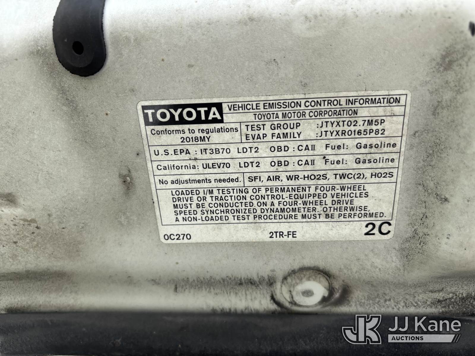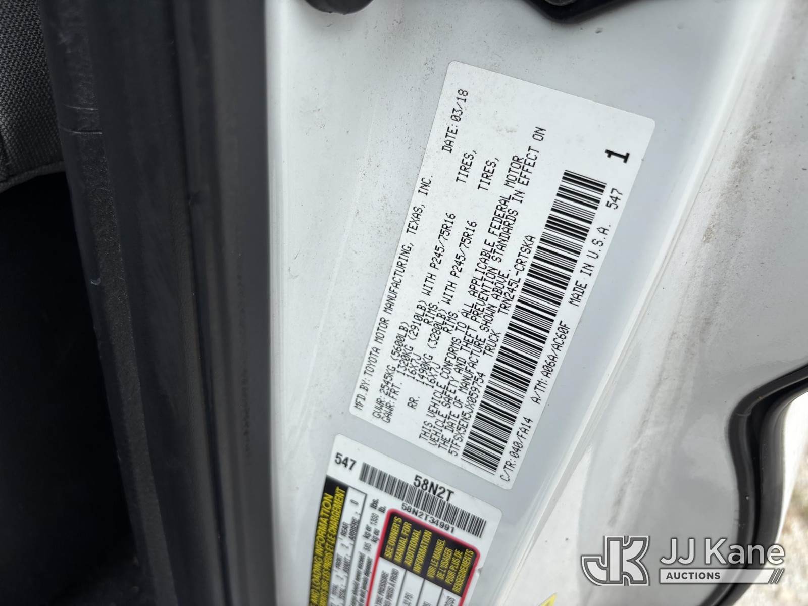 2018 Toyota Tacoma 4x4 Extended-Cab Pickup Truck, 2.7L L4 DOHC 16V gas, Auto, A/C, (171,847 miles) (Runs & Moves) (Body/Paint Damage) (FL Residents Purchasing Titled Items – tax, title & registration fees will be collected at the maximum rate of $400.00 under 25,999 and $800.00 for Over 26,000 and $250.00 trailers – Proof of insurance is mandatory; Out of State Residents Purchasing Title Items – tax will be collected based upon your state rate.) This is a Titled Item NOTE: This unit is being sold AS IS/WHERE IS via Timed Auction and is located in Westlake, FL. Inspection & preview days for this unit are the 2 business days prior to the first day of items closing for this auction, item is located at 4003 Seminole Pratt Whitney Rd Westlake, FL 33470 and hours of operations are 8a-4p. For pre-sale questions, please contact: Matt Johnson @ (205) 847-9106. (Buyer is responsible for removal. Assistance by consignor or JJ Kane Auctions is not assured.)