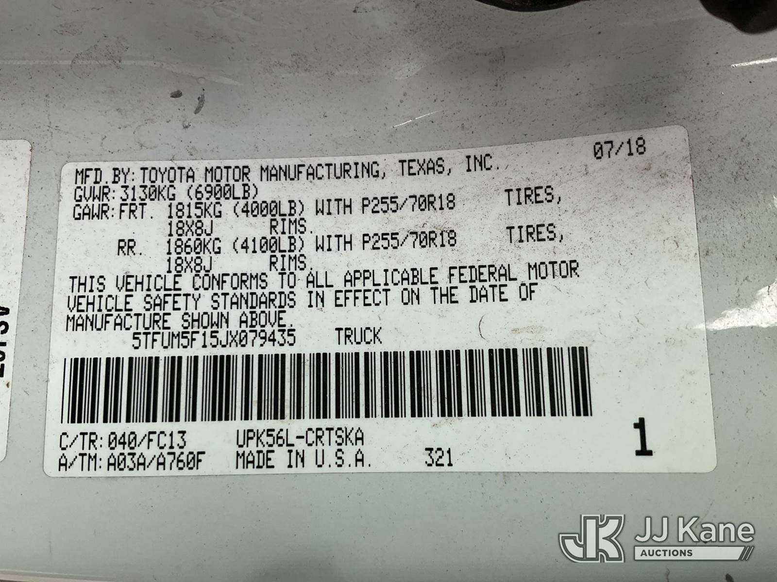 2018 Toyota Tundra SR5 4.6L V8 4WD Crew-Cab Pickup Truck, 4.6L V8 DOHC 32V GAS, 6-Speed Automatic, A/C, with Bed Cover, (225,091 miles) (Runs, Does Not Move - Will Not Shift Out Of Park, Brake Override Malfunction) (ABS Light, Brake Light, Traction Control Light) (Seller States: No brake lights, front end repair, and new tires are needed) (BUYER/TRANSPORTER RESPONSIBLE FOR LOADING WITHOUT ASSISTANCE FROM JJ KANE PERSONNEL) This is a Titled Item NOTE: This unit is being sold AS IS/WHERE IS via Timed Auction and is located in Charlotte, MI. Inspection & preview days for this unit are the 2 business days prior to the first day of items closing for this auction, item is located at 750 Island Hwy Charlotte, MI 48813 and hours of operations are 8a-4p. For pre-sale questions, please contact Corey Cook at (517) 983-0796 or corey.cook@jjkane.com (Buyer is responsible for removal. Assistance by consignor or JJ Kane Auctions is not assured.)