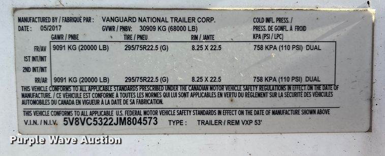 2018 Vanguard REM VXP dry van trailer, VIN: 5V8VC5324JM807491, Unit #: 69419265, Dimensions, Overall, Length: 53', Width: 102", Rear...