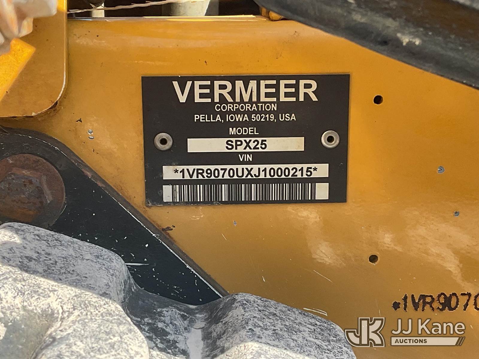 2018 Vermeer Corporation SPX25 Cable Plow, s/n 1VR9070UXJ1000215, gas, Hydrostatic, (Runs, Moves, Operates) NOTE: This unit is being sold AS IS/WHERE IS via Timed Auction and is located in Sandoval, IL. Please call 24 hours in advance to arrange pickup. Mike Munnelly (417) 496-5889. Buyer responsible for loadout and removal of this asset. (Buyer is responsible for removal. Assistance by consignor or JJ Kane Auctions is not assured.)