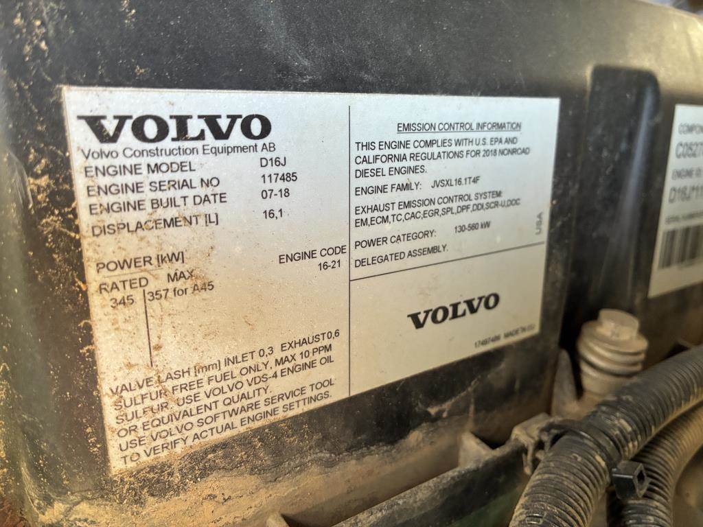 S/N: VCE0A45GT00342573 Volvo D16J 6 Cyl, 3 Gear Shifter, EROPS, AC, Heat, Back up Camera, AM/FM, Tailgate,132"x216" Pneumatic Tires, 29.5R25 Tire Size Meter Reading: 7,356 Disclaimer: Hours and mileage are visually observed and not verified.