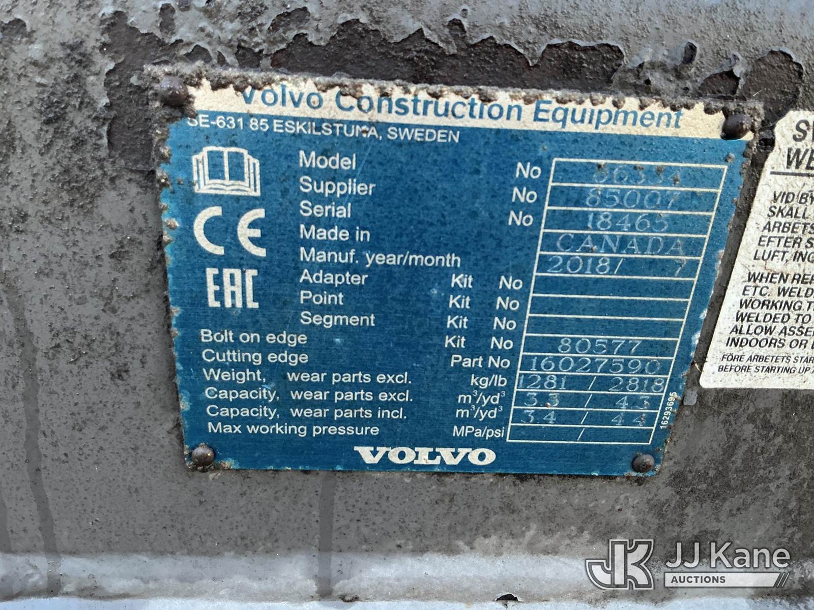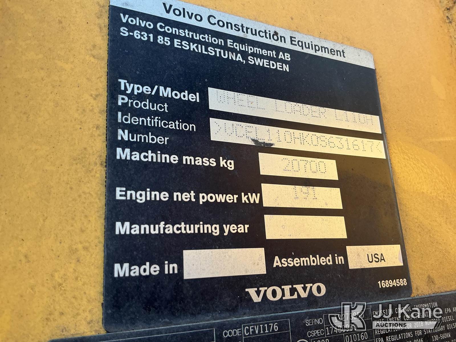 2018 Volvo L110H Articulated Wheel Loader, s/n VCEL110HK0S631617, diesel, powershift, with QC GP loader bucket & EROPS w/A/C, Hillsborough County BOCC Unit (Not Running, Condition Unknown) (Cab Door INOP, Interior Smell) (Seller States: Hydro-locked Engine) (Requires 3rd Party Lift) NOTE: This unit is being sold AS IS/WHERE IS via Timed Auction and is located in Thonotosassa, FL. Inspection & preview days for this unit are the 2 business days prior to the first day of items closing for this auction, item is located at 11720 N US 301 Thonotosassa, Fl 33592 and hours of operations are 8a-4p. For pre-sale questions, please contact Office Staff @ (813) 986-2485. (Buyer is responsible for removal. Assistance by consignor or JJ Kane Auctions is not assured.)