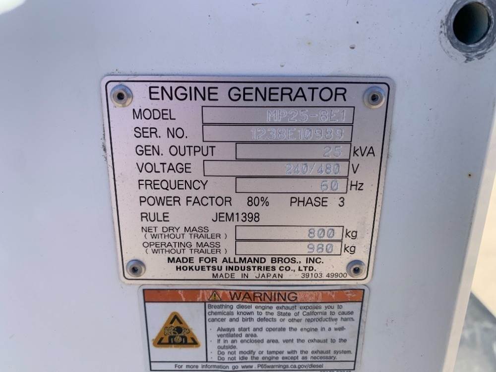 2019 ALLMAND MP25-8E1 GENERATOR, 20kw, Isuzu diesel, portable, 1,756 hours indicated. s/n:1238E10989