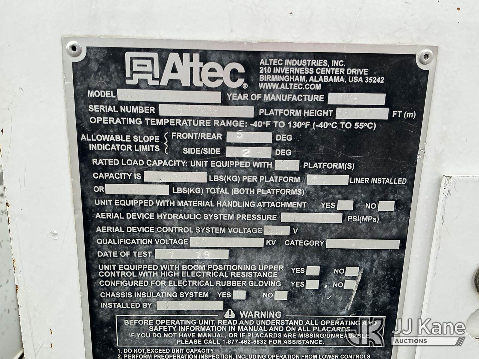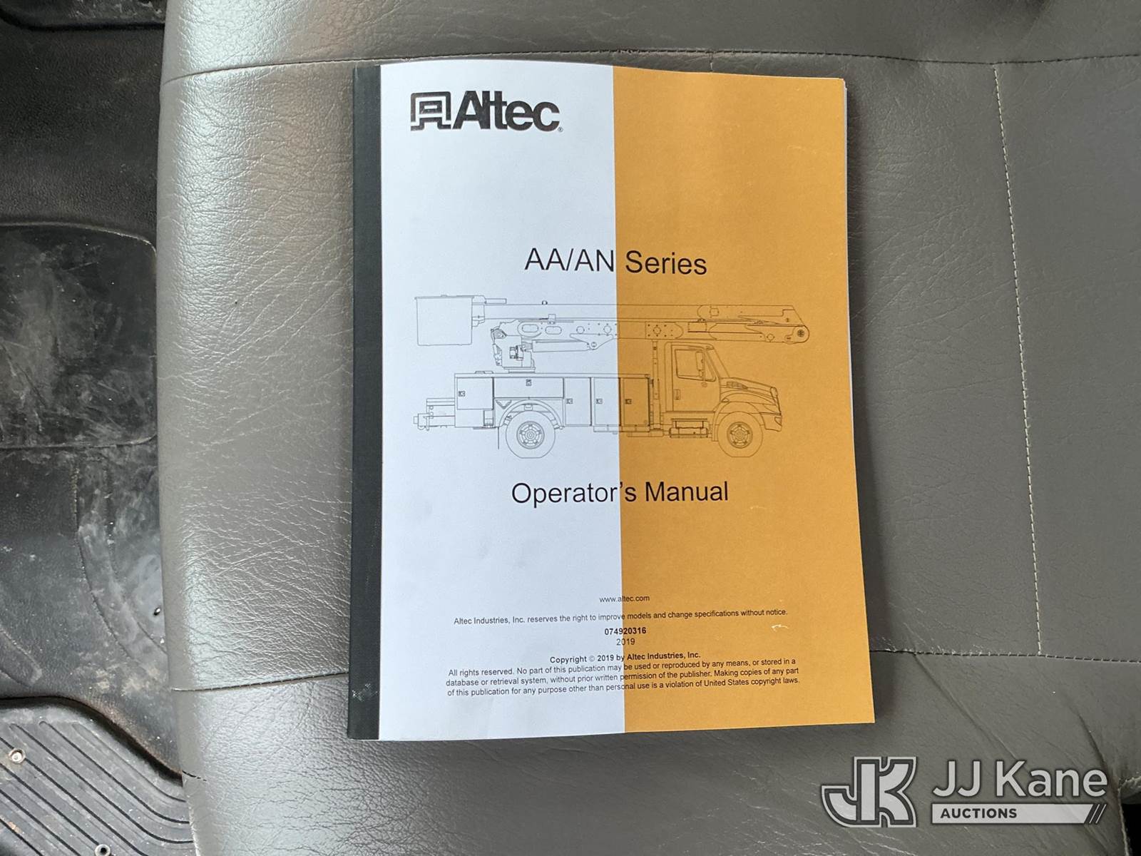 Altec AA55-MH, 60 ft, Material Handling Bucket Truck s/n 1218FH7236, with two-man bucket & 4 hyd outriggers, rear mounted on 2019 Freightliner M2 106 4x4 Utility Truck, Cummins 6.7L diesel, Auto, A/C, with front winch, (36,137 miles) (Runs, Moves & Upper Operates ) This is a Titled Item NOTE: This unit is being sold AS IS/WHERE IS via Timed Auction and is located in China Grove, NC. For more information & removal arrangements please contact Office Staff @ 704-674-1113 (Manuals provided in cab) (Buyer is responsible for removal. Assistance by consignor or JJ Kane Auctions is not assured.)