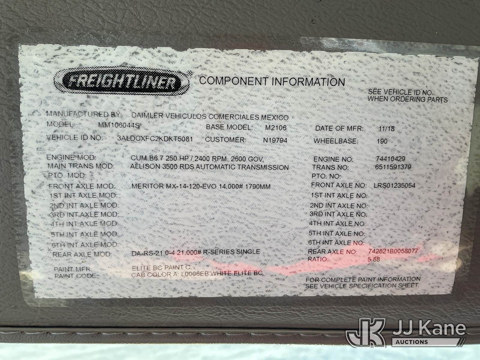 Altec AA55-MH, 60 ft, Material Handling Bucket Truck s/n 0119FH7427, with two man bucket & 4 hyd outriggers, rear mounted on 2019 Freightliner M2 106 4x4 Utility Truck, Cummins 6.7L diesel, Auto, A/C, with front winch , (48,465 miles) (Runs, Moves & Upper Operates ) This is a Titled Item NOTE: This unit is being sold AS IS/WHERE IS via Timed Auction and is located in China Grove, NC. (Manuals provided in cab) (Buyer is responsible for removal. Assistance by consignor or JJ Kane Auctions is not assured.)