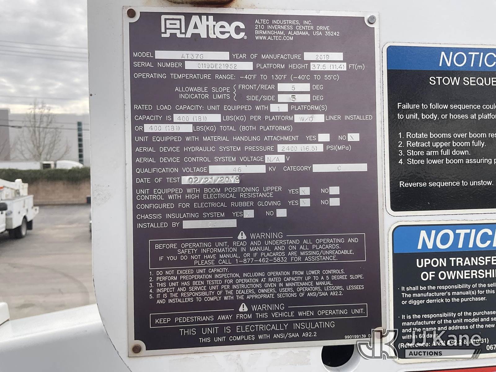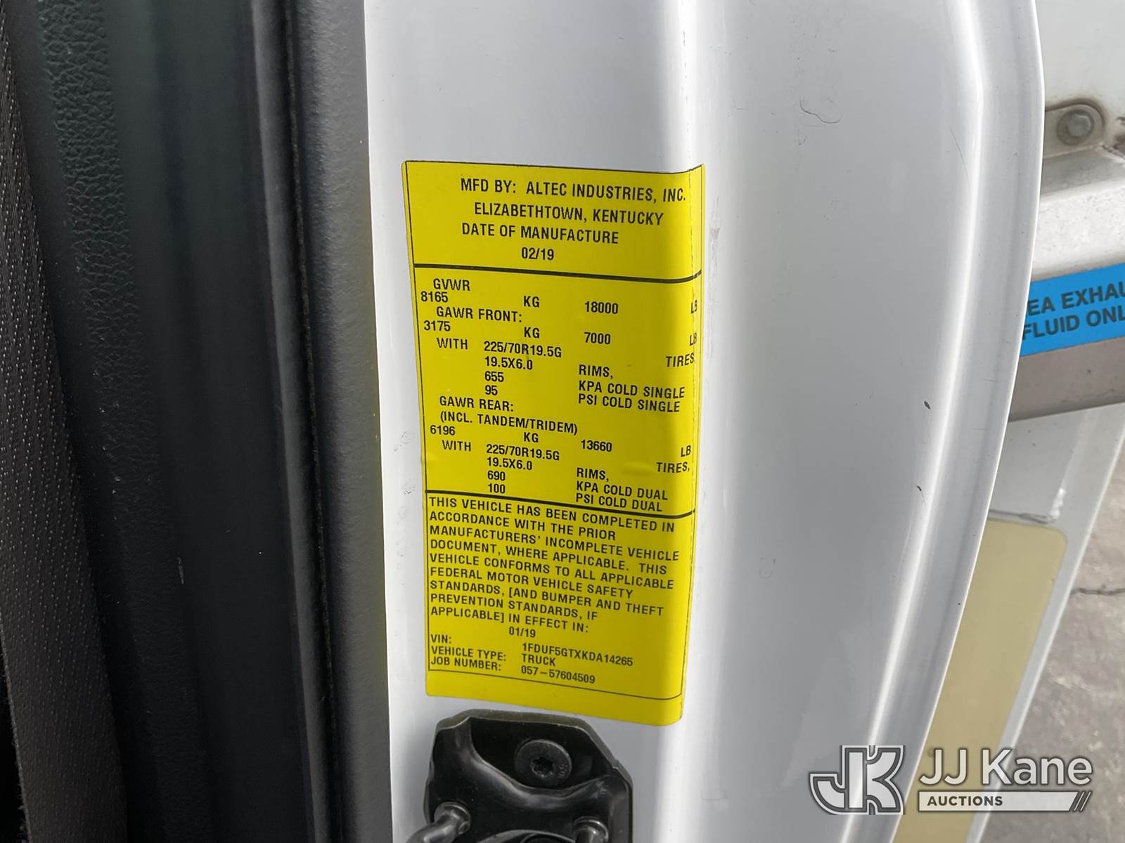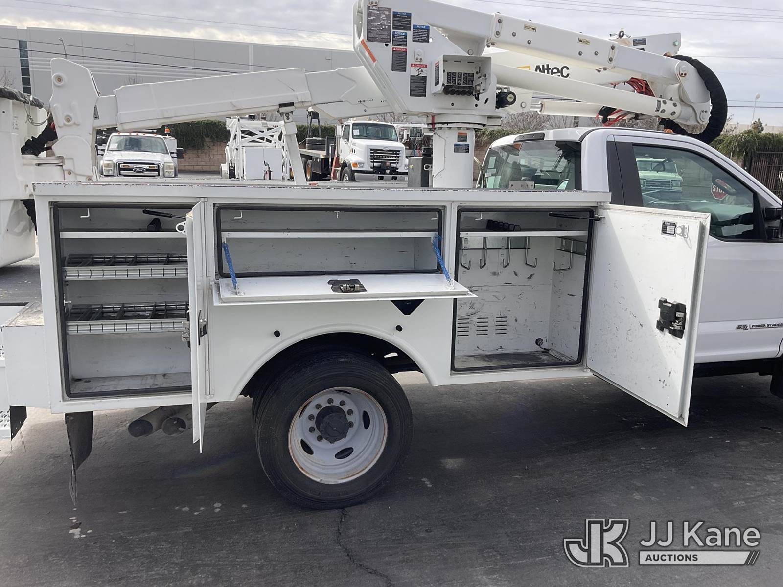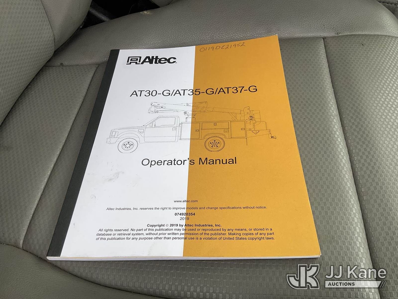 Altec AT37G, 42 ft, Articulating & Telescopic Bucket Truck s/n 0119DE21952, with Single-Man Bucket, mounted behind cab on 2019 Ford F-550 Service Truck, 6.7L Diesel Auto, A/C, (128,991 miles) (Runs, Moves & Operates The manufacturer has notified JJ Kane that this equipment is subject to an open recall. CSN 855 Fuel Line and Brake Line Inspection The equipment should not be operated until this is addressed. Buyer is responsible for reviewing the recall notice and contacting the manufacturer to schedule the recommended corrective actions. Associated costs may be covered by the manufacturer in some cases.) (Reads 5,991 hours) May be subject to ARB Regulations This is a Titled Item NOTE: This unit is being sold AS IS/WHERE IS via Timed Auction and is located in Jurupa Valley, CA. Inspection & preview days for this unit are the 2 business days prior to the first day of items closing for this auction, item is located at 4510 Muth Way Jurupa Valley, CA 92509 and hours of operations are 8a-4p. For pre-sale questions, please contact please contact Office Staff @ (310) 353-7140. Dealer License Number 45696. (Missing manuals, See Auction Company for Manufacturers Information to obtain manuals) (Buyer is responsible for removal. Assistance by consignor or JJ Kane Auctions is not assured.)