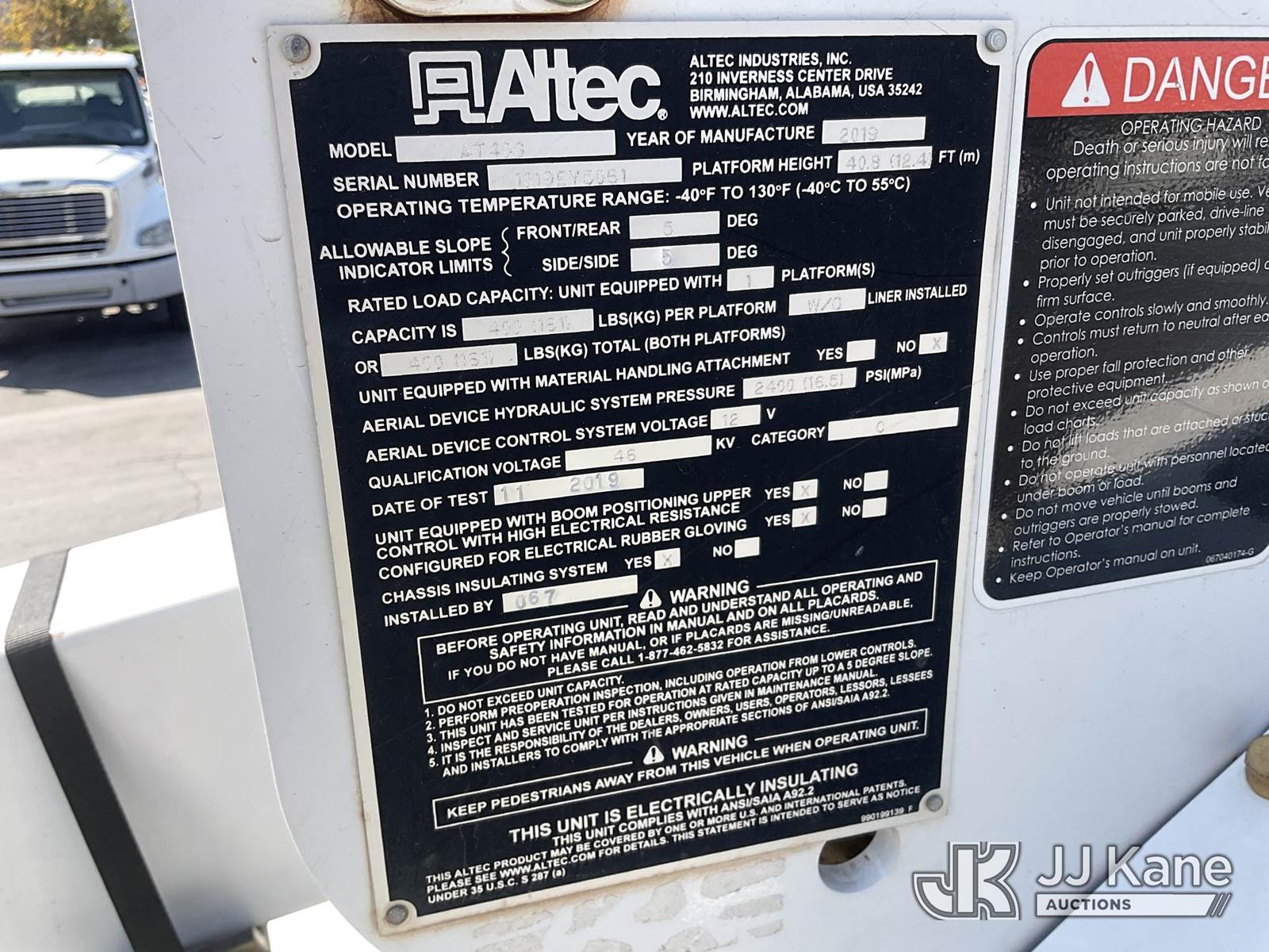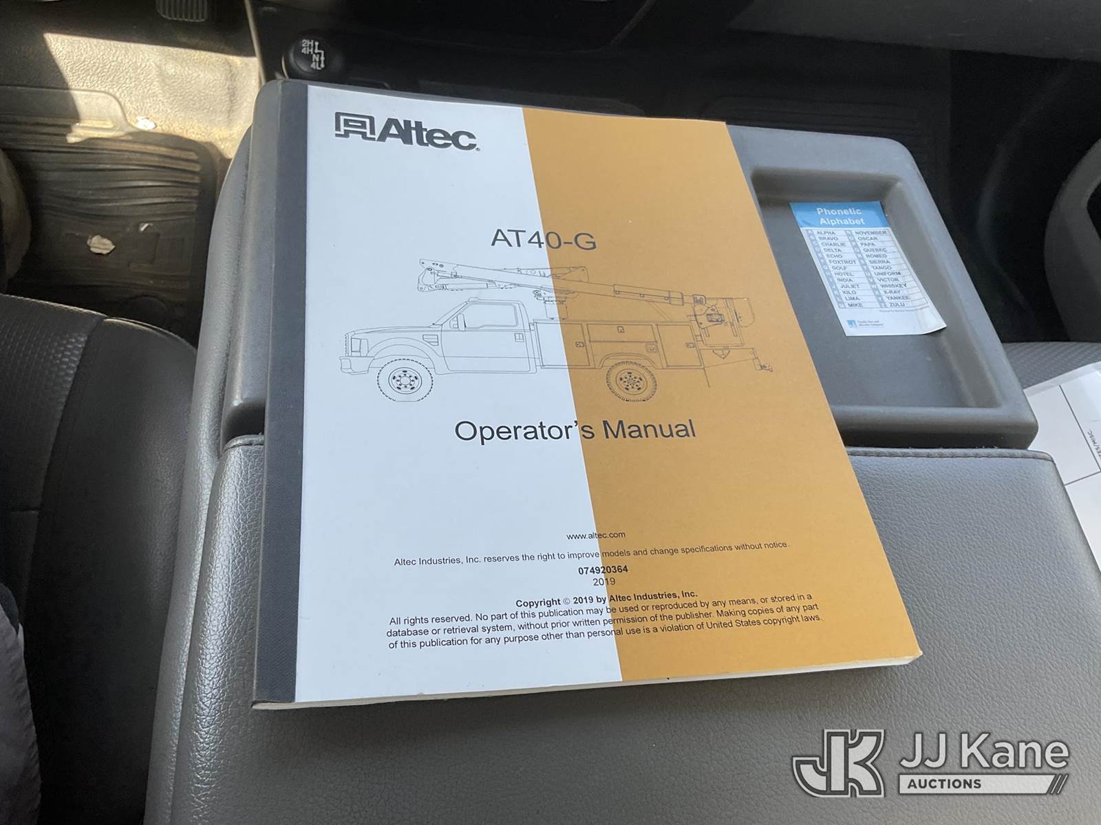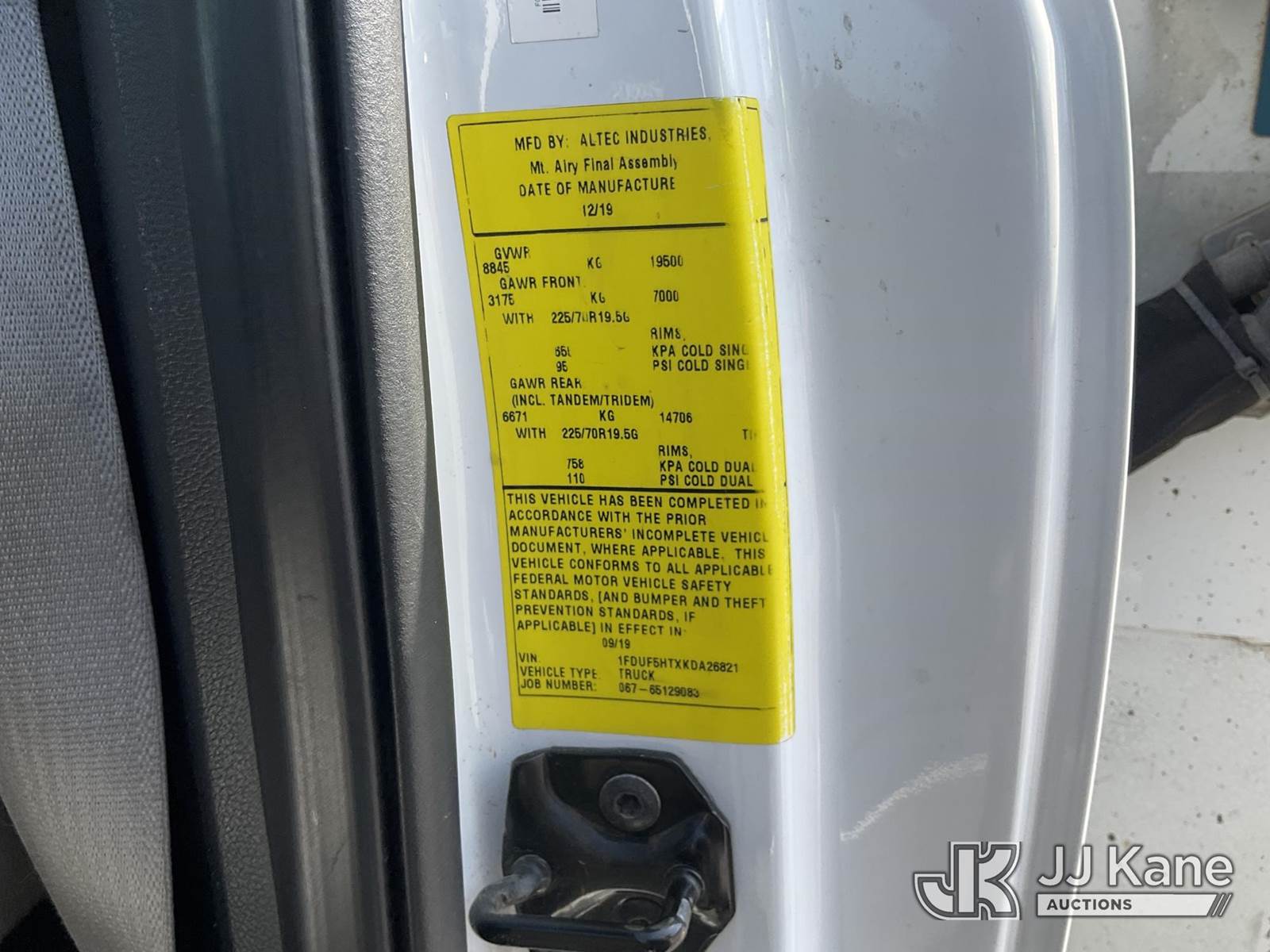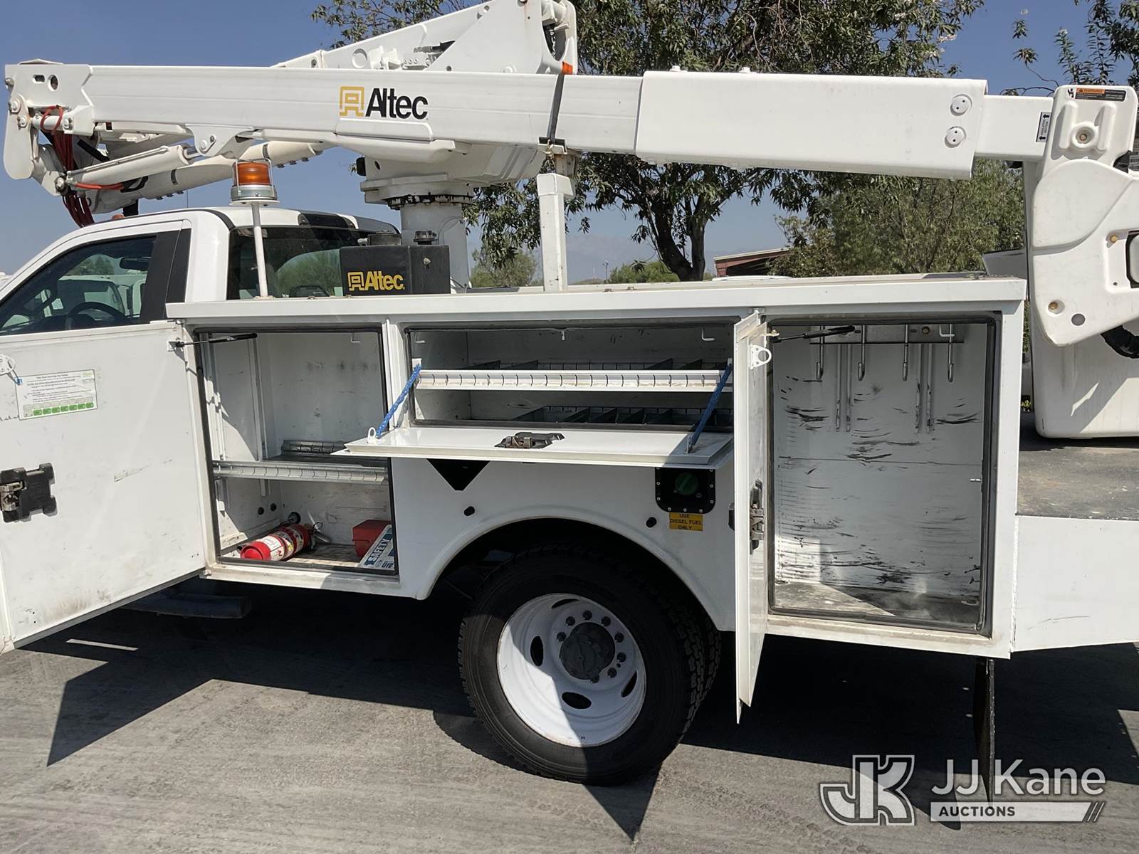Altec AT40G, 45 ft, Articulating & Telescopic Bucket s/n 1019EY5061, with single man bucket, mounted behind cab on 2019 Ford F-550 Regular Cab DRW 4WD Service Truck, 6.7L V8 OHV 16V DIESEL Auto, A/C, with tow package, (111,922 miles) (Runs, Moves, & Upper Operates) May be subject to ARB Regulations This is a Titled Item NOTE: This unit is being sold AS IS/WHERE IS via Timed Auction and is located in Jurupa Valley, CA. Inspection & preview days for this unit are the 2 business days prior to the first day of items closing for this auction, item is located at 4510 Muth Way Jurupa Valley, CA 92509 and hours of operations are 8a-4p. For pre-sale questions, please contact please contact Office Staff @ (310) 353-7140. Dealer License Number 45696. (Manuals provided in cab) (Buyer is responsible for removal. Assistance by consignor or JJ Kane Auctioneers is not assured.)