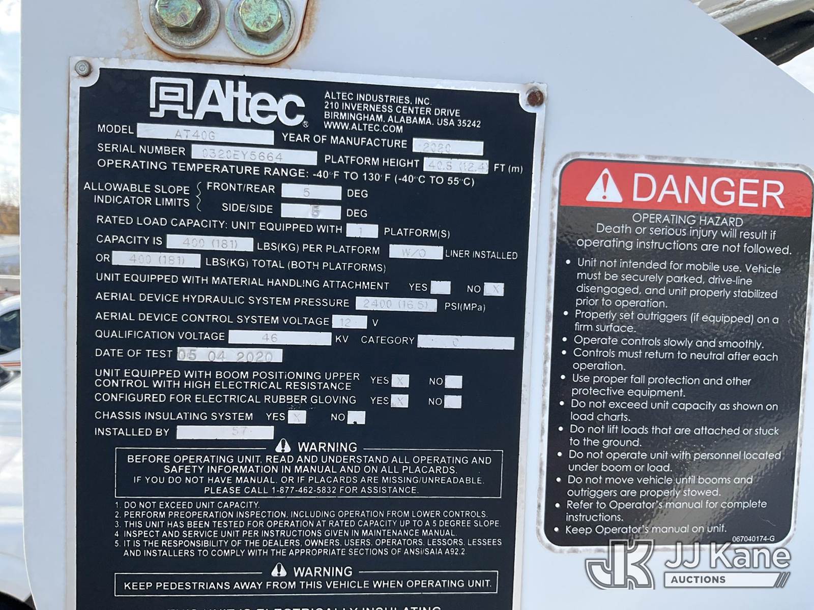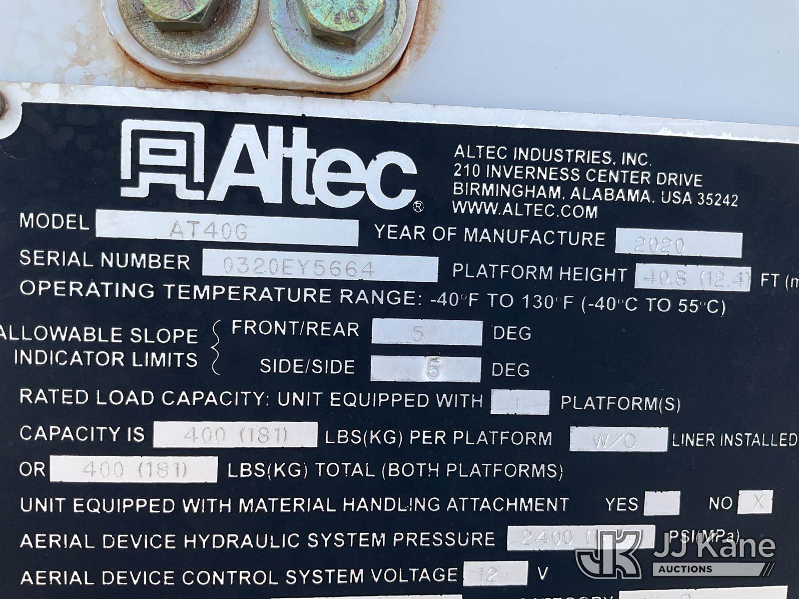 Altec AT40G, 45 ft, Articulating & Telescopic Bucket Truck s/n 0320EY5664, with single-man bucket, mounted behind cab on 2019 Ford F550 Service Truck, 6.7L V8 OHV 16V DIESEL Auto, RWD, A/C, (131,233 miles) (Runs, Moves & Upper Operates) (Reads 6,219 hours) This is a Titled Item NOTE: This unit is being sold AS IS/WHERE IS via Timed Auction and is located in Conway, AR. For more information contact Daniel Flannery @ 816-294-8182. (Manuals provided in cab) (Buyer is responsible for removal. Assistance by consignor or JJ Kane Auctioneers is not assured.)