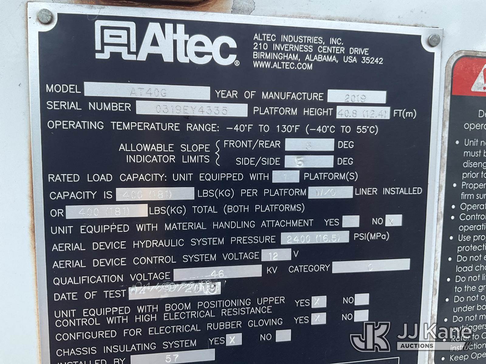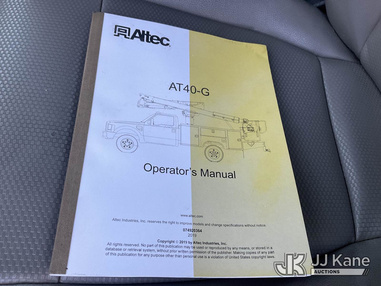Altec AT40G, 45 ft, Articulating & Telescopic Bucket Truck s/n 0319EY4335, with single-man bucket, mounted behind cab on 2019 Ford F550 Service Truck, 6.7L, diesel, Auto, A/C, (147,154 miles) (Runs & Moves) (Jump To Start, Upper Condition Unknown, PTO Does Not Engage, Check Engine Light On) (Seller States: The Engine Is Blown And Recommends The Aftertreatment System Be Replaced) This is a Titled Item NOTE: This unit is being sold AS IS/WHERE IS via Timed Auction and is located in China Grove, NC. Inspection & preview days for this unit are the 2 business days prior to the first day of items closing for this auction, item is located at 820 E NC Hwy 152 China Grove, NC 28023 and hours of operations are 8a-4p. For pre-sale questions, please contact Office Staff @ (704) 674-1113. (Manuals provided in cab) (Buyer is responsible for removal. Assistance by consignor or JJ Kane Auctions is not assured.)