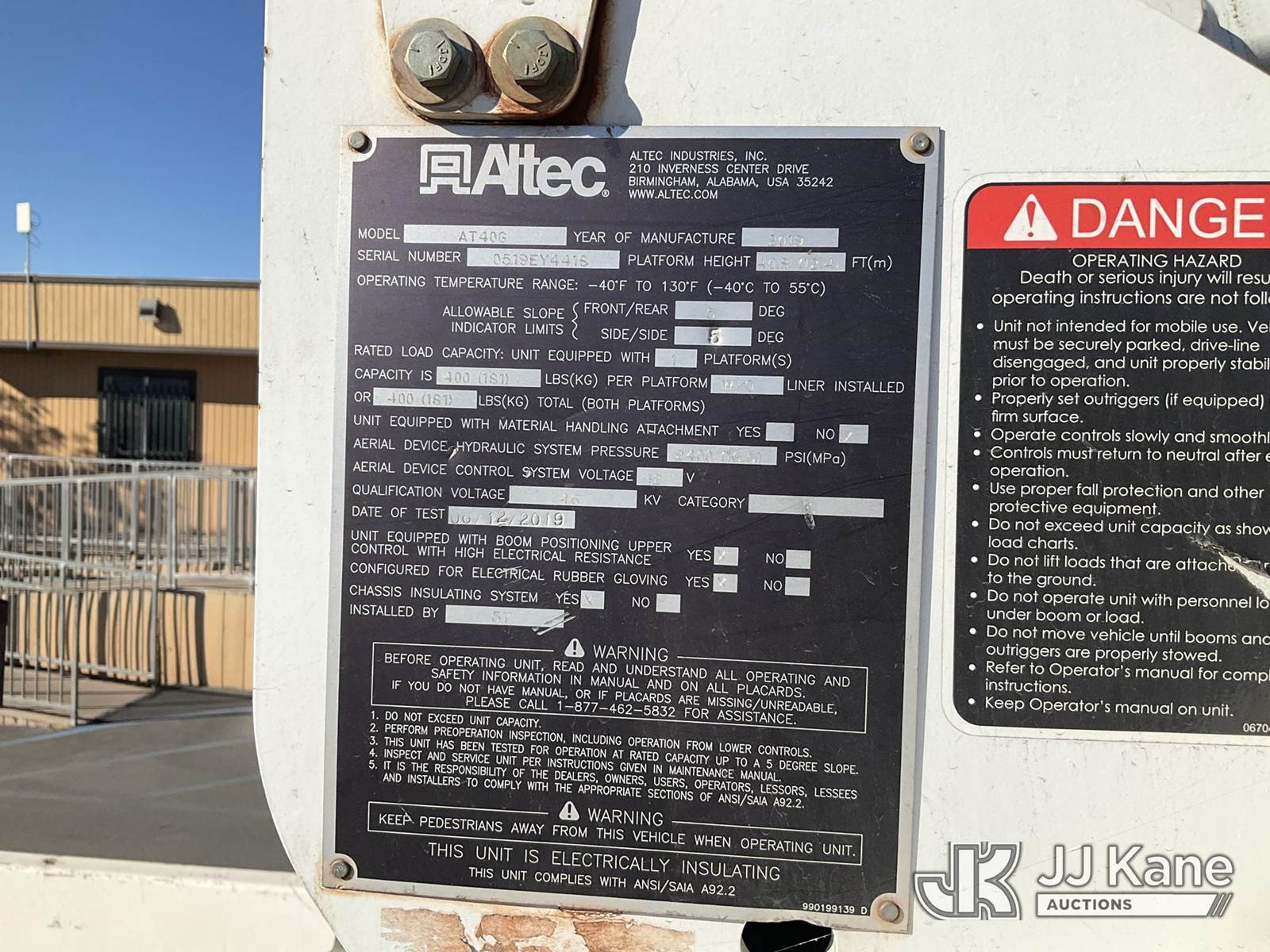 Altec AT40G, 45 ft, Articulating & Telescopic Bucket Truck s/n 0519EY4418, with single man bucket, mounted behind cab on 2019 Ford F-550 Service Truck, 6.7L Diesel Auto, 4wd, with Tow Package, , (207,432 miles) (Runs, Moves, & Upper Operates) (Check Engine Light On, The manufacturer has notified JJ Kane that this equipment is subject to an open recall (CSN 855 - Fuel Line and Brake Line Inspection). The equipment should not be operated until this is addressed. Buyer is responsible for reviewing the recall notice and contacting the manufacturer to schedule the recommended corrective actions. Associated costs may be covered by the manufacturer in some cases.) (Bidding Restricted to Licensed Vehicle Dealers Only), May be subject to ARB Regulations This is a Titled Item NOTE: This unit is being sold AS IS/WHERE IS via Timed Auction and is located in Jurupa Valley, CA. Inspection & preview days for this unit are the 2 business days prior to the first day of items closing for this auction, item is located at 4510 Muth Way Jurupa Valley, CA 92509 and hours of operations are 8a-4p. For pre-sale questions, please contact please contact Office Staff @ (310) 353-7140. Dealer License Number 45696. (Missing manuals, See Auction Company for Manufacturers Information to obtain manuals) (Buyer is responsible for removal. Assistance by consignor or JJ Kane Auctions is not assured.)