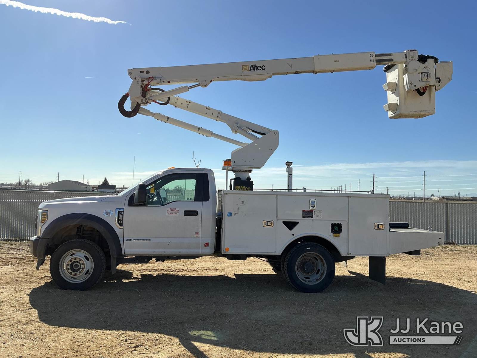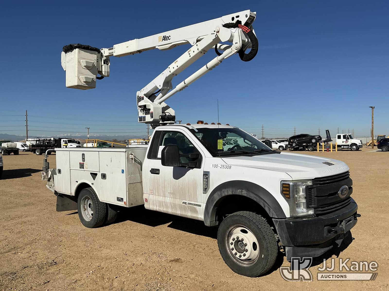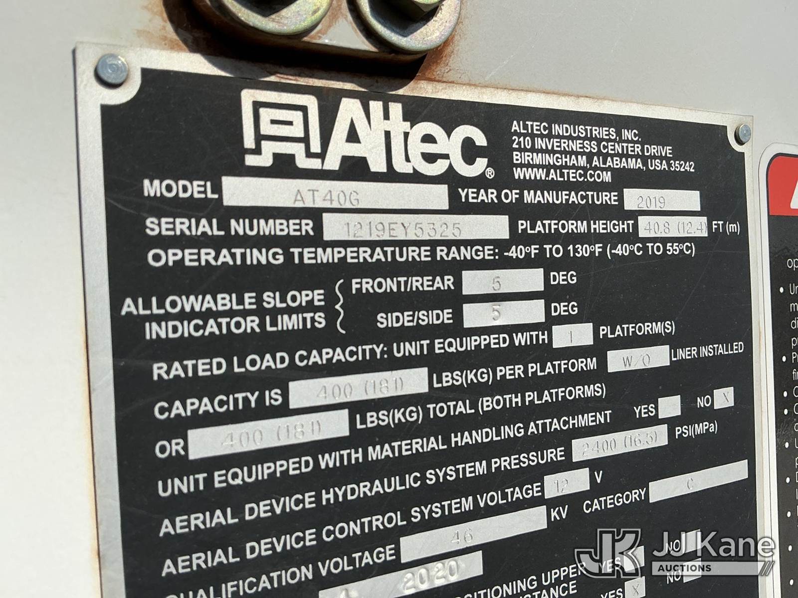 Altec AT40G, 45 ft, Articulating & Telescopic Bucket Truck s/n 1219EY5325, with single man bucket, mounted behind cab on 2019 Ford F-550 Service Truck, 6.7L diesel, 4wd, Auto, A/C, (56,750 miles) (Runs, Moves & Upper Operates) (Check Engine Light On) (No Emissions Provided, See Bidder Agreement) (Reads 5,116 hours) This is a Titled Item NOTE: This unit is being sold AS IS/WHERE IS via Timed Auction and is located in Fort Lupton, CO. Inspection & preview days for this unit are the 2 business days prior to the first day of items closing for this auction, item is located at 2105 Northland Dr Fort Lupton, CO 80621 and hours of operations are 8a-4p. For pre-sale questions, please contact Dakota Hoffman @ (720) 621-0786. Dealer License Number 47109. (Manuals provided in cab) (Buyer is responsible for removal. Assistance by consignor or JJ Kane Auctions is not assured.)