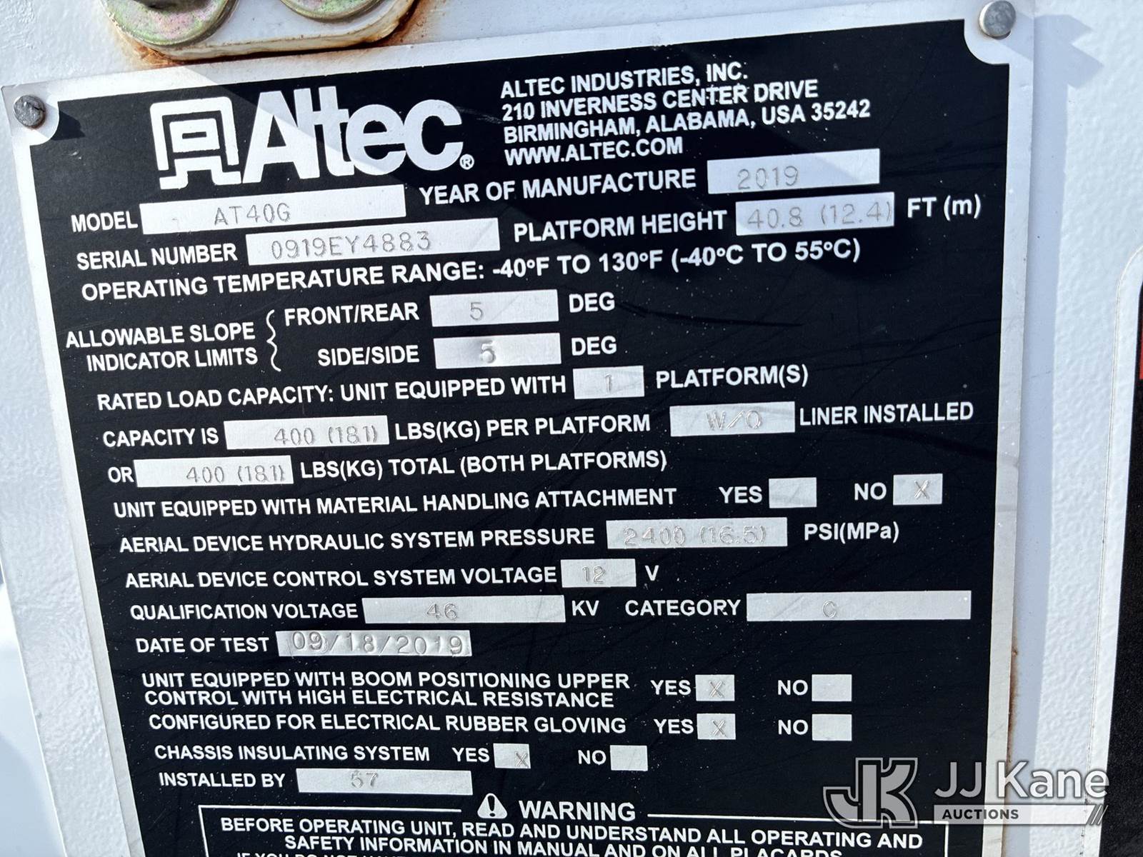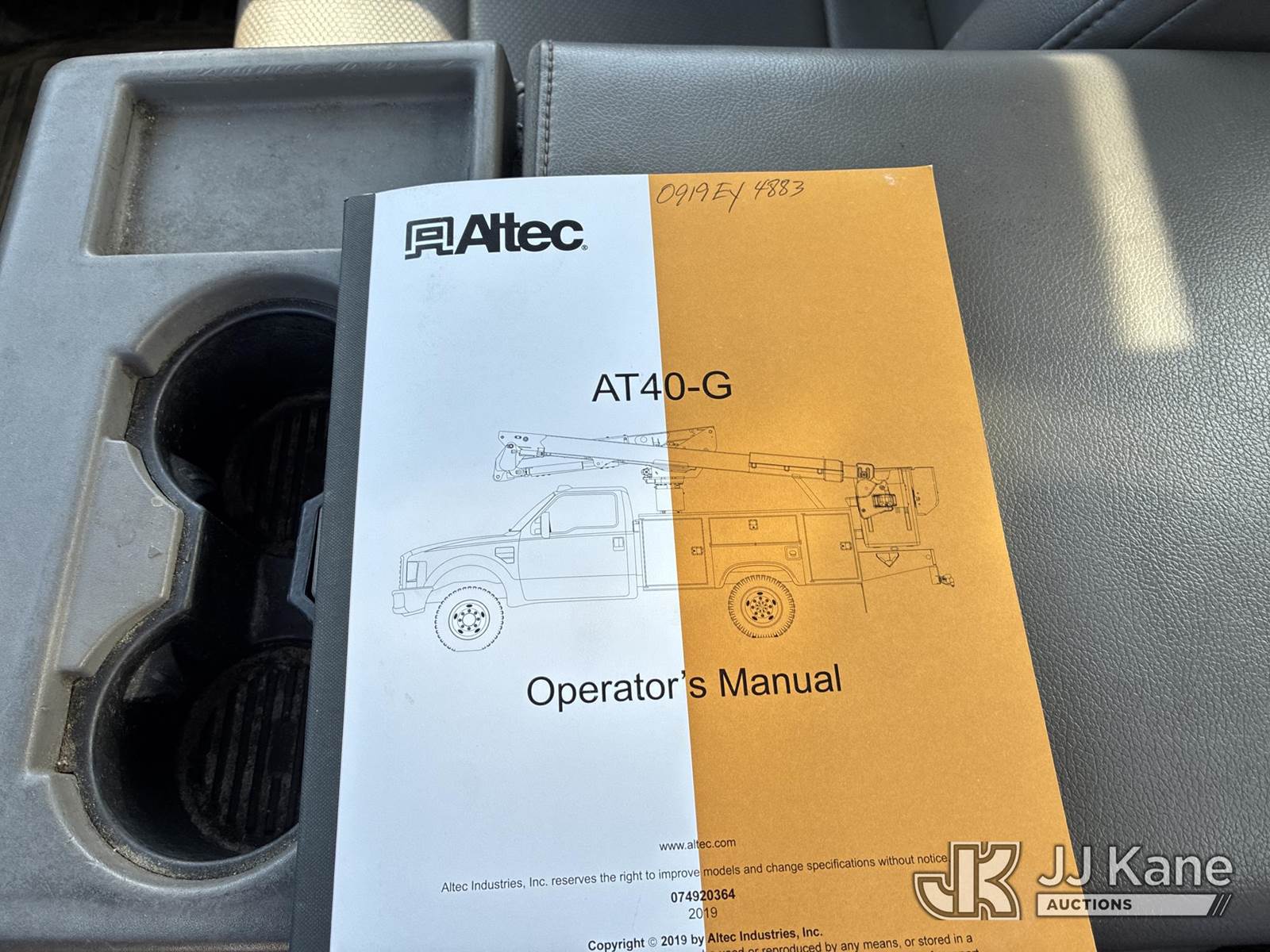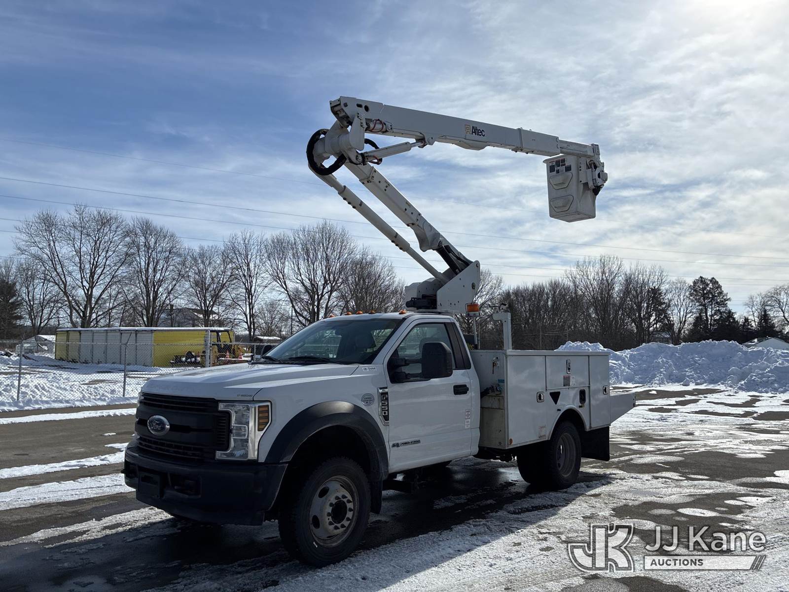 Altec AT40G, 45 ft, Articulating & Telescopic Bucket Truck s/n 0919EY4883, with single-man bucket, mounted behind cab on 2019 Ford F-550 Regular Cab DRW 2WD Service Truck, 6.7L V8 OHV 16V DIESEL RWD, Auto, A/C, (124,646 miles) (Runs, Moves, & Operates)(Body Damage) (Reads 10,231 hours) This is a Titled Item NOTE: This unit is being sold AS IS/WHERE IS via Timed Auction and is located in Ashland, OH. For more information & removal arrangements, please contact Jimmy Sanders @ (567) 474-5162, jimmy.sanders@jjkane.com. Load out by appointment only, Buyer/Hauler must present copy of paid invoice upon arrival. Purchaser acknowledges ALL lots must be removed within (10) Calendar days of Auction, or a storage fee may be incurred. For load-out and pick-up information, please reference the hauler sheet sent out after purchase. (Missing manuals, See Auction Company for Manufacturers Information to obtain manuals) (Buyer is responsible for removal. Assistance by consignor or JJ Kane Auctions is not assured.)