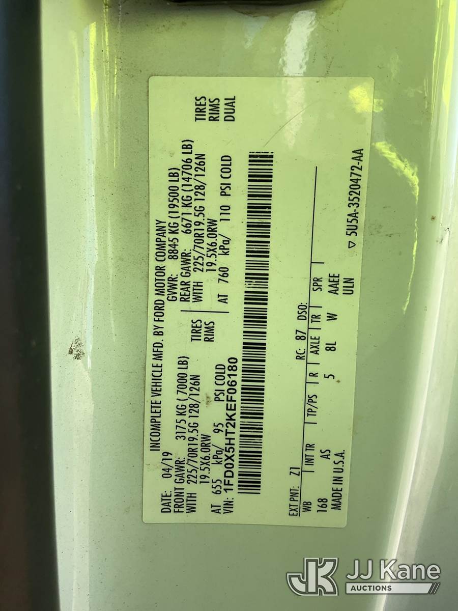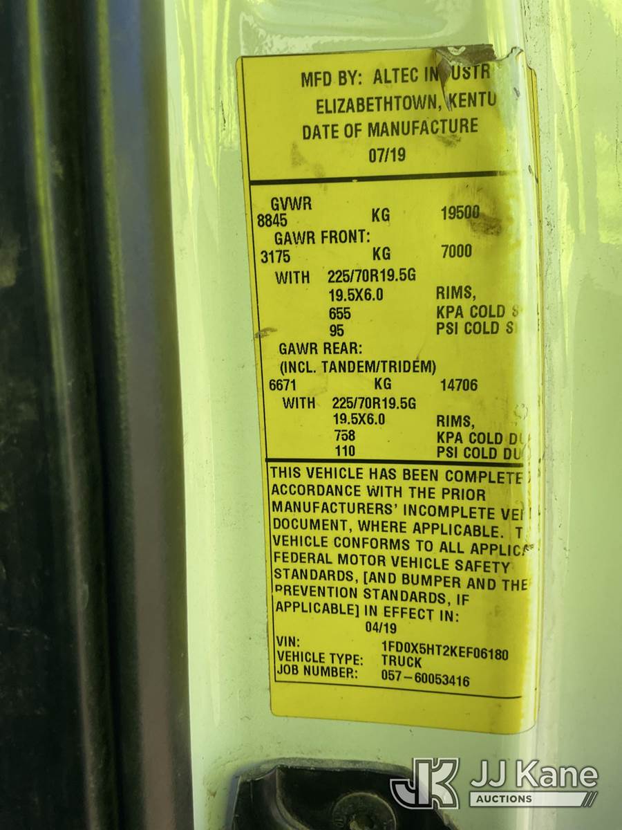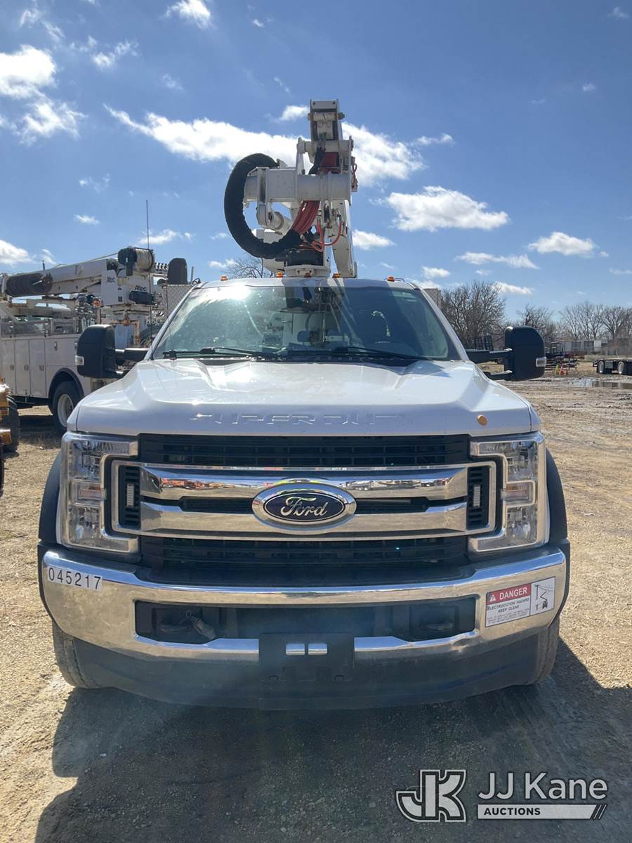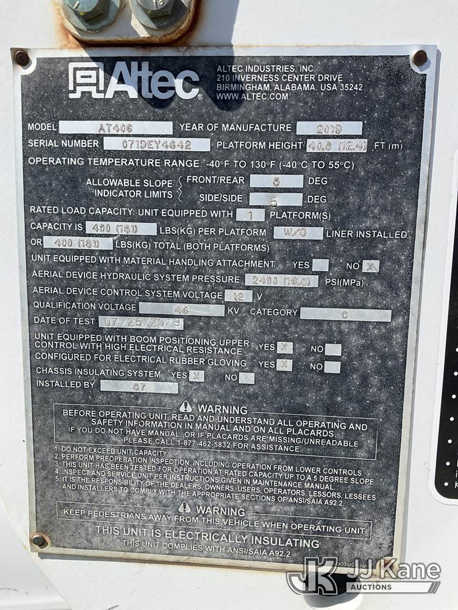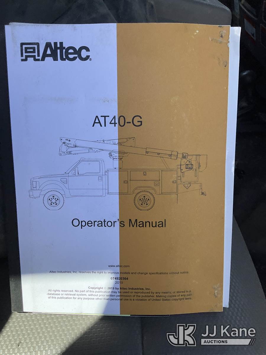 Altec AT40G, 45 ft, Articulating & Telescopic Bucket Truck s/n 0719EY4642, with single-man bucket, mounted behind cab on 2019 Ford F-550 Extended-Cab Service Truck, 6.7L diesel, 4WD, Auto, A/C, (181,658 miles) (Not Running, Condition Unknown, Cranks, Check Engine Light On, ABS Light On, Traction Control Light On)(Seller States-Bad Motor) (Reads 9,823 hours) This is a Titled Item NOTE: This unit is being sold AS IS/WHERE IS via Timed Auction and is located in South Beloit, IL. Inspection & preview days for this unit are the 2 business days prior to the first day of items closing for this auction, item is located at 14354 Dearborn Ave South Beloit, IL and hours of operations are 8a-4p. For pre-sale questions, please contact Derek Eklund at (608) 904-0618 or (derek.eklund@jjkane.com). (Manuals provided in cab) (Buyer is responsible for removal. Assistance by consignor or JJ Kane Auctions is not assured.)