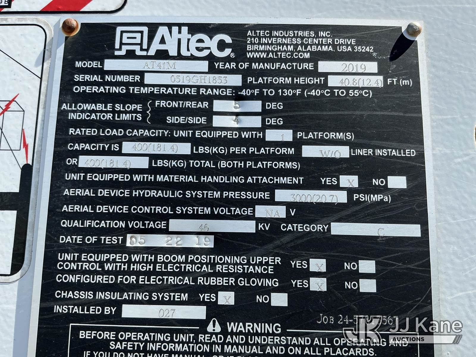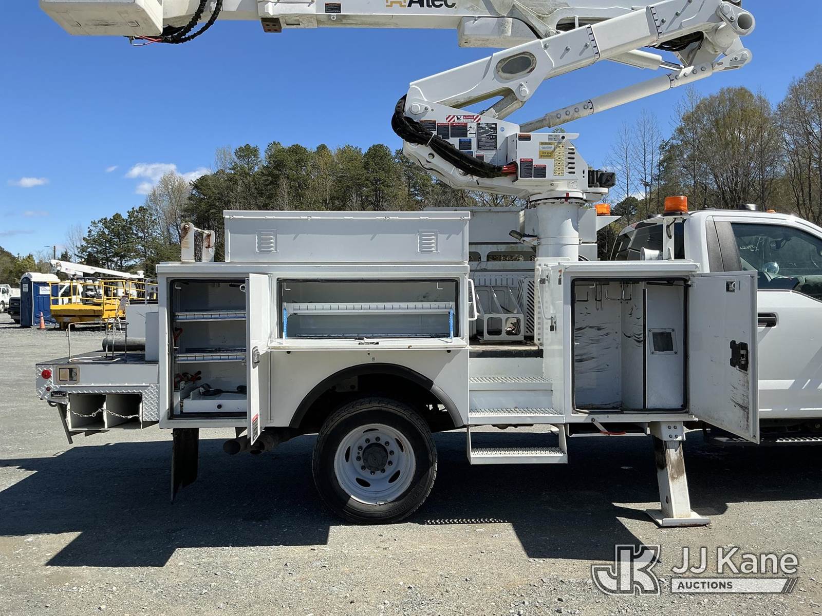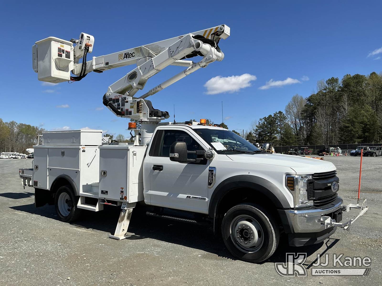 Altec AT41-MH, 46 ft, Articulating & Telescopic Material Handling Bucket Truck s/n 0519GH1853, with single-man bucket, mounted behind cab on 2019 Ford F550 4x4 Service Truck, 6.7L diesel, Auto, A/C, (48,797 miles) (Duke Unit) (Runs, Moves & Upper Operates ) This is a Titled Item NOTE: This unit is being sold AS IS/WHERE IS via Timed Auction and is located in China Grove, NC. Inspection & preview days for this unit are the 2 business days prior to the first day of items closing for this auction, item is located at 820 E NC Hwy 152 China Grove, NC 28023 and hours of operations are 8a-4p. For pre-sale questions, please contact Office Staff @ (704) 674-1113. (Manuals provided in cab) (Buyer is responsible for removal. Assistance by consignor or JJ Kane Auctions is not assured.)