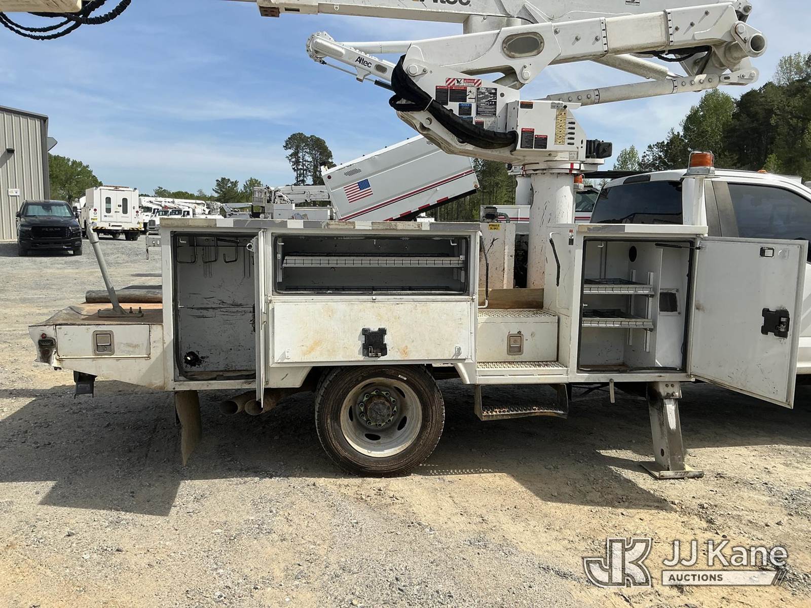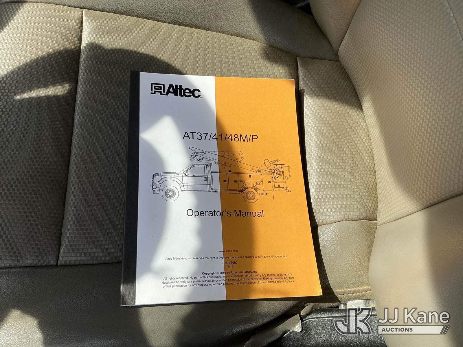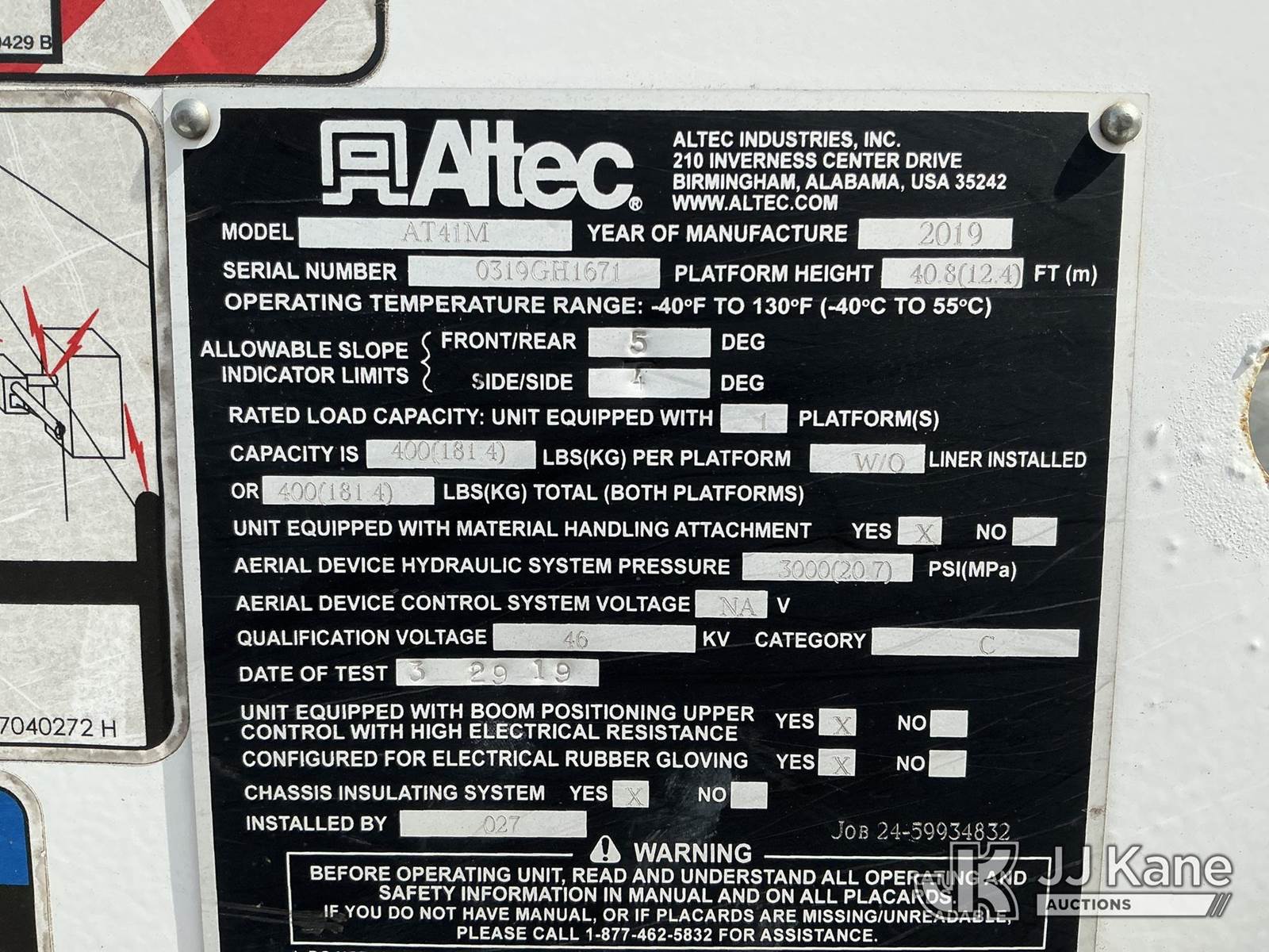 Altec AT41-MH, 46 ft, Articulating & Telescopic Material Handling Bucket Truck s/n 0319GH1671, with single man bucket , mounted behind cab on 2019 Ford F-550 4X4 Service Truck, 6.7L diesel, Auto, A/C, (98,751 miles) (Runs, Moves & Upper Operates) ( The manufacturer has notified JJ Kane that this equipment is subject to an open recall. CSN 855 Fuel Line and Brake Line Inspection The equipment should not be operated until this is addressed. Buyer is responsible for reviewing the recall notice and contacting the manufacturer to schedule the recommended corrective actions. Associated costs may be covered by the manufacturer in some cases.) This is a Titled Item NOTE: This unit is being sold AS IS/WHERE IS via Timed Auction and is located in China Grove, NC. Inspection & preview days for this unit are the 2 business days prior to the first day of items closing for this auction, item is located at 820 E NC Hwy 152 China Grove, NC 28023 and hours of operations are 8a-4p. For pre-sale questions, please contact Office Staff @ (704) 674-1113. (Manuals provided in cab) (Buyer is responsible for removal. Assistance by consignor or JJ Kane Auctions is not assured.)