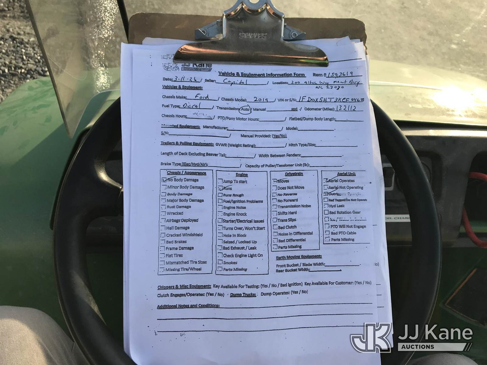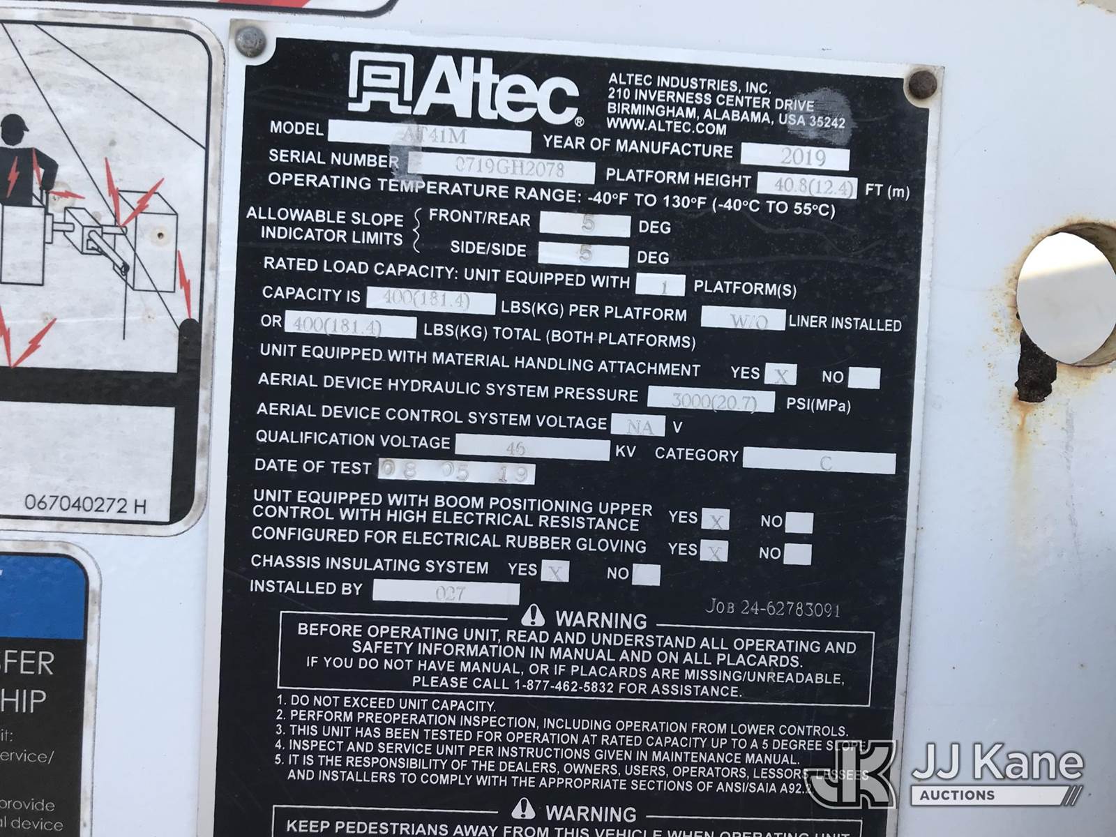 Altec AT41M, 46 ft, Articulating & Telescopic Material Handling Bucket Truck s/n 0719GH2078, with single-man bucket, mounted behind cab on 2019 Ford F550 4x4 Service Truck, 6.7L V8 OHV 16V DIESEL, Auto, A/C, (132,112 miles) (Runs, Moves & Upper Operates) This is a Titled Item NOTE: This unit is being sold AS IS/WHERE IS via Timed Auction and is located in Mount Airy, NC. Inspection & preview days for this unit are by appointment only; please contact us at contact@jjkane.com or 84-Go-JJKane for more details. (Missing manuals, See Auction Company for Manufacturers Information to obtain manuals) (Buyer is responsible for removal. Assistance by consignor or JJ Kane Auctions is not assured.)